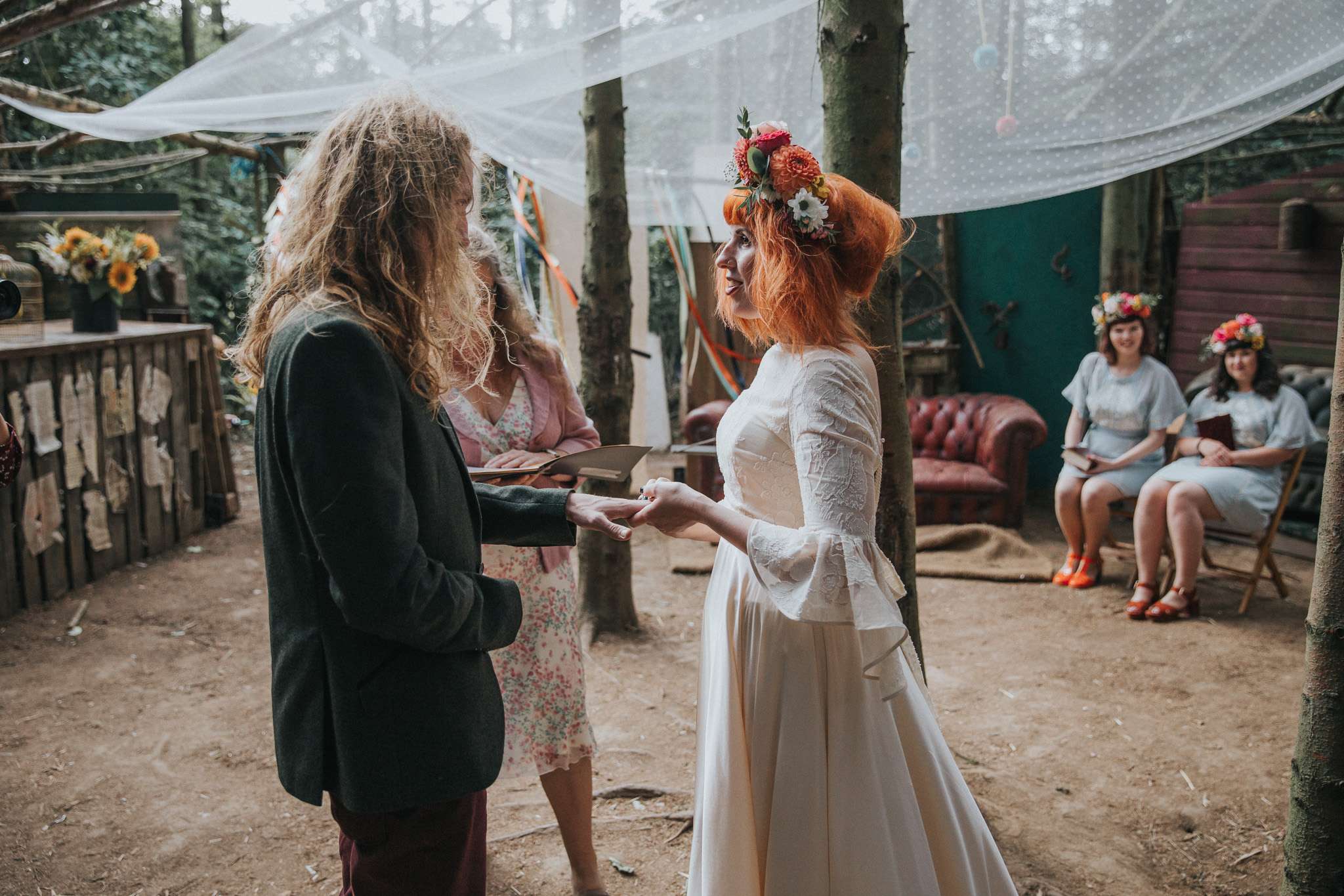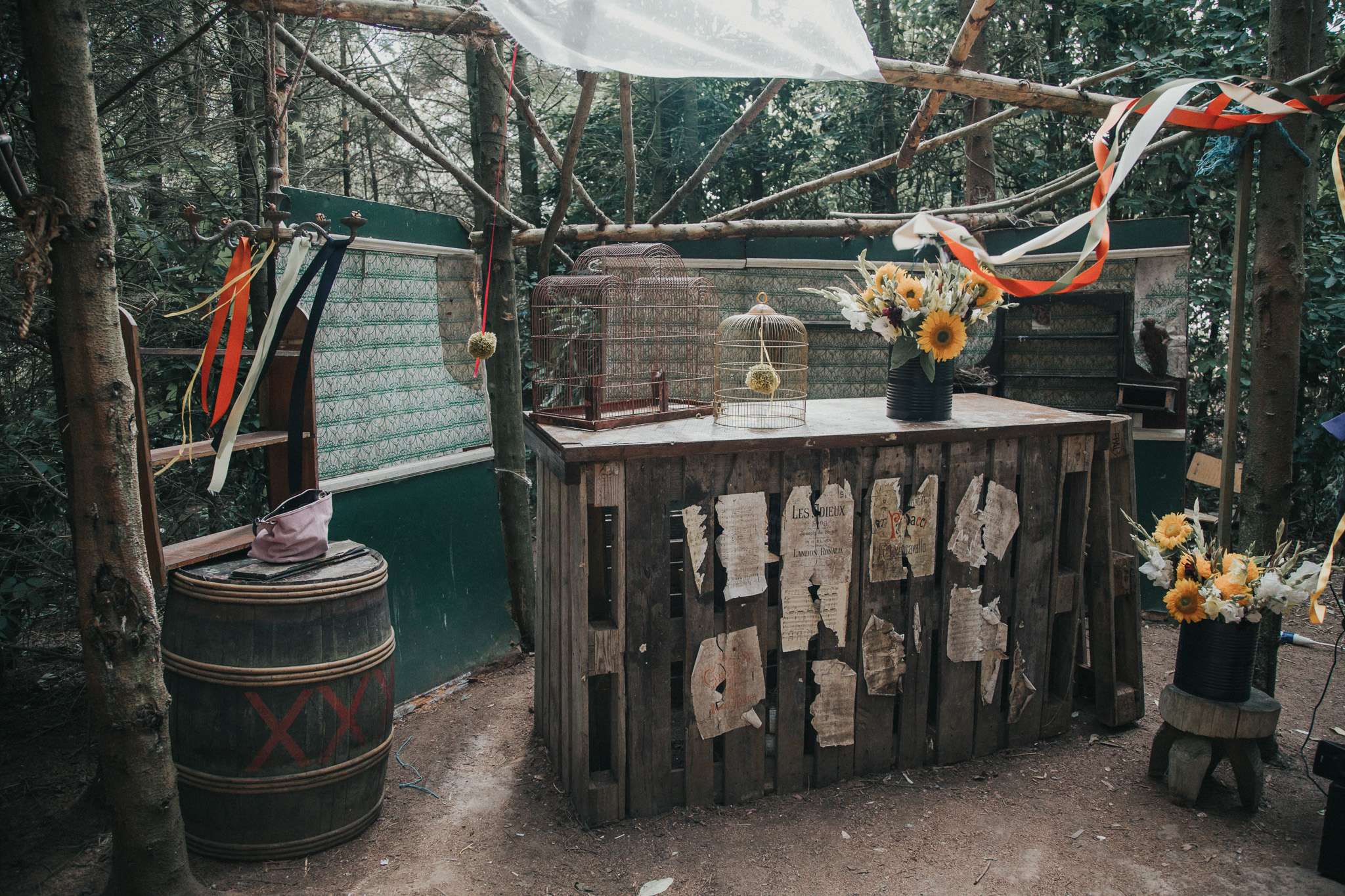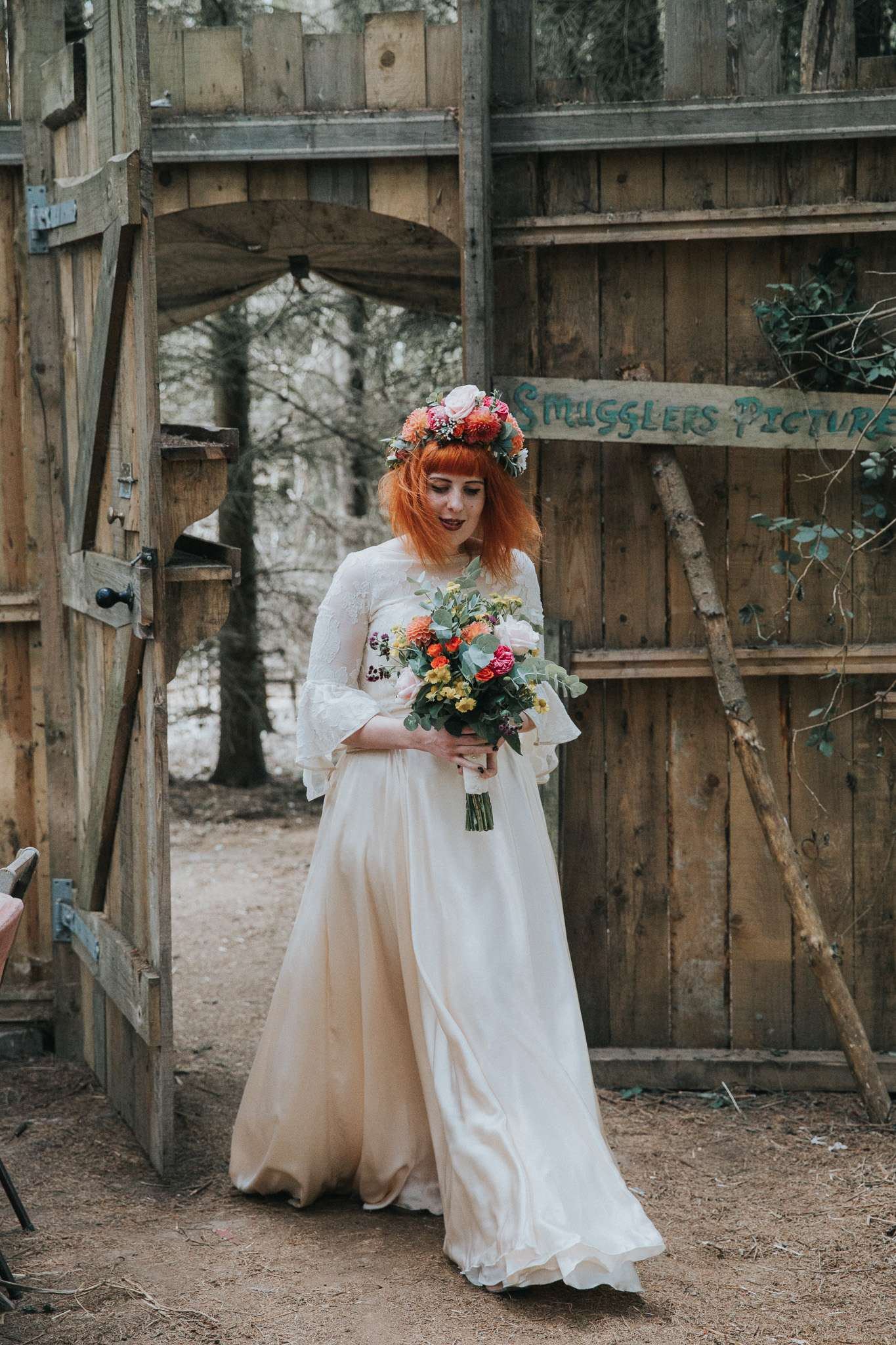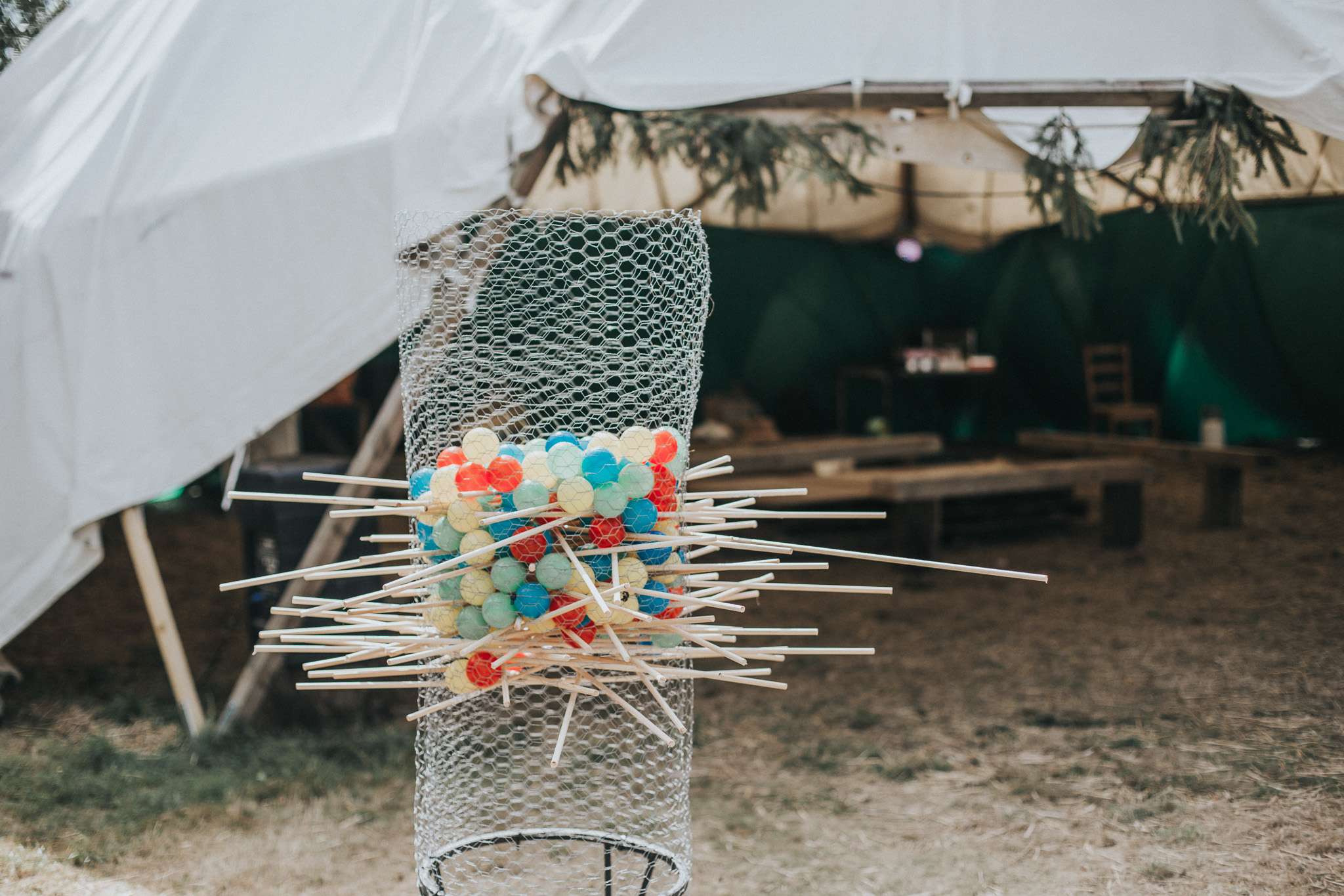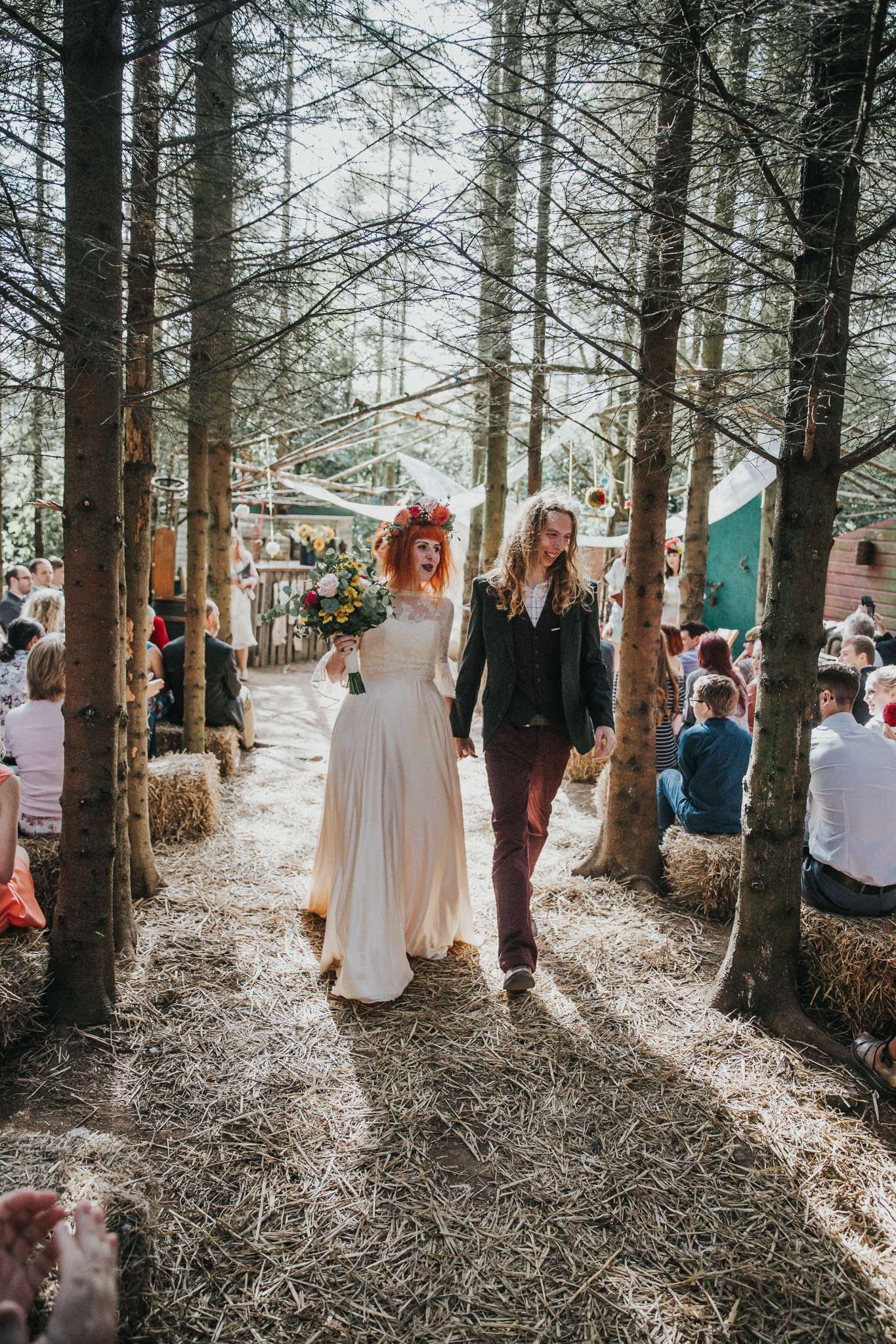 The whole space had a kind of indoor/ outdoor feel with lots of furniture set up around the woods. They had sofas, wardrobe, doors… even an old piano! “We were really lucky that the annual Smugglers Festival took place a week before our wedding at the same site, so we were able to use a lot of existing decor including old chesterfield sofas, old pianos, tents and straw bales for the ceremony. We just added lots of mini dinosaur figures and pompoms!”