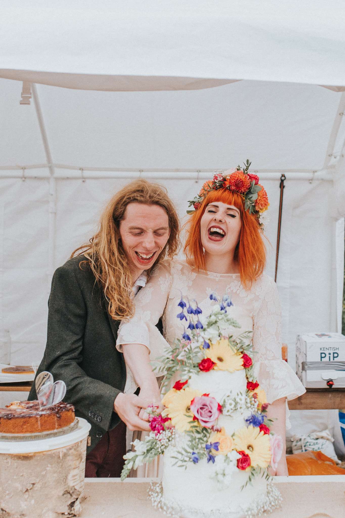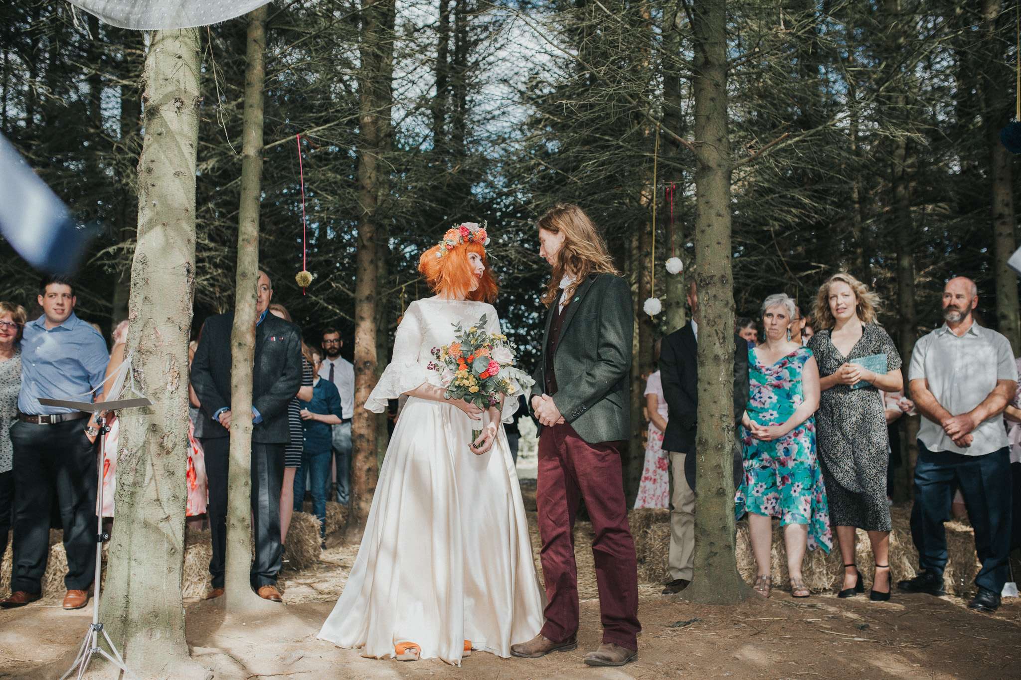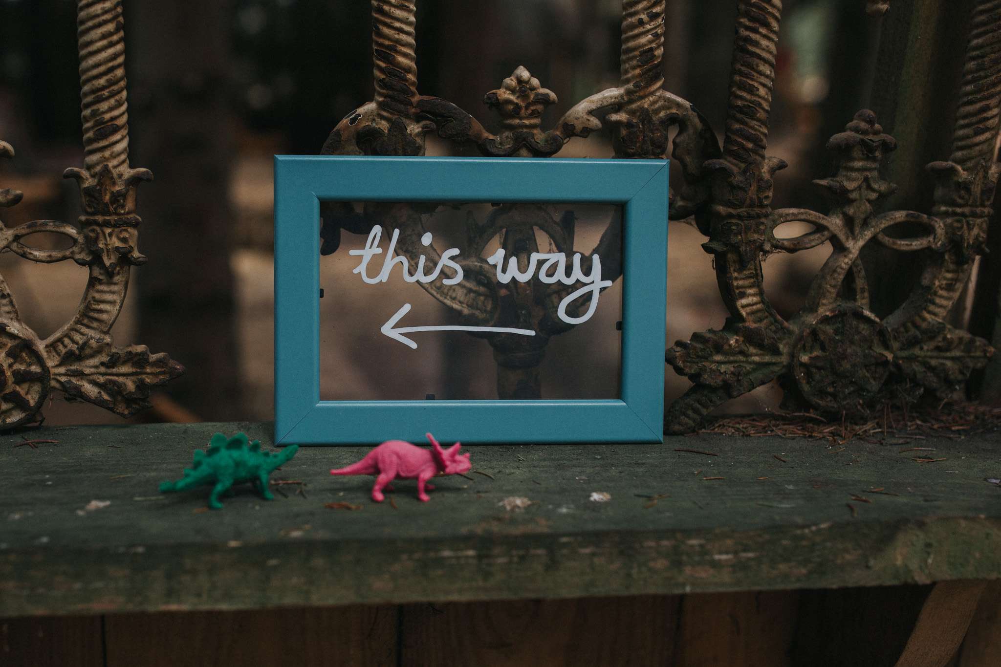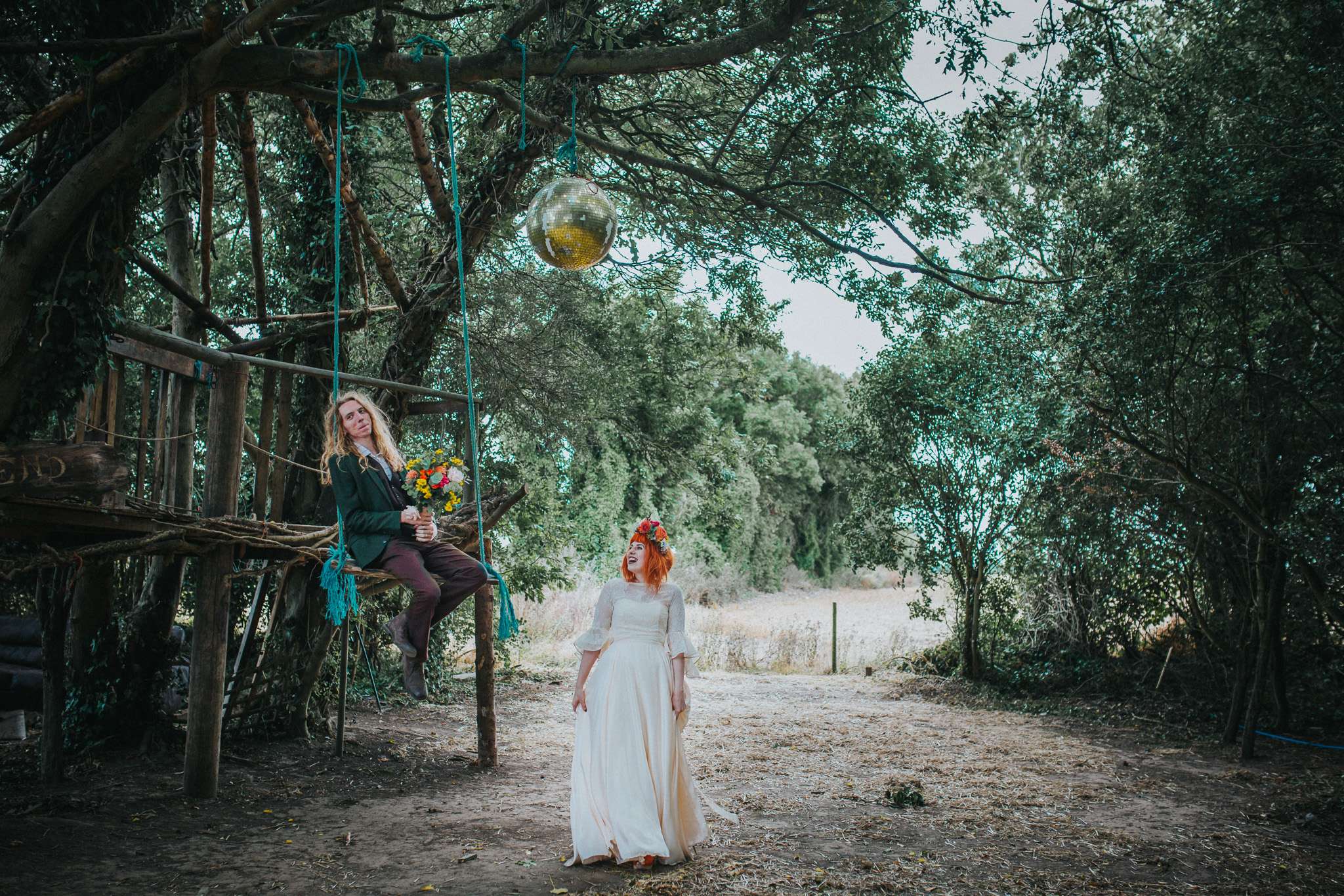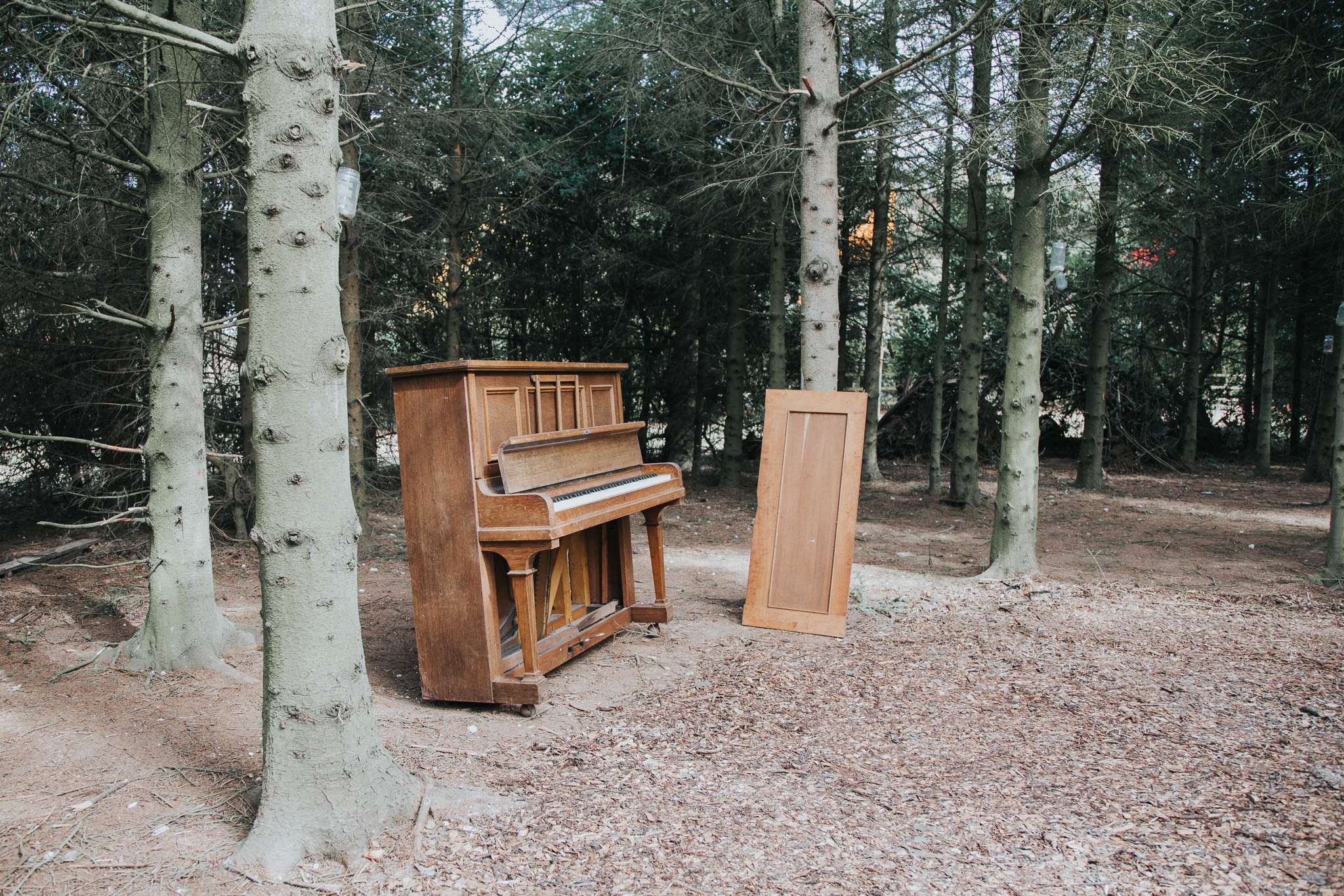 The whole space had a kind of indoor/ outdoor feel with lots of furniture set up around the woods. They had sofas, wardrobe, doors… even an old piano! “We were really lucky that the annual Smugglers Festival took place a week before our wedding at the same site, so we were able to use a lot of existing decor including old chesterfield sofas, old pianos, tents and straw bales for the ceremony. We just added lots of mini dinosaur figures and pompoms!”