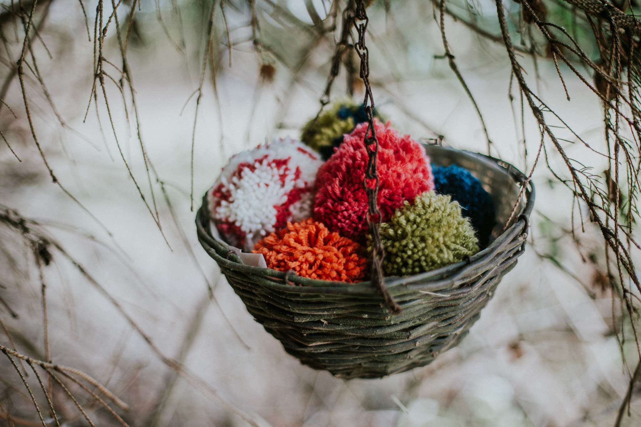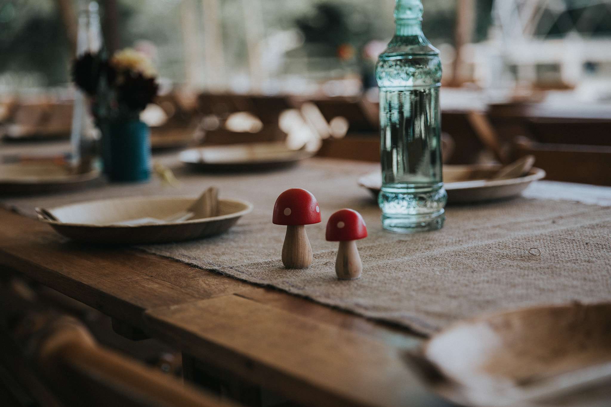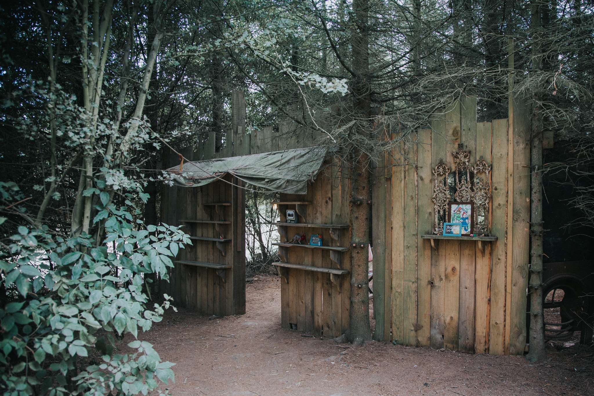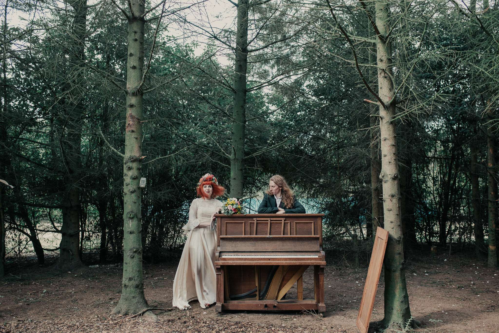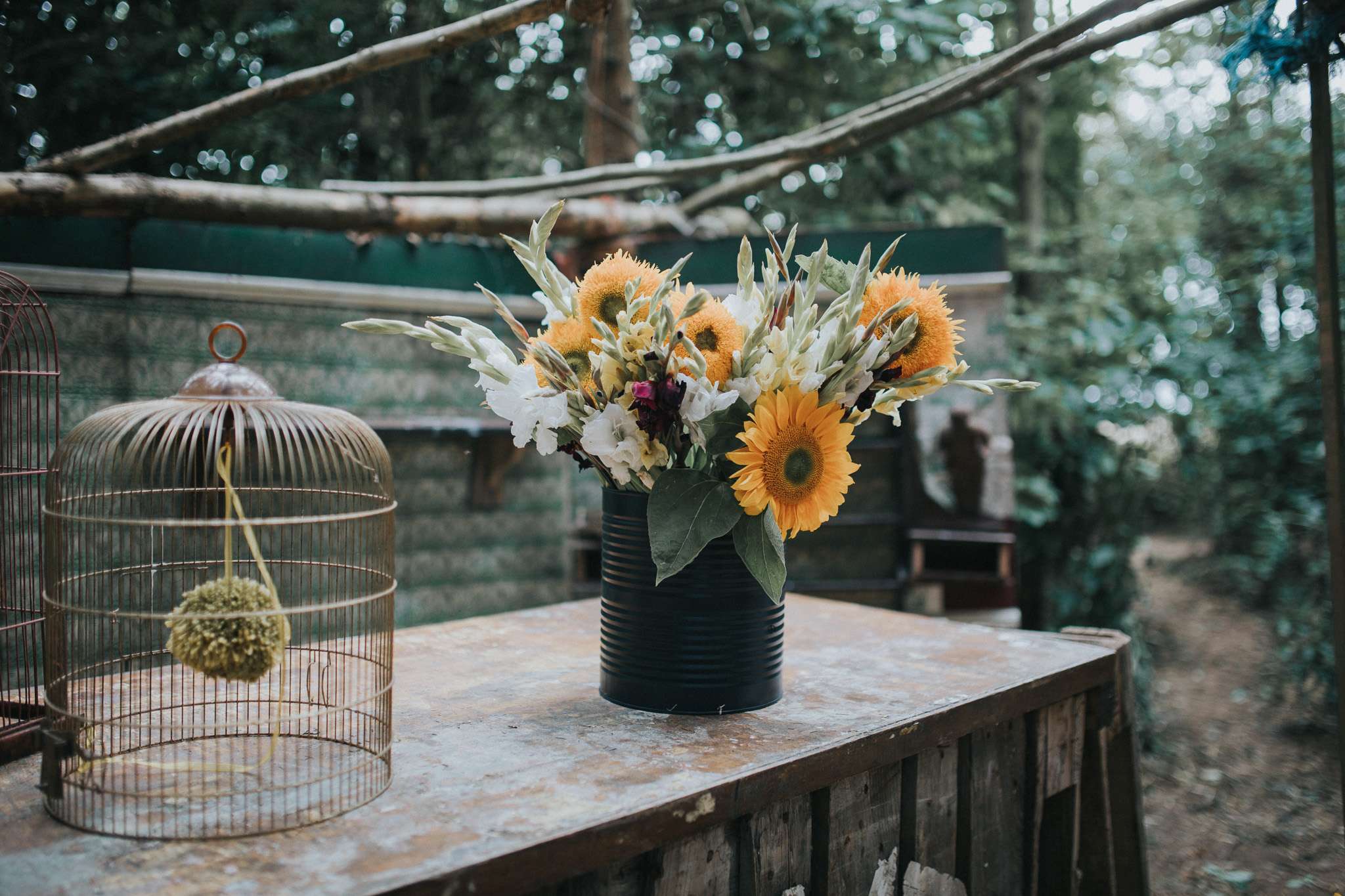The whole space had a kind of indoor/ outdoor feel with lots of furniture set up around the woods. They had sofas, wardrobe, doors… even an old piano! “We were really lucky that the annual Smugglers Festival took place a week before our wedding at the same site, so we were able to use a lot of existing decor including old chesterfield sofas, old pianos, tents and straw bales for the ceremony. We just added lots of mini dinosaur figures and pompoms!”