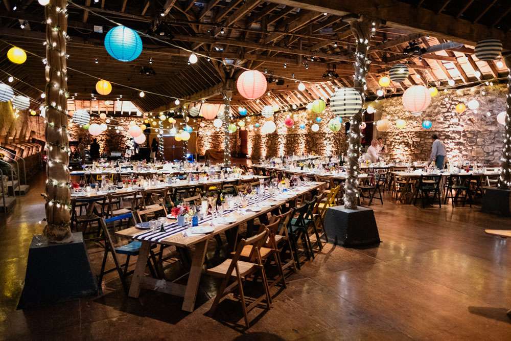 Kirsty explained, “We had sunflowers everywhere! We also spent a ridiculous amount of time and money collecting coloured glassware for the tables from car boot sales and charity shops. It was a struggle but it paid off! We wanted blue and white stripes to tie everything together, so had this for the table runners, the bridesmaid outfits, the amazing rag ribbon garland and the paper lanterns. My mum and I both work in the wedding industry so we had been talking about my wedding for years and it was always going to be a DIY job. We spent months pinning to our wedding board on Pinterest.”