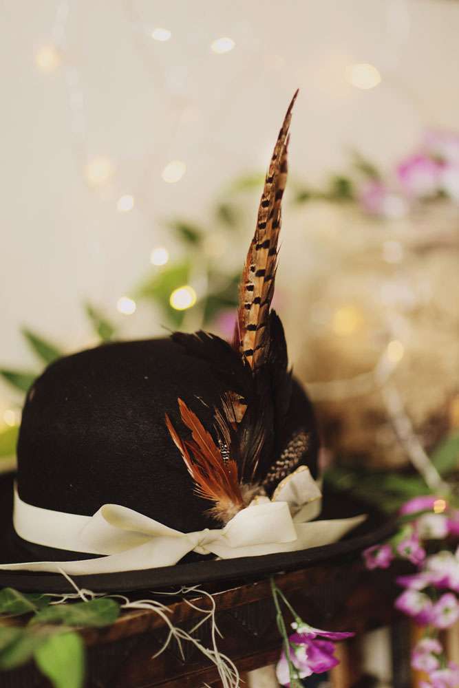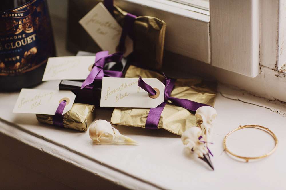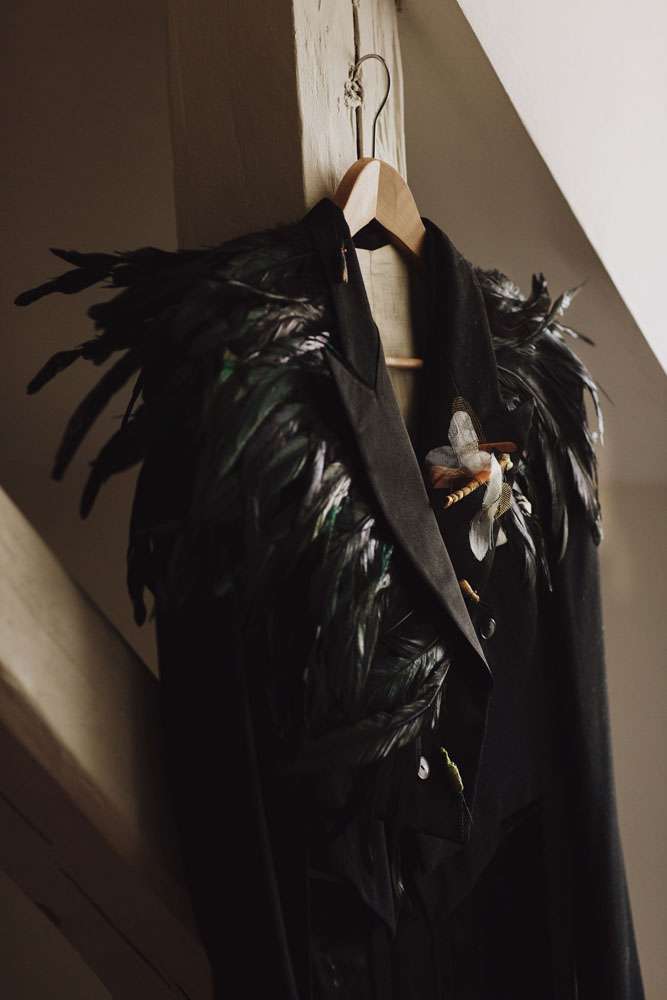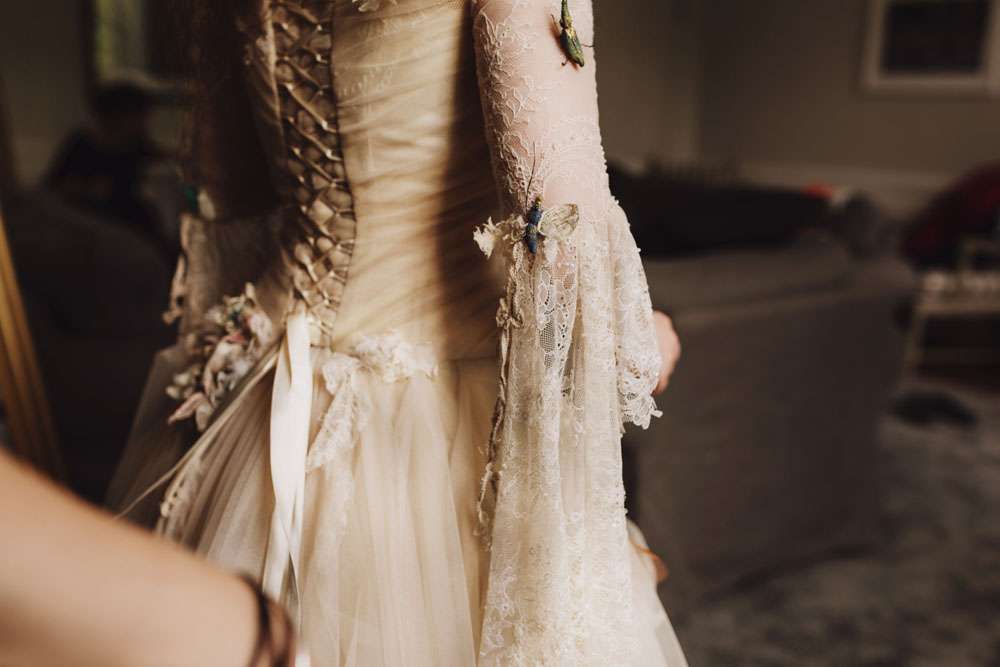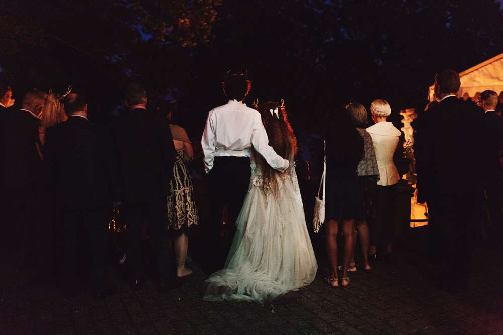 The bride had her dress made by The Couture Company in the UK and the groom rocked a morning suit owned by his grandfather! “My dress was magical and working with Jo at The Couture Company was a joy from start to finish. My shoes came from Amazon and I decorated them myself. I also customised Karl’s suit a bit with feathers and some homemade little insects to match my dress. I made his antlers too, in black and gold. The influences for both of our outfits came from Titania and Oberon in A Midsummer Night’s Dream.”
