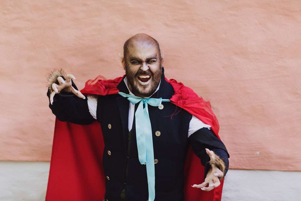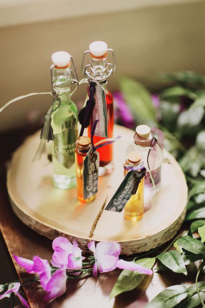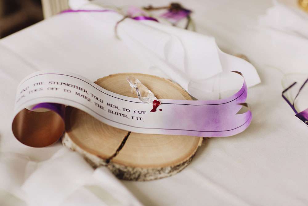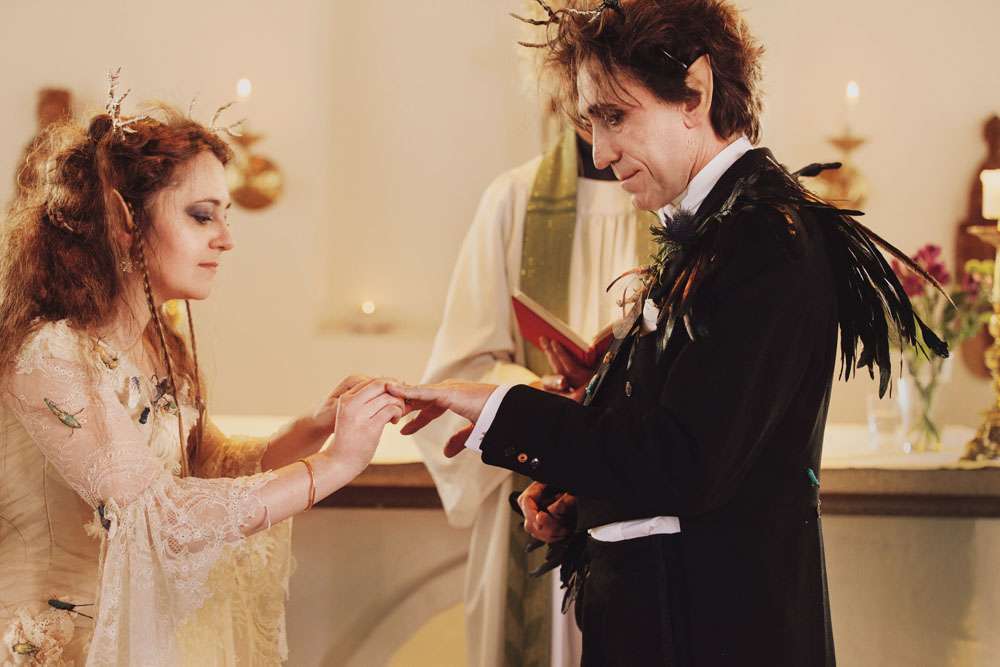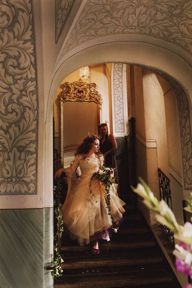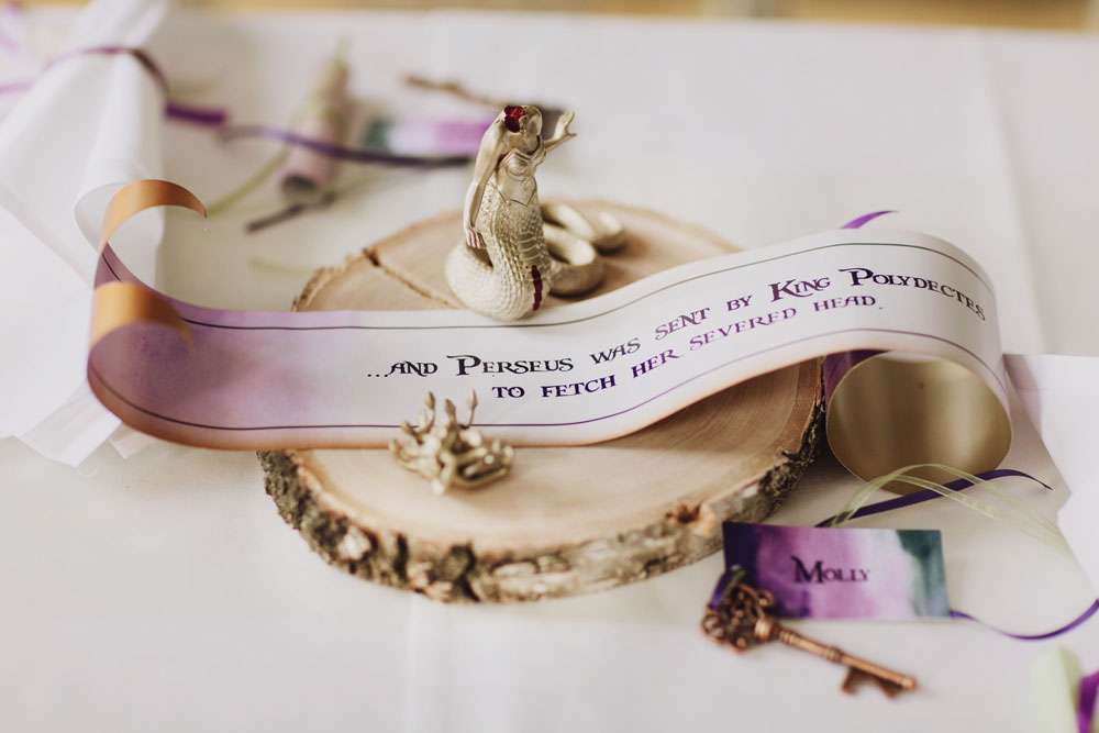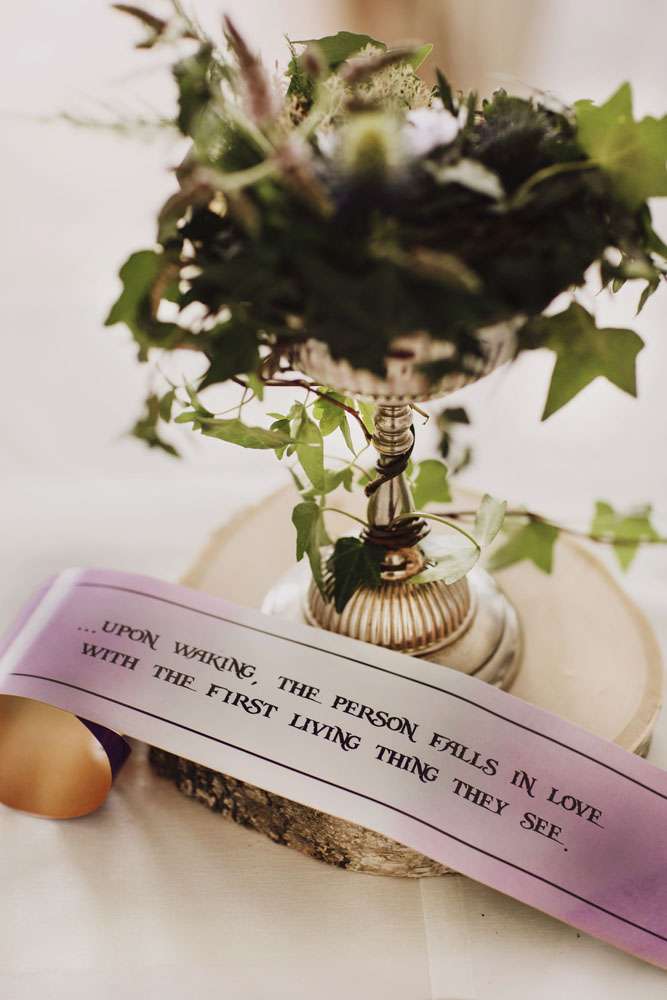 “We chose to call our wedding theme ‘dark fairytales’, alluding to the real endings of the Grimm fairytales and the writings of H.C. Andersen”, said the bride. “It also came from the love of fantasy and dressing up. We are the couple that wear elf ears and robes when The Hobbit opens in the cinema so we couldn’t have a ‘normal’ wedding! Visually, A Midsummer Nights Dream was a strong influence, but there were also nods to Tolkien, Norse and Greek mythology, Game of Thrones and many of our hobbies.”