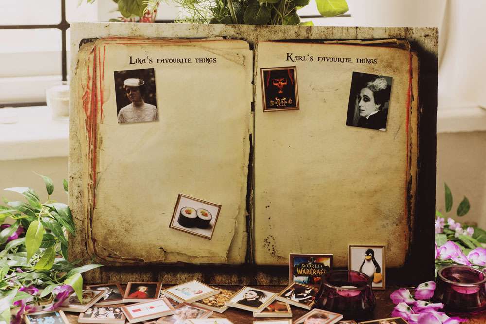 “The signpost for the entrance listing references to our interests in fantasy and gaming were made by my father, Karl and myself. The guestbook table was heaped with stuff we had at home, especially from LARPs and reenactment (and my parents attic). I think I only actually bought the guestbook itself and the two black quills. The place for cards was a decorative birdcage I found in a sale and sprayed the way I wanted it. The dressing up table had some masks, headbands and hats that I customised with paint and feathers to match the theme, and I did get a some fairy wings from Amazon for this as well! The best thing about planning the wedding was getting excited about all the little details we could add.”