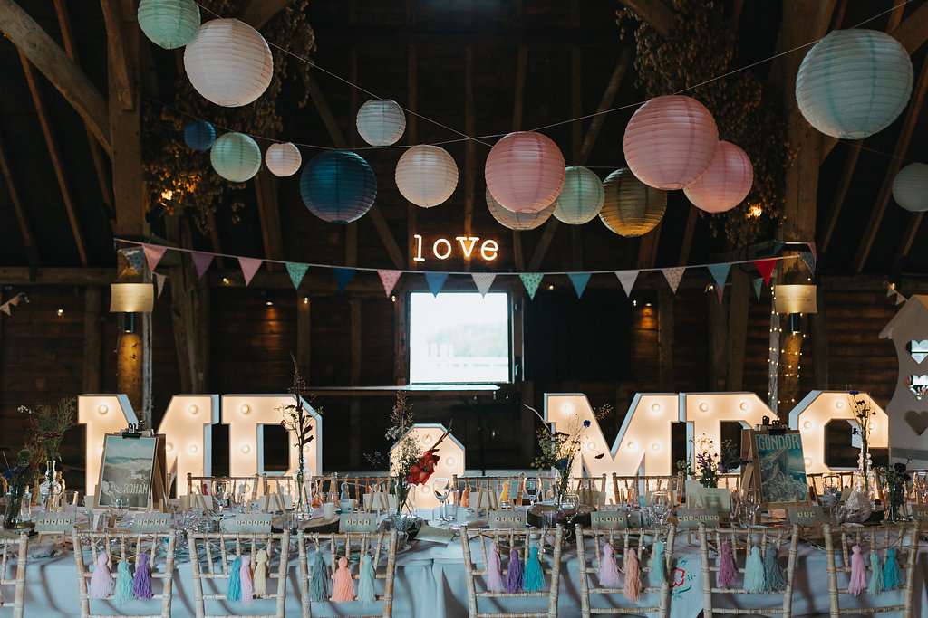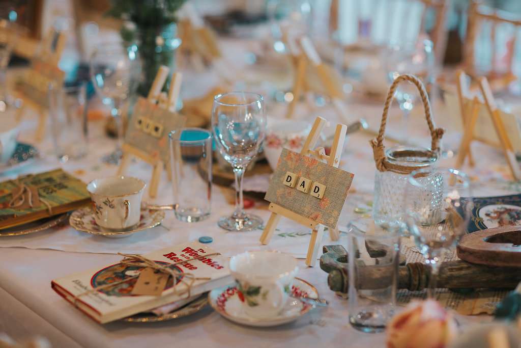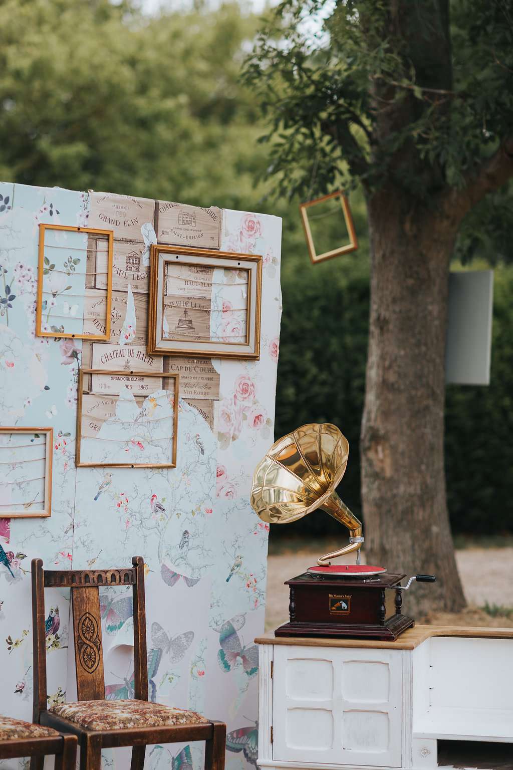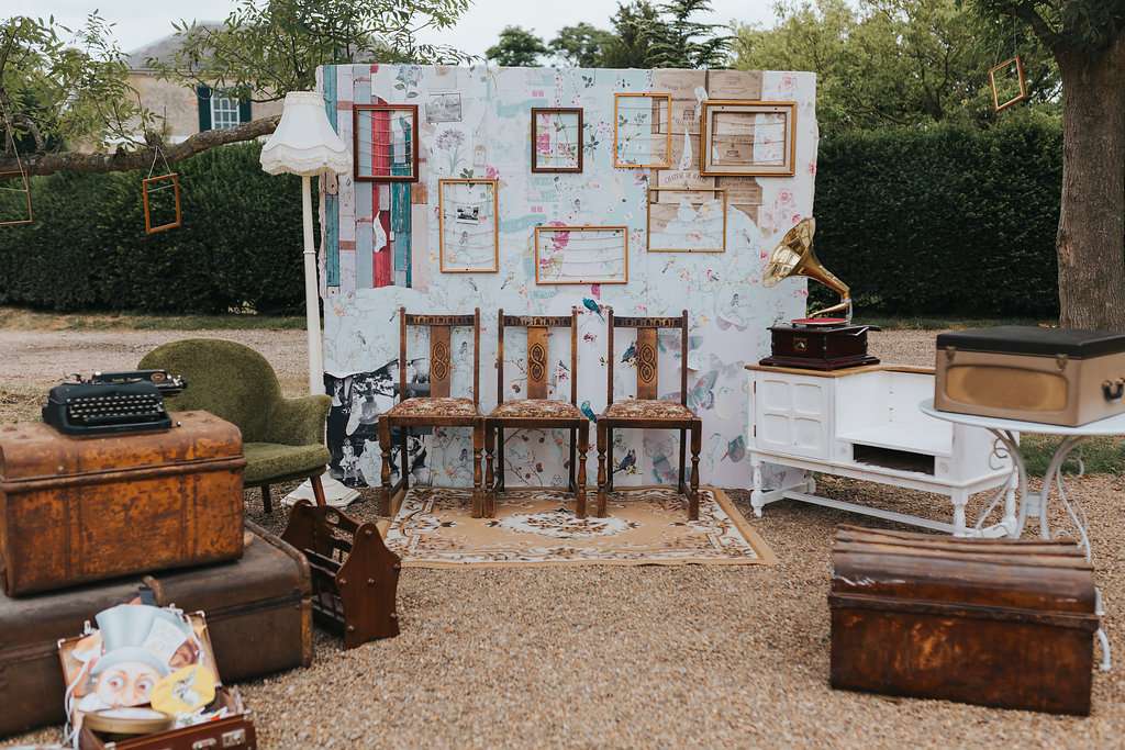 “The wedding had a mix of styles. Our DIY projects included our photo booth background which was outside and set up like a vintage living room, and all the props on the tables.”