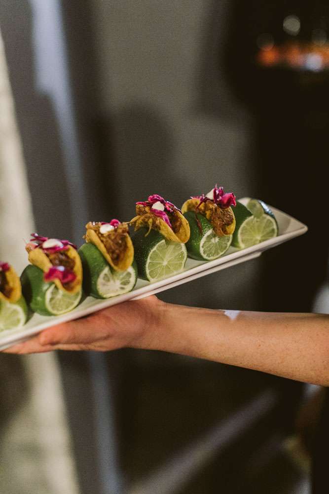 It was really important to the couple to have only vegan food at their wedding. “We worked with Jay Astafa Catering for our all vegan and mostly gluten-free menu. We started with a cocktail hour, serving eight different types of hors d’oeuvres, including buffalo cauliflower, mini jackfruit tacos and fig crostini. For dinner, we served a buffet that featured some classics such as eggplant rollatini, as well as some seasonal dishes with fall flavors like stuffed acorn squash and butternut sage ravioli. For our desserts, we were so lucky to work with Emily Aumiller of Lael Cakes. They were all vegan and gluten-free, tasted amazing and were absolutely stunning. We had a naked tiered cake with sugar-sculpted branches and pears on it, an array of mini cupcakes and mini caramel apple pies.”