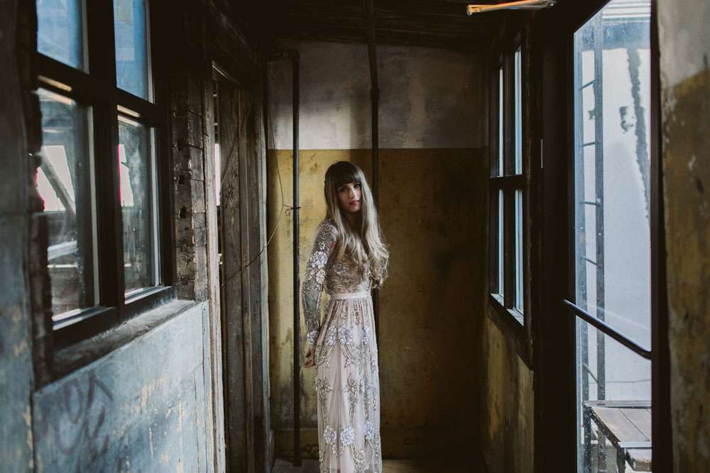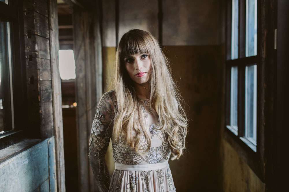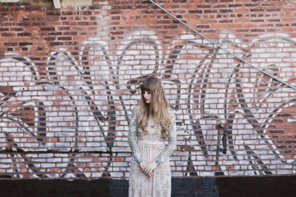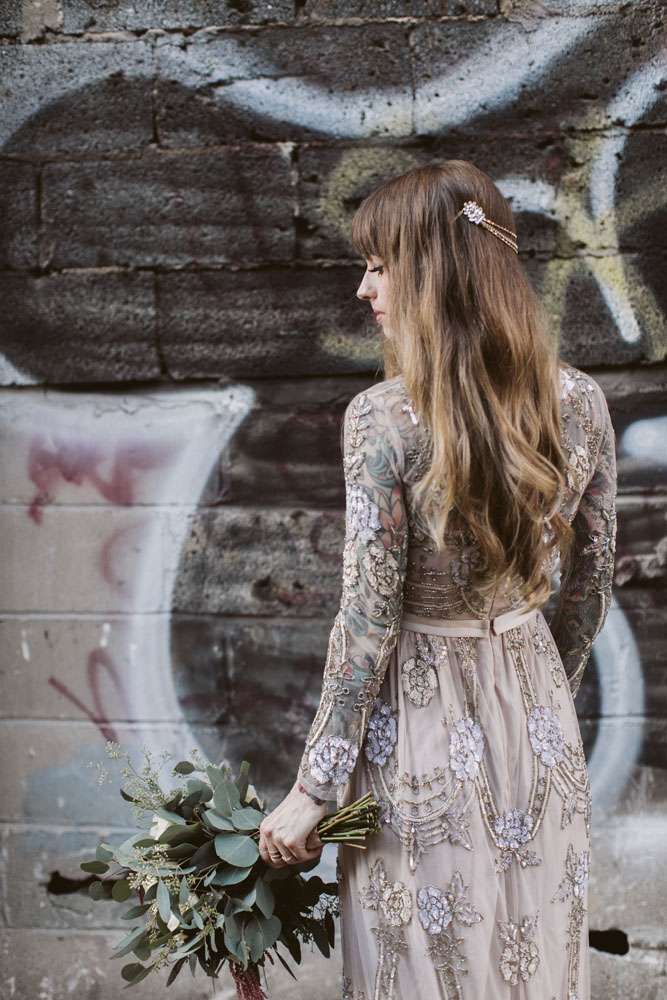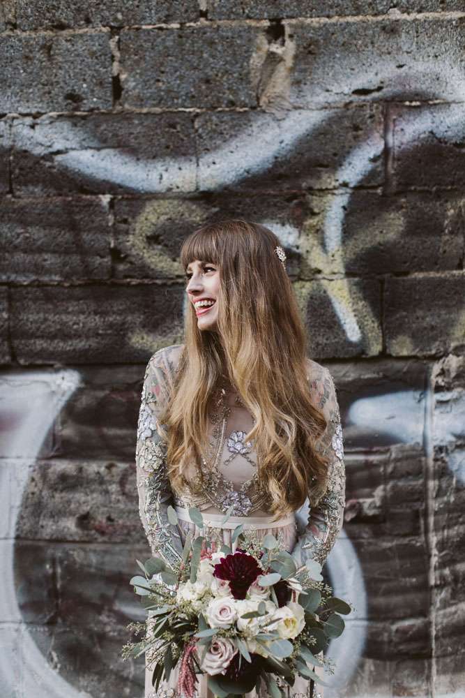 Megan wore a pale dusty rose coloured dress from BHLDN, rather than a traditional white one. “I always knew that I wouldn’t be a puffy white dress bride, and I also didn’t like the idea of buying something I would never wear again”, she explained. “I wanted something unique and classy with a vintage feel and my search led me to BHLDN. I loved so many of their dresses but ultimately chose the Adona. It was the first one I obsessed over when looking for dresses, so I think it was meant to be! I loved how it sparkled and was perfectly unconventional.”