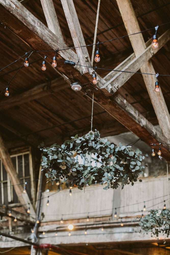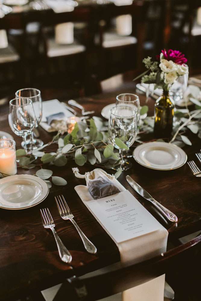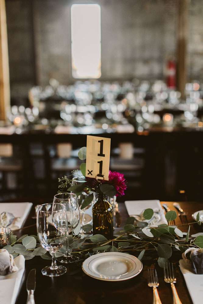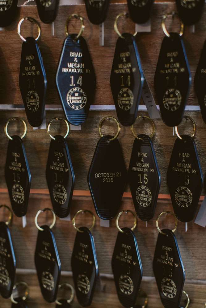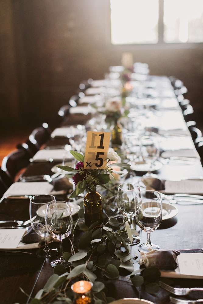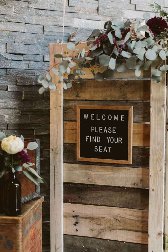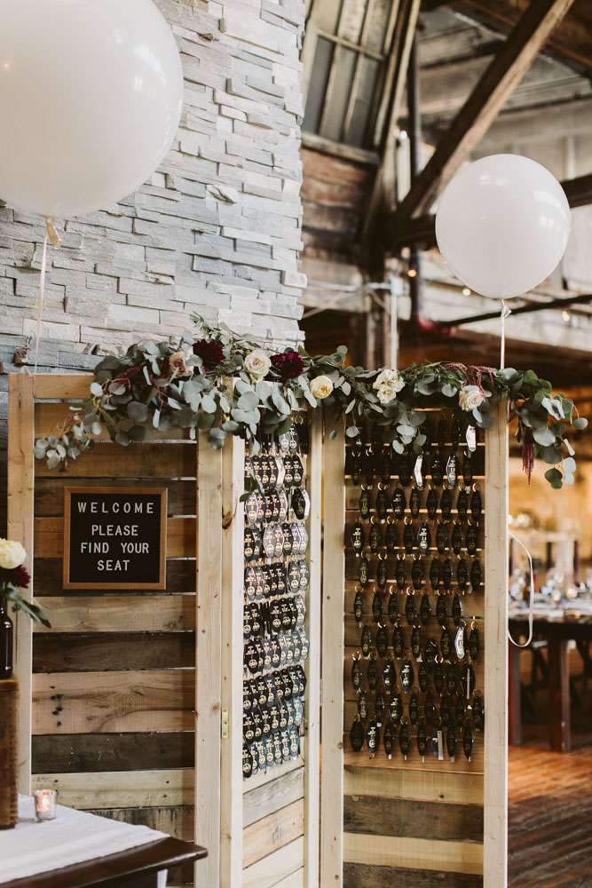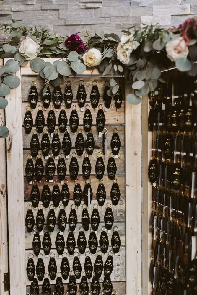 “For décor we created two backdrops, one for the bar and one for our ceremony, which were made of white yarn and then topped with eucalyptus garlands we had made the night before. We rented beautiful barn wood tables and decorated those with eucalyptus and small arrangements in brown bottles, along with lots of candles and vintage maths flashcards for table numbers. We love old motel key tags, so we had custom ones created in black and gold which we used in place of escort cards and they were a fun keepsake for our guests. We also brought in some vintage furniture to create a small lounge area, which was appreciated by our grandparents!”