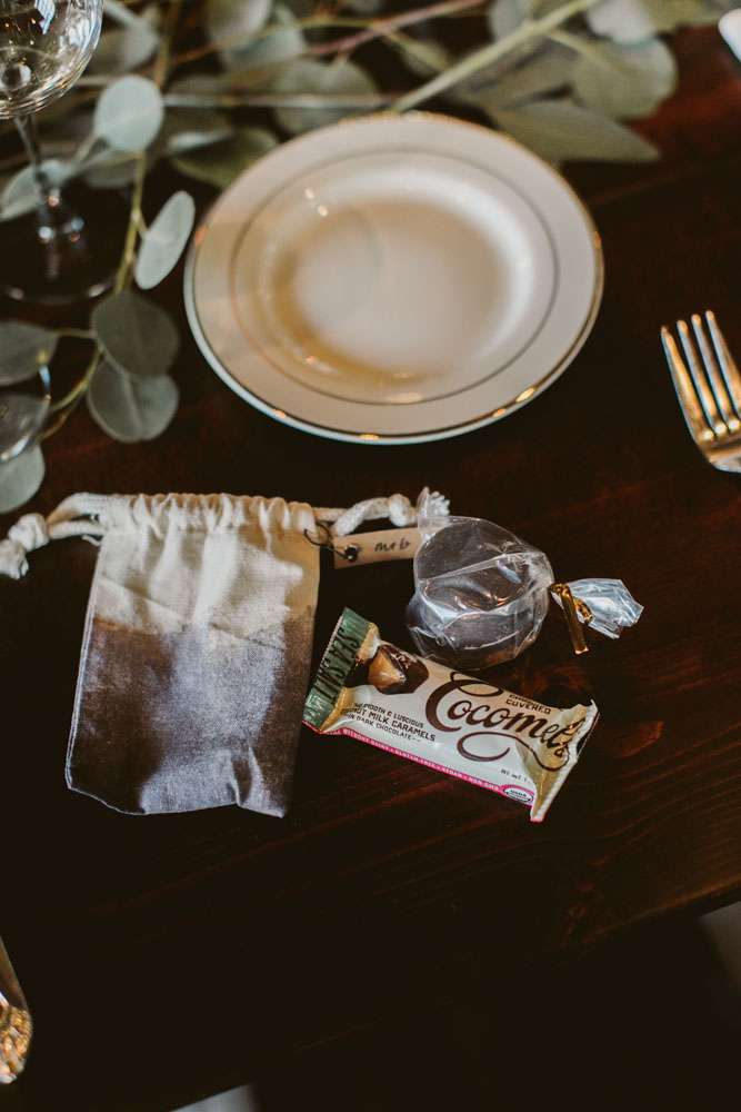 “It was so hard to choose what to give as favours. We wanted it to be something we love, so we went with treats! We ordered mini s’mores from Sweet & Sara and salted coconut milk caramels from JJ Sweets. We then dipped dyed muslin bags to a dark grey ombre and used those to package the favours in. We were really proud of those bags!”
