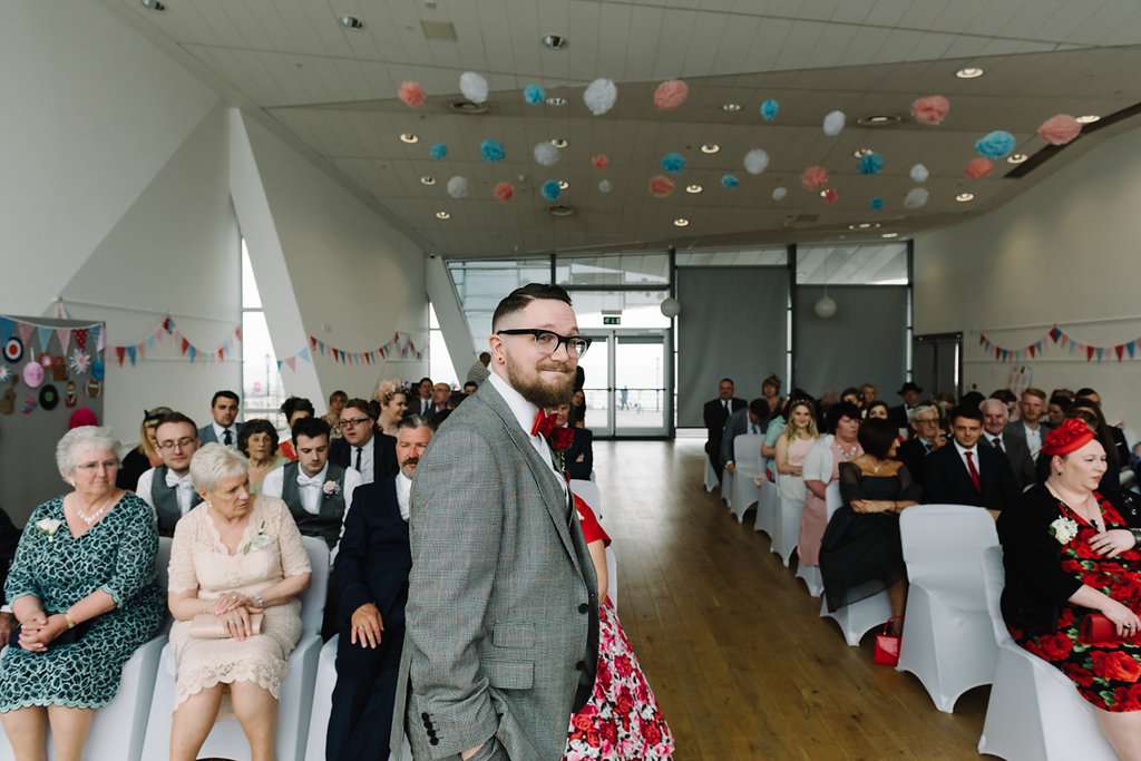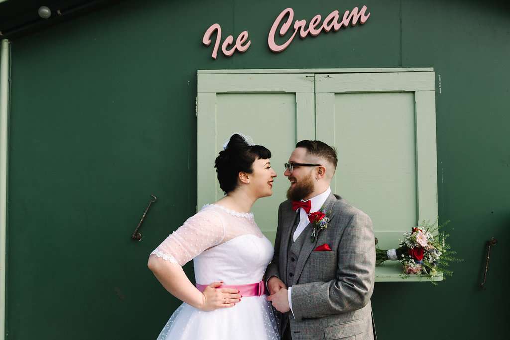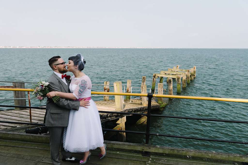 Charlotte and Jack’s wedding had a really unique location – Southend Pier! The day had a retro theme with Disney references throughout. “Our wedding theme was ‘Grease meets the Great British Seaside!'”, said the bride. “We were inspired by lots of wedding blogs, especially Rock n Roll Bride! We saw so many couples who had a day that reflected them and that’s what inspired us to plan a wedding that people would describe as completely us. Also, we saw so many weddings that looked like they and the guests were having a total blast, so we wanted to have a day full of fun!”