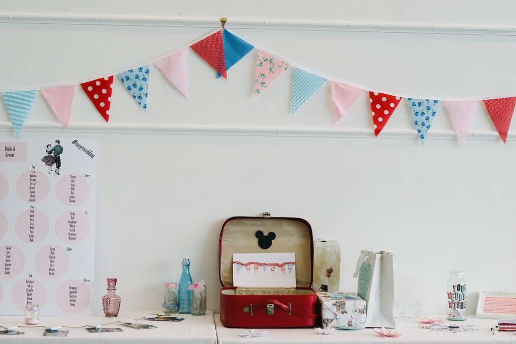 As a huge Disney enthusiast, the bride wanted subtle Disney references throughout the day too. “One of my favourite things was the ‘Hidden Mickey’ challenge”, she explained. “I hid 13 Mickeys throughout the wedding, e.g my earrings, one of the cross-stitched table numbers, another in a jar on the bar… The guests were allocated time to find them all, with the first one with all correct answers winning a prize!”