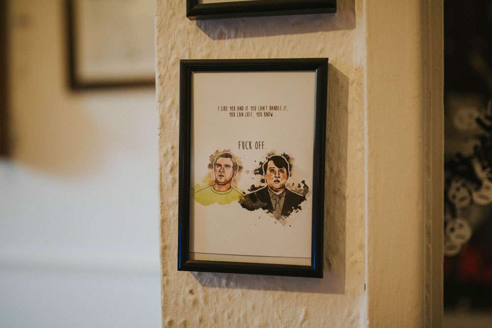 A funny moment from the day was when Sam surprised Morgan with a tattoo he’d gotten to celebrate their marriage! “InĀ evening Sam grabbed me off the dance floor saying he had something to show me. I was pretty nervous, I thought something had gone horribly wrong. When we got to the ‘quiet room’ at the back of the hall, he rolled up his trouser leg and revealed a very fresh tattoo of Papa Lazarou from the League of Gentlemen with his famous quote ‘You’re my wife now!’ I was in stitches. It’s something we say to each other all the time and is of course our favourite episode from the show. I’d even written it on our ‘order of the day’ board. It was such a Sam thing to do.”