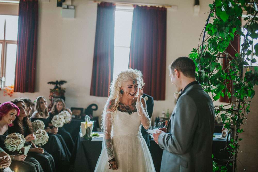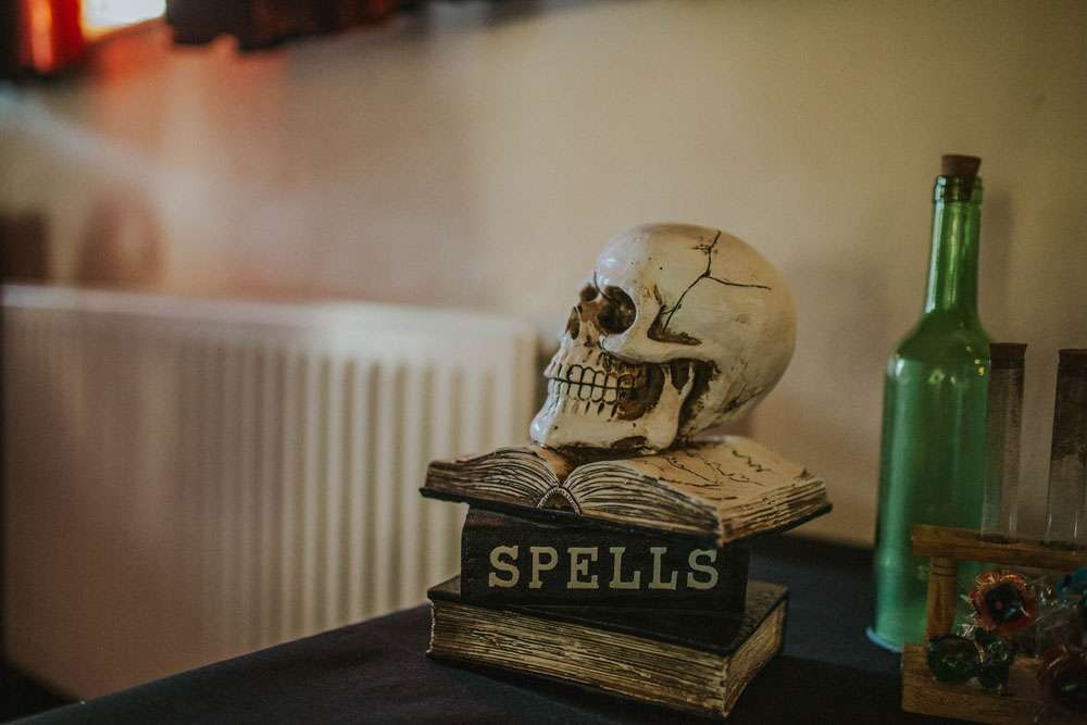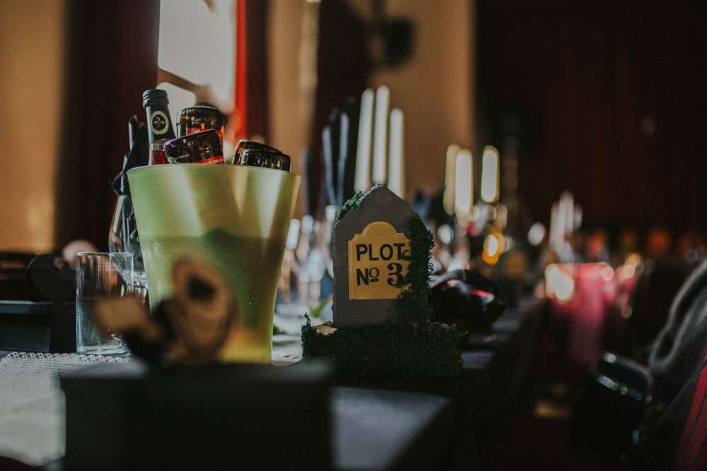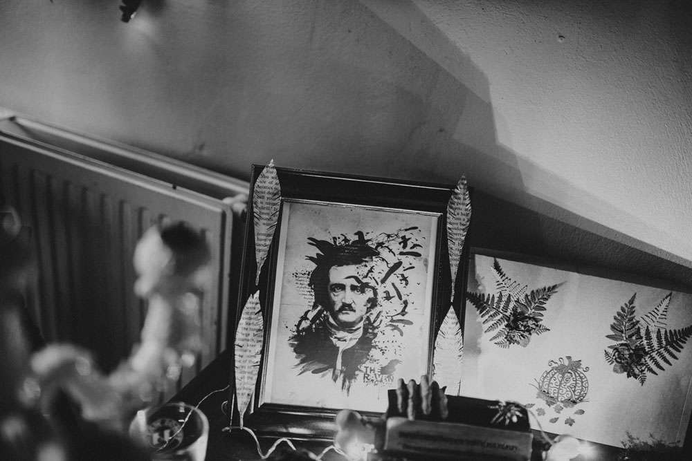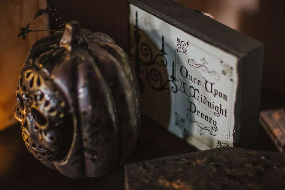 The reception space was decorated by the couple themselves. They did lots of DIY and incorporated so many things to suit their spooky theme. “There were a lot of skulls and ravens placed around the room and jumping zombie hand”, the bride continued. “We had munchkin pumpkins on the tables and we scattered dried leaves along the aisle. We also wanted to subtly add our love of books, in particular Edgar Allan Poe, so we framed some Poe quotes and used the pages of books as confetti. The aim was to make the room look like a woodland scene, with little horrors lurking in every corner.”