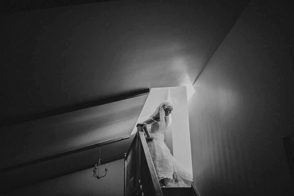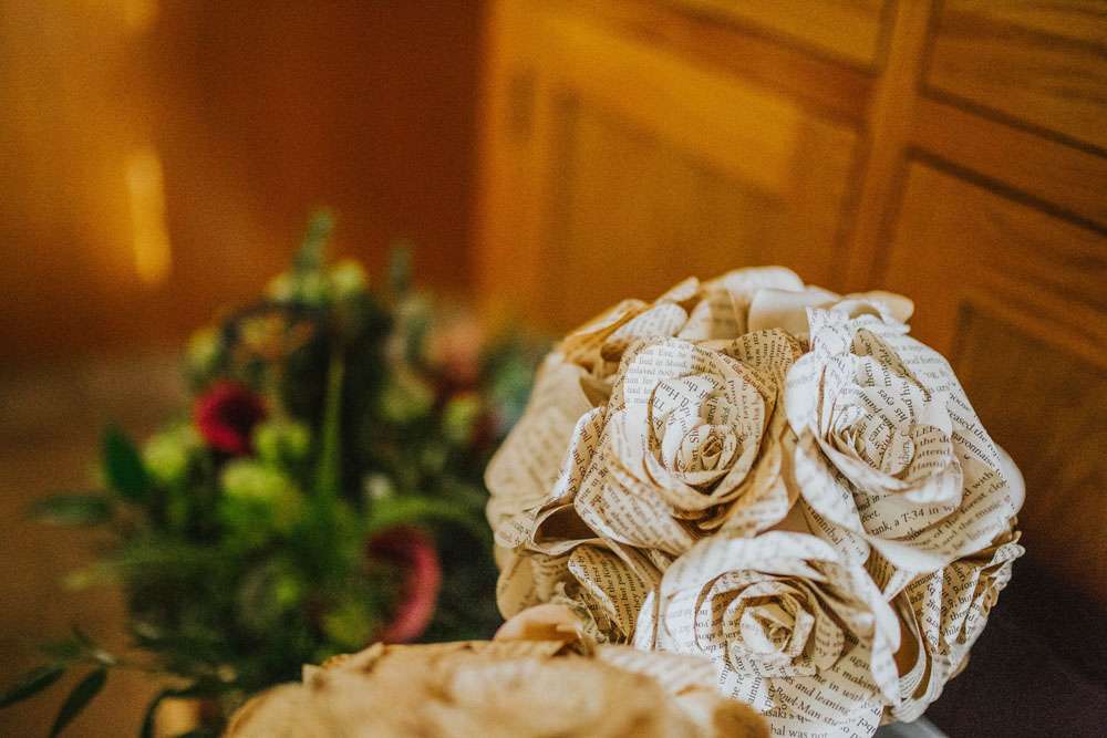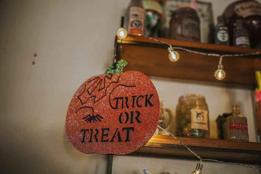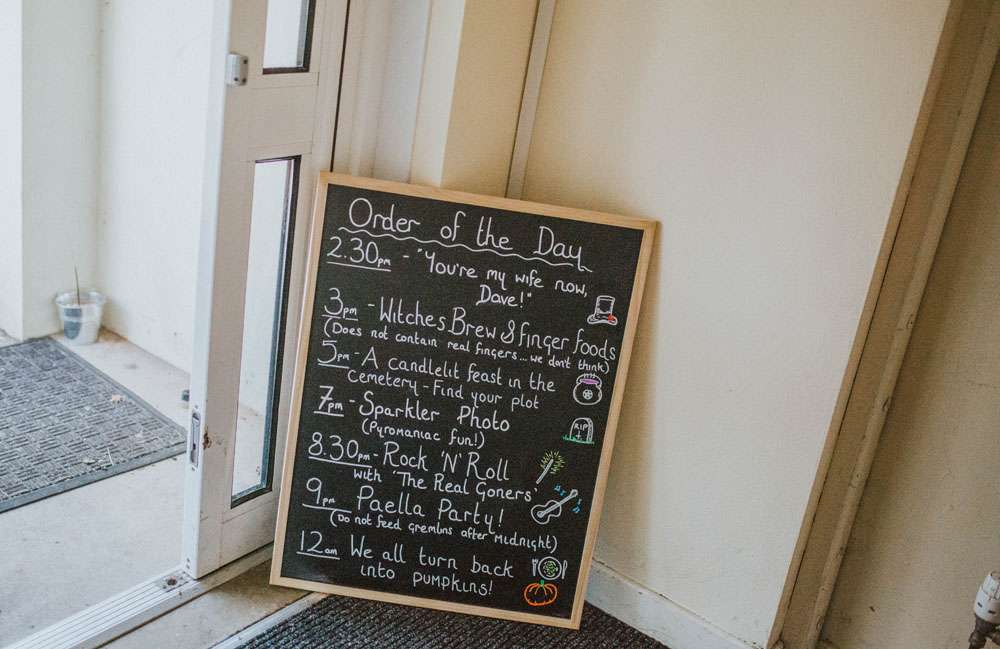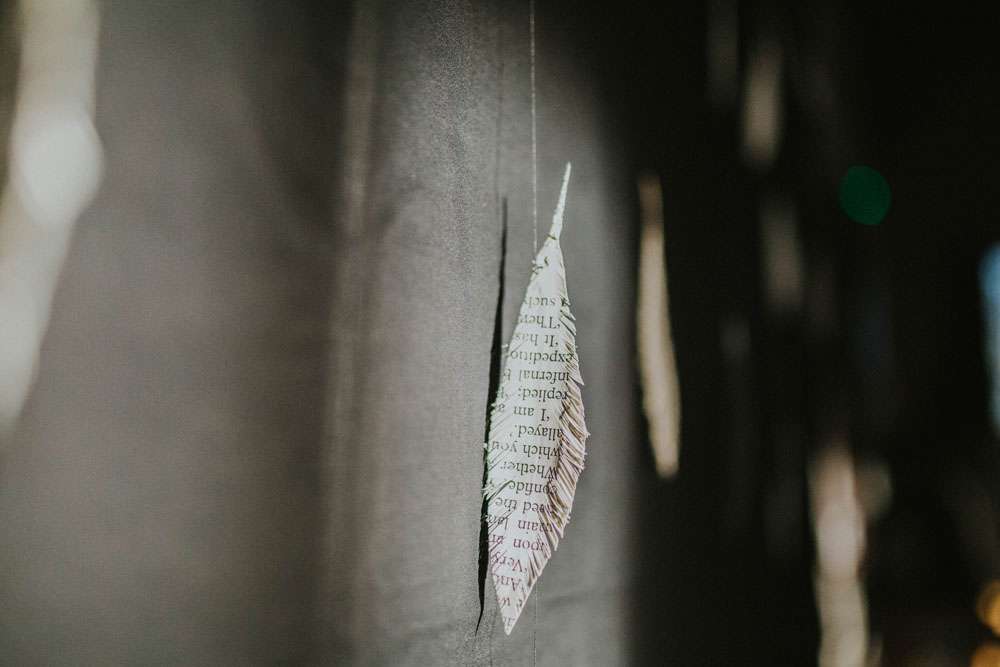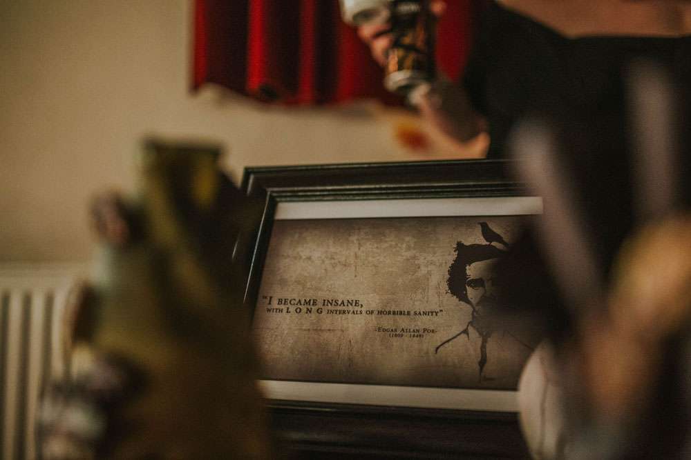 The reception space was decorated by the couple themselves. They did lots of DIY and incorporated so many things to suit their spooky theme. “There were a lot of skulls and ravens placed around the room and jumping zombie hand”, the bride continued. “We had munchkin pumpkins on the tables and we scattered dried leaves along the aisle. We also wanted to subtly add our love of books, in particular Edgar Allan Poe, so we framed some Poe quotes and used the pages of books as confetti. The aim was to make the room look like a woodland scene, with little horrors lurking in every corner.”