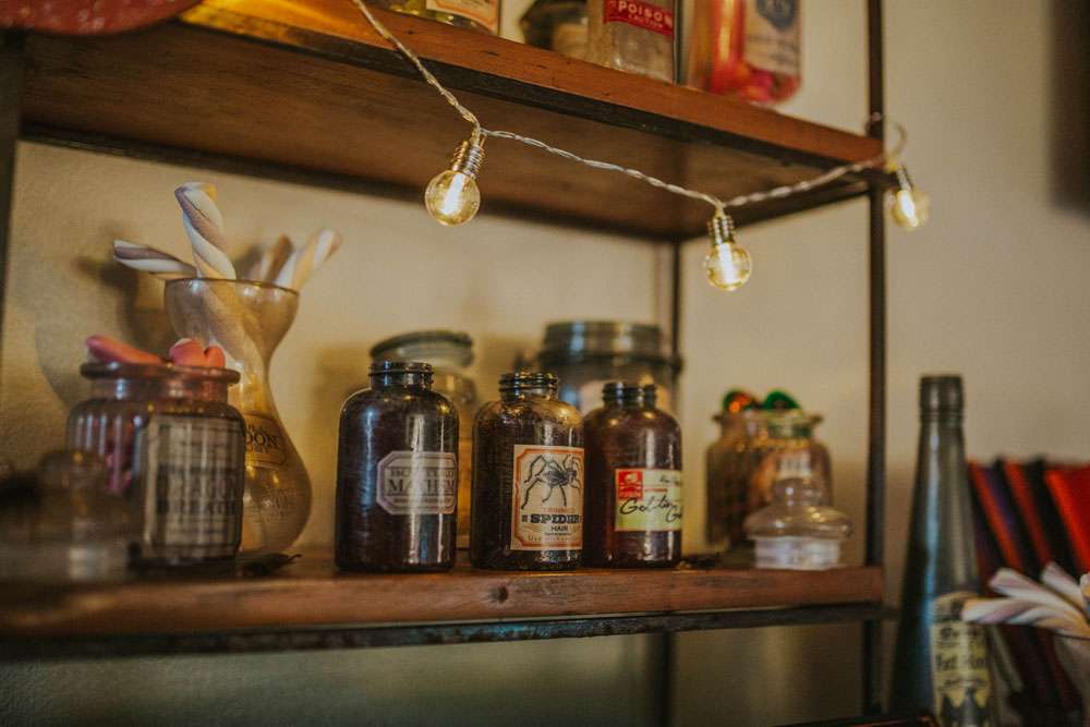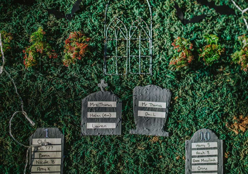 “The tables were set out in a banquet style, all joined together so that everyone felt connected and we ate by candlelight. We had a cemetery theme running through the dinner, with gravestones as table numbers, coffins as favour boxes and moss and other foliage sprinkled around. In the favour boxes, we gave out personalised candles, personalised badges and temporary tattoos. We included the pentagram symbol in several things throughout the wedding as a symbol of protection and unity.”