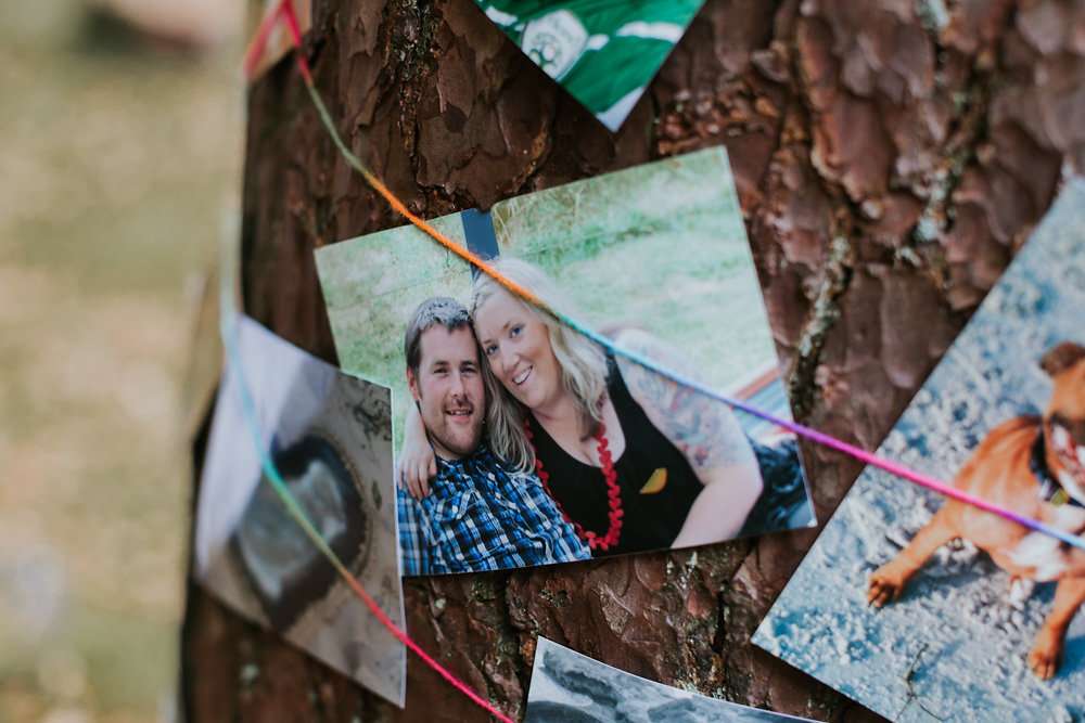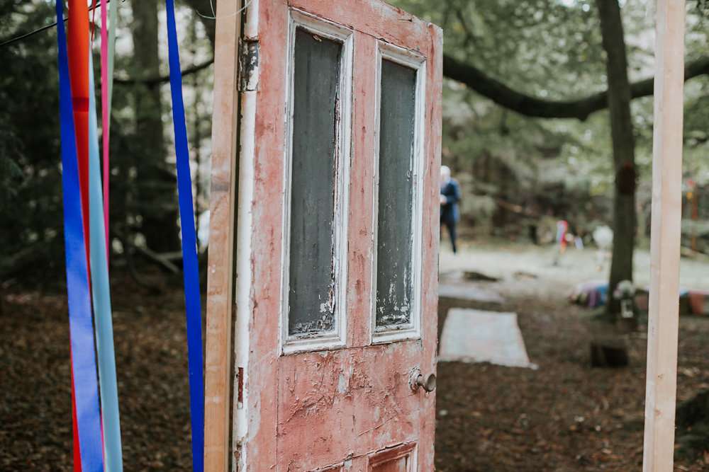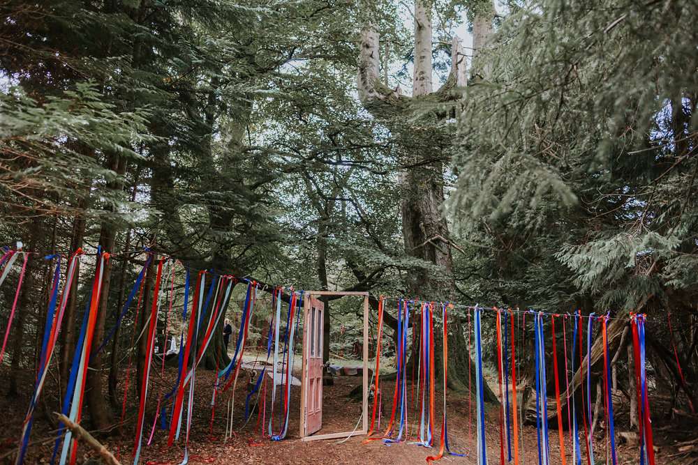 The reception was held in a marquee at Kippure Estate in County Wicklow. “We made everything ourselves as I’m a very crafty person, it was great fun. I made the tassels for the roof, a DIY photo booth, the signs and all of the little bits in the woods. We had God’s Eyes hanging off the trees and a ribbon wall around a door.”