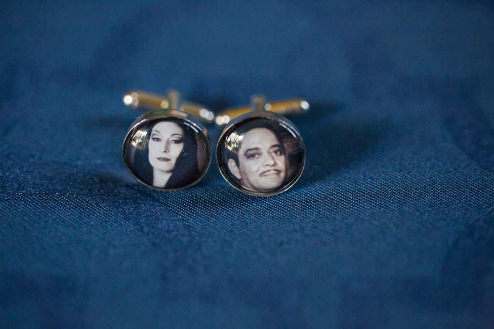 Their ceremony and reception took place at Southern Mansion in Cape May, New Jersey and they decorated all the tables themselves. “For decor, I painted tall cylinder vases and put fake indigo hydrangeas in them with some sticks which I hung crystals from. For favours we made a family recipe of Apple Pie Moonshine and put it in little mason jars and labelled them ‘Love Potion’. Our cake topper, cufflinks, invite verbiage, and photo we had framed for people to sign were all Gomez and Morticia. We also have our fave couple tattooed on our arms with each others name.”