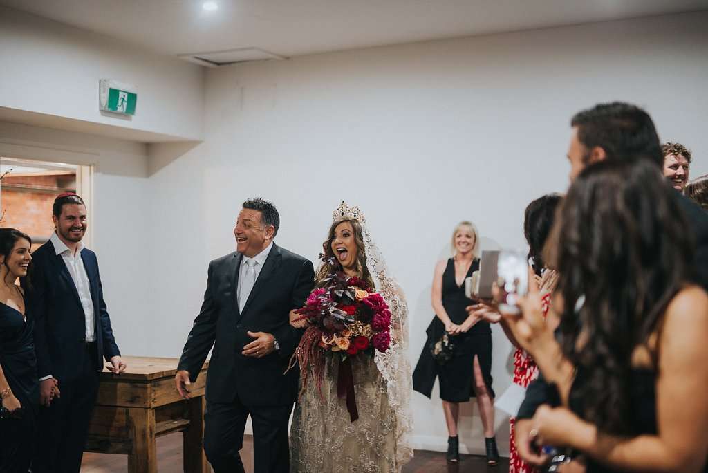 The bride’s stunning dress and crown were made for her bu Australian designer Lady Petrova. “I wanted a detailed gold dress and Simon chose a blue velvet suit. Our goal was to create a whole ‘world’ for the new year’s eve party, reflecting the kind of food, music and booze we and our guests regularly enjoy, rather than traditional, bland, wedding-y type stuff. His family is Jewish and mine is Italian.”