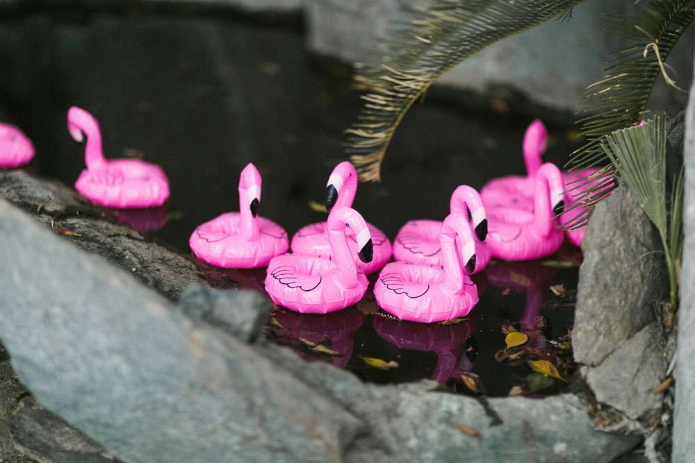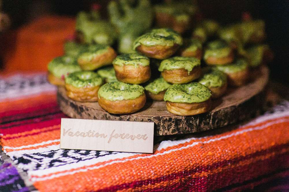 As their wedding was held in a beautiful cactus garden, they were able to limit the amount of décor they needed. “Although we didn’t need as much décor, we were still both suckers for good details like custom signage and flamingos in the pond! From the mini donuts, to the hotel keychain party favors, to the music playlist, to the reception seating set up being on the same space as the ceremony, it took a village to pull off all the DIY action that took place!”