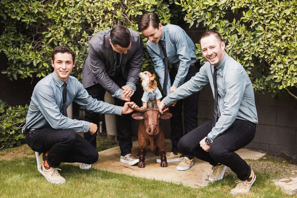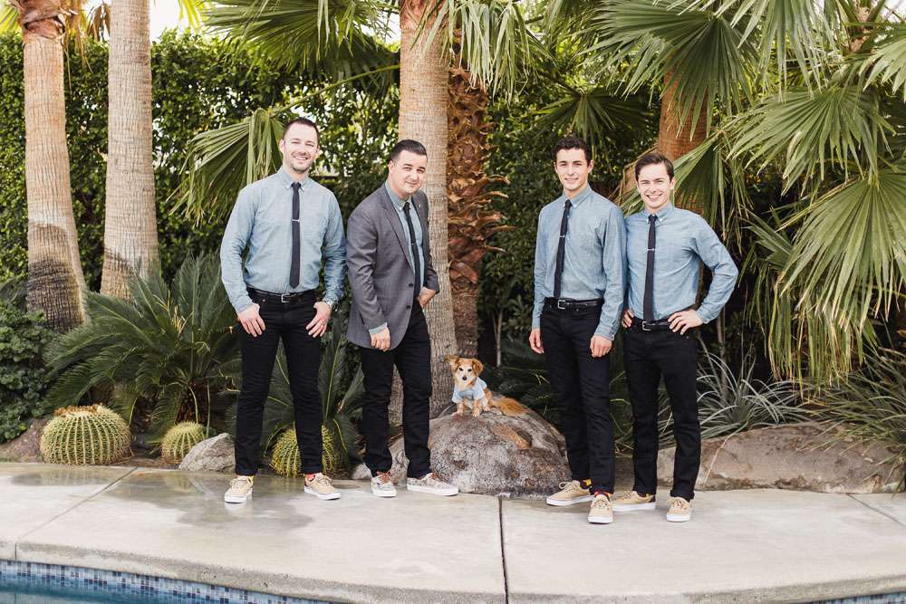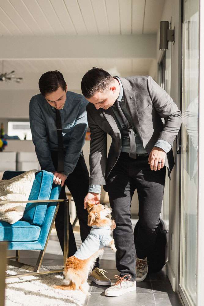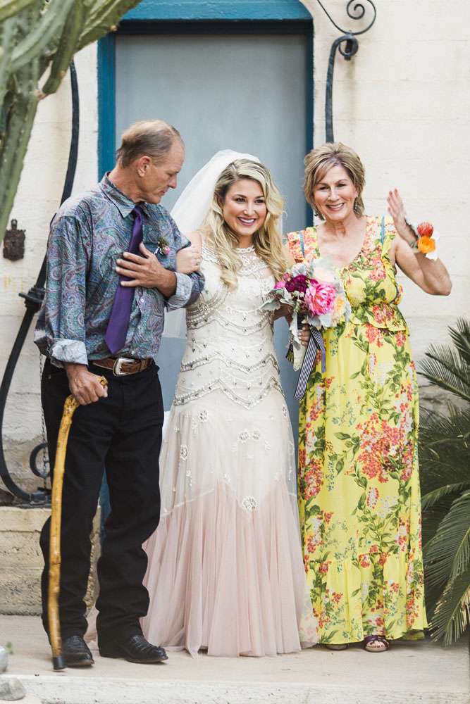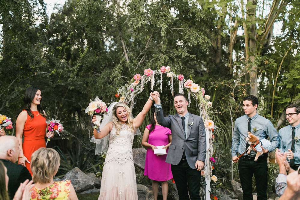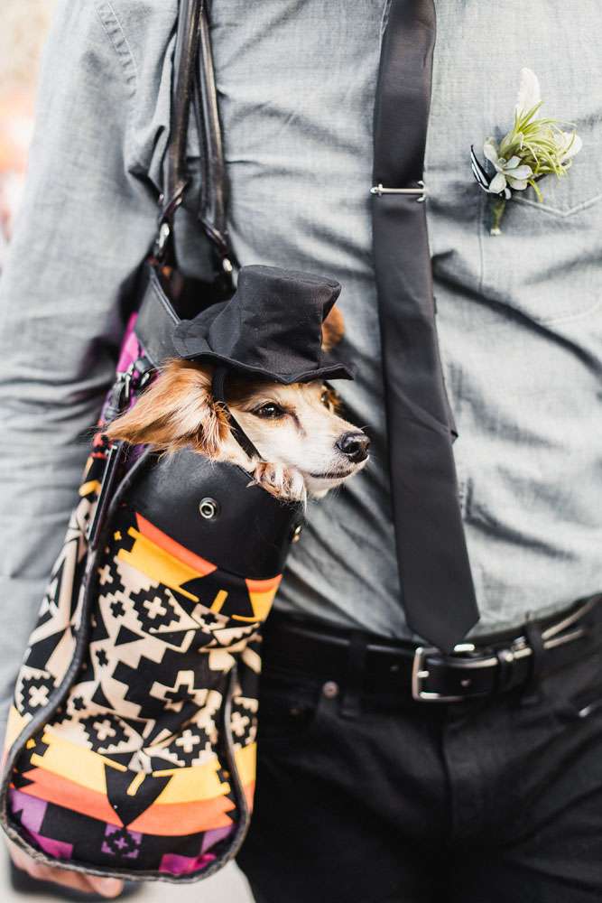 “We have six awesome and very different parents and we wanted them all to feel a warm welcome and be included in our big day even though they are not necessarily best friends. We also wanted activities like our photo booth bus and tour of the cactus garden to give our guests ways to connect with and get to know each other. We included our dog Kingsley (complete with his own chambray shirt) in the ceremony and included our friends in as many elements as we could. We also encouraged them to wear jeans and we skipped most of the traditional elements of what society says a wedding needs to be.”