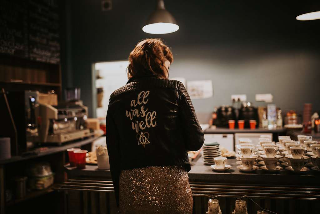 DIY projects done by the couple included decorating their reception room, customising Laura’s jacket, making place settings and real green garlands. “There were a few things we did ourselves. The biggest one was probably setting up the room; Al spent the two days before the wedding setting it up, stringing bunting, lights and lampshades… mostly by himself! We’d collected the old lampshades, lights, and vintage champagne glasses over the two years we were engaged from different charity shops and auctions. Al has an auction house in our home town which turned out to be a great source for props, chairs, lights, and lots of other things!”