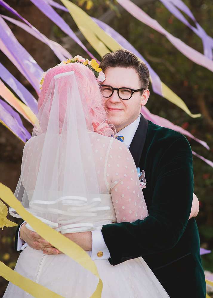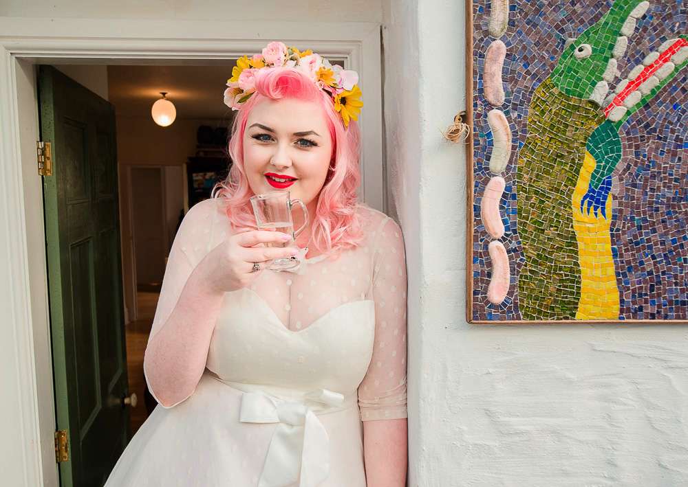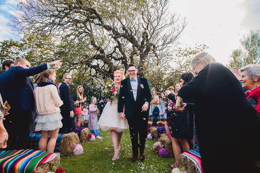 Their second ceremony actually ended up being the bride’s favourite part of the day. “Personally it was one of my favourite parts of the whole day and I am so so glad we decided to go ahead with a ceremony. It was in the front garden of my mum’s house so it cut out any stress of having to get somewhere on time, we got ready in my bedroom and stepped out of the front door when it was time. It also meant we could have our cats there with us. I originally had hoped to walk them down the aisle and had been practising with them with leads but they were a little stressed out with all the people around so we decided it was best to leave them inside. It was so fab to have them scampering around when we were getting ready though! I left all of the setting up of the garden to Lukasz and my family so it was the best feeling to step outside and see it made up so beautifully and colourfully with hay bales, streamers and cat pom pom bunting tied to shovels!”