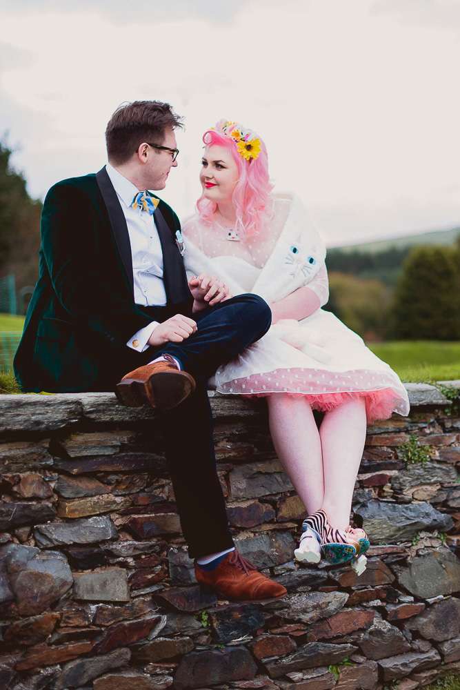 The bride’s dress was from Lindybop and her bridesmaids wore dresses from Chi Chi London. Her headband and veil was custom made for her by Crown and Glory. Both she and her maids wore custom made cat necklaces from Love from Hetty and Dave! The cake was made by friends, the paper flowers were DIY and they also did most of the decor, including the cat bunting, themselves too.