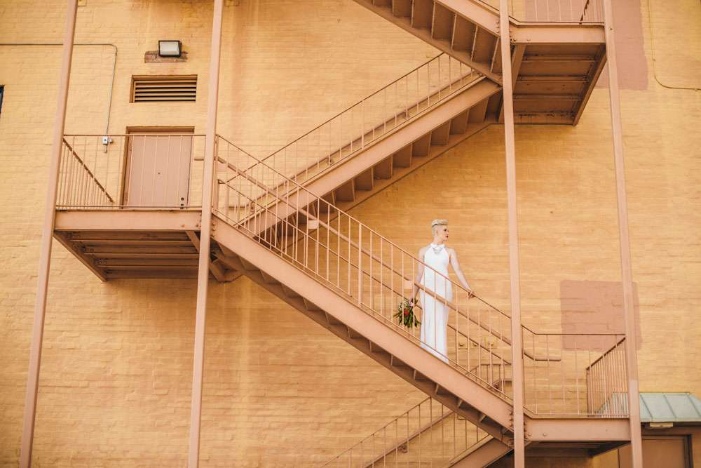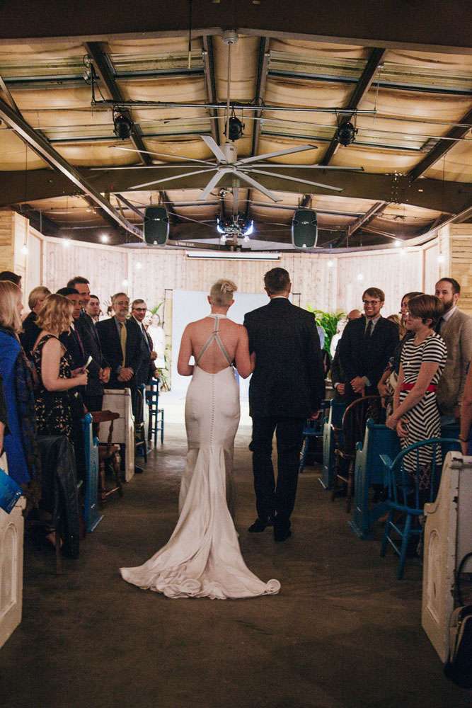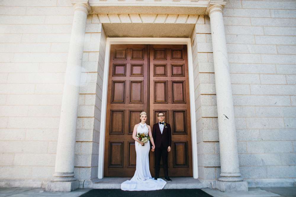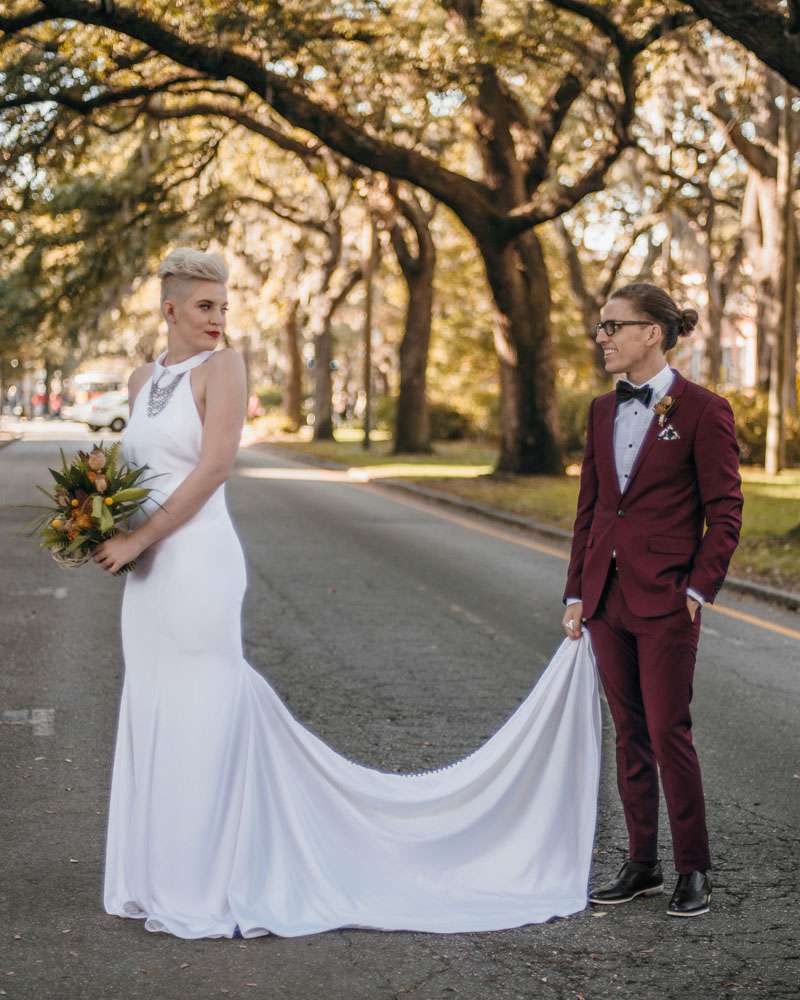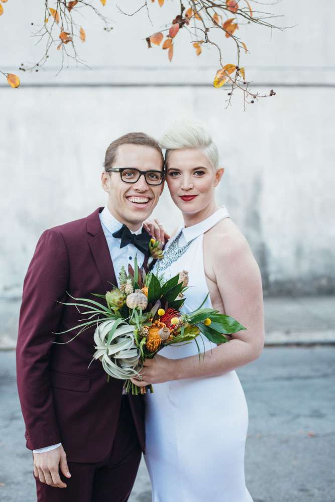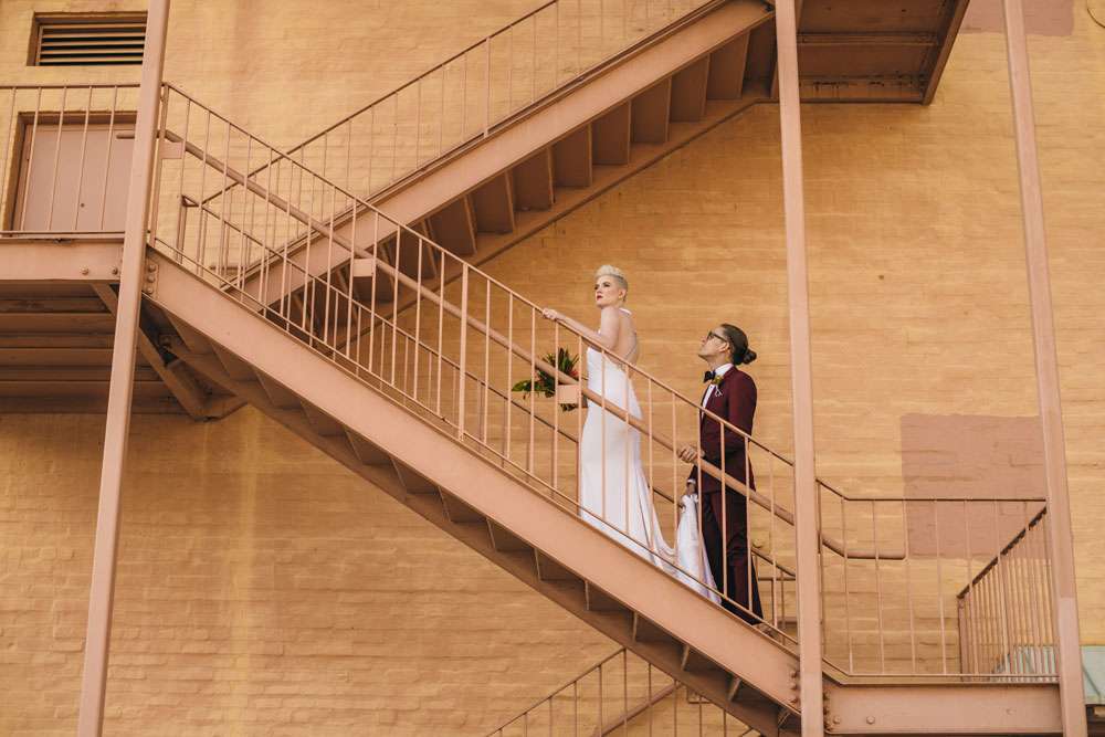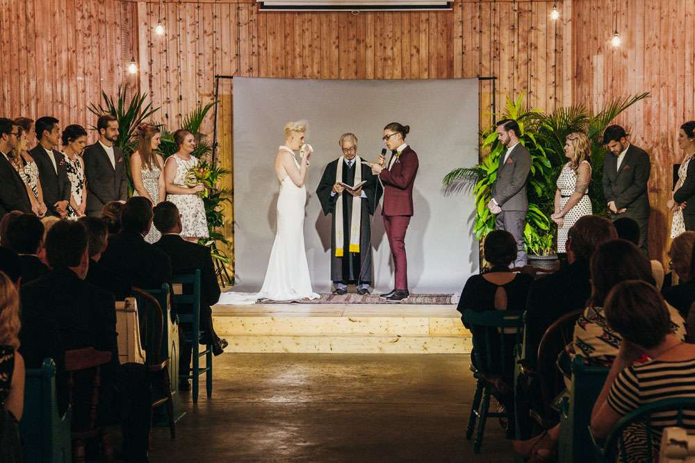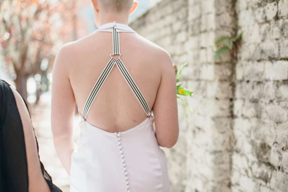 The bride designed her own dress with help from her friend, Kourtney Wilson. She wanted to feel like herself and that meant nothing too girly. “I always knew I wanted to design my own dress but the possibilities were endless. As an androgynous girl wedding dresses have never felt like my style, so we decided to bring menswear elements into the dress. A high collar and my favourite part, suspenders in the back, all with a super form fitted bodice. If you’ve got it flaunt it, especially on your wedding day. I also made my own headpiece.”