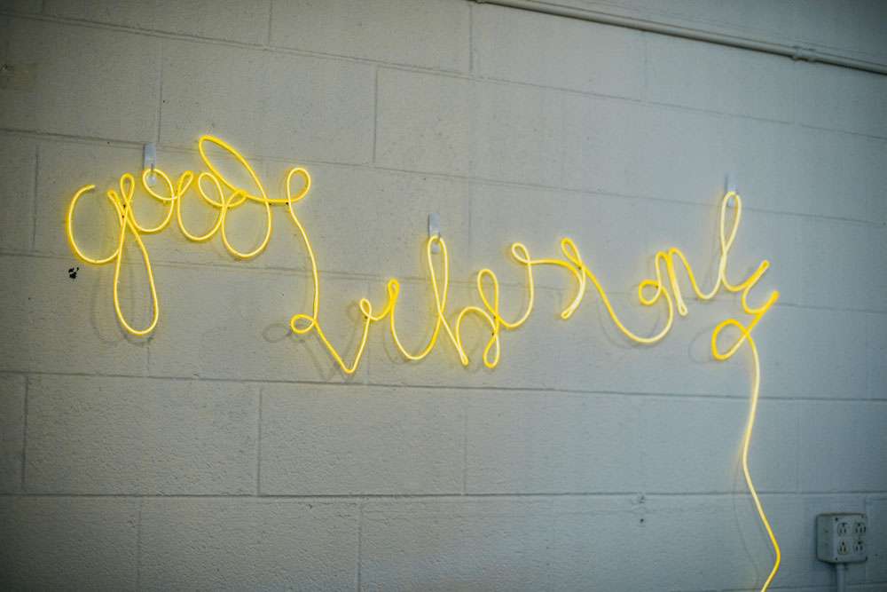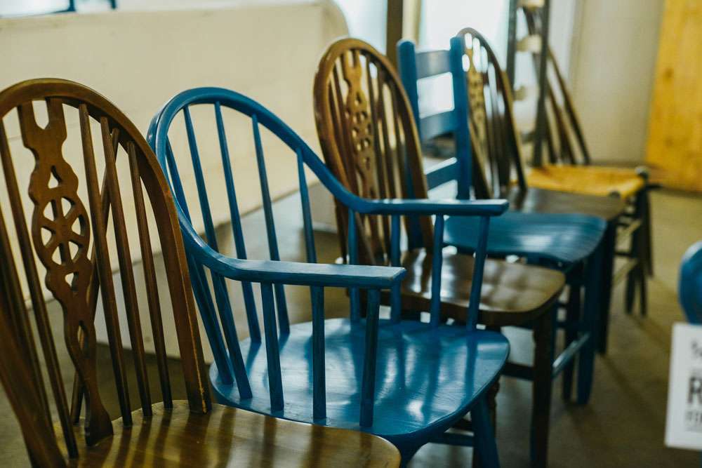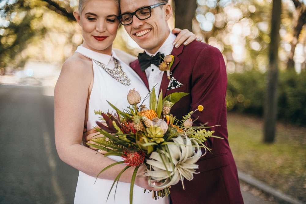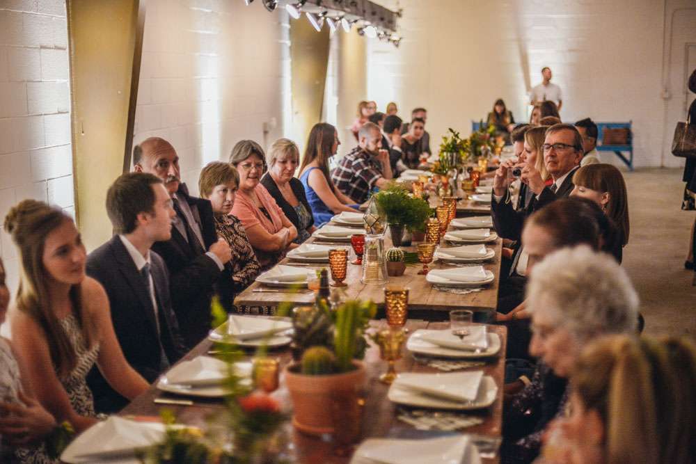 “We made three neon looking signs to place throughout the venue”, she continued. “We rented vintage chairs to create a ‘living room’ for people to relax and chat in. We also created an art installation in one of the corners with about 30 colourful paper lanterns. For the tables we had gathered a bunch of random glassware, pots, trinkets from my grandparents house during their move and Ivory & Beau beautifully incorporated these items in with succulents and other greenery. At the entrance, we had a small table with artwork from our lives like a poster from the concert we met at as well as little caricatures of us drawn by Stephanie.”
