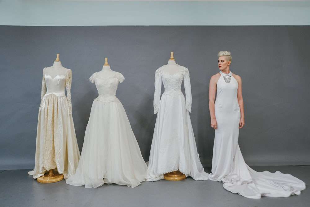 “We didn’t see most of the work until the day of and Nick and I both created pieces for the gallery ourselves (I painted a portrait and Nick put together a reel of home movies shot on Super 8 as well as some Polaroids of us throughout the years). It was amazing to see our community expressed in this way that feels so true to who we are. All of that artwork is now displayed in our first apartment together. Also in the gallery was a display of the past three generations of my family mothers’ wedding gowns on dress forms displayed next to their formal wedding portraits.”
