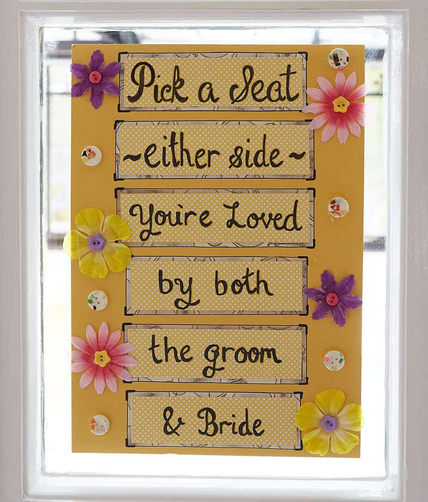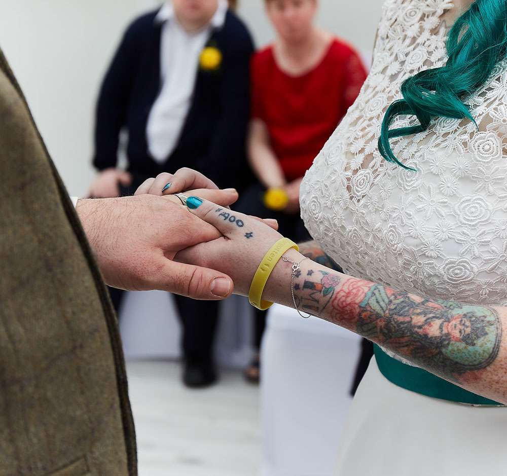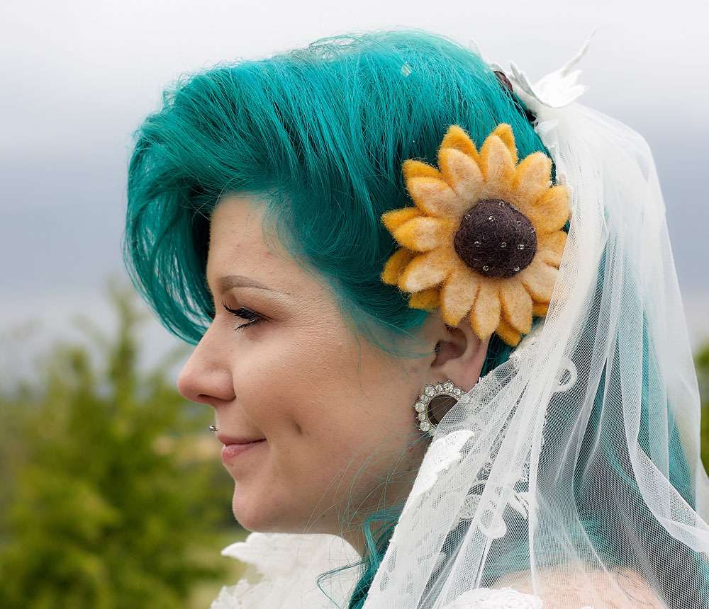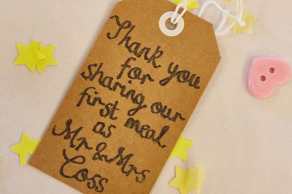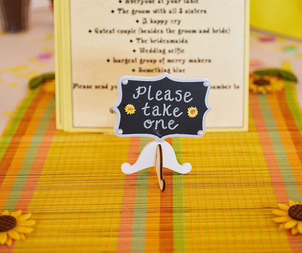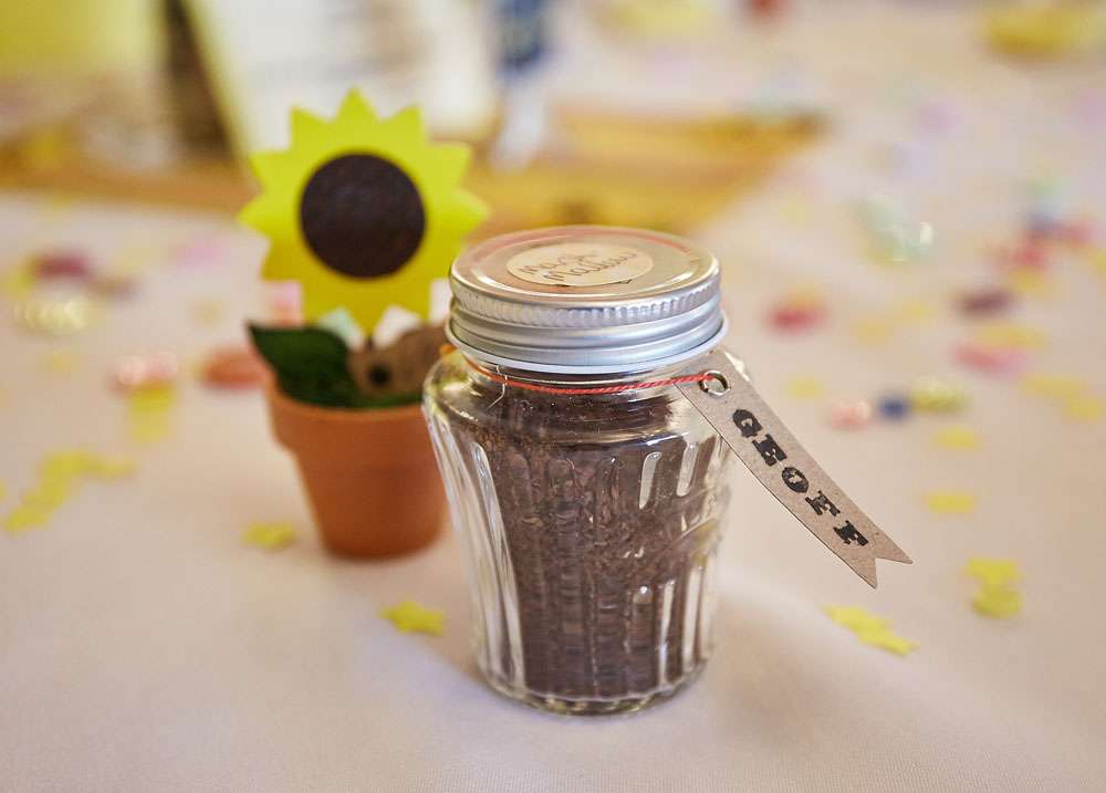 Almost everything at the wedding was DIY. “We are both creative people and wanted to express this. We made the favours for the women (mini canvases on easels embroidered with love quotes), all the signs (including the post boxes for cards and the road sign to show guests where the wedding was), the embroidered décor for the waiting area by the ceremony room, small scrolls with facts about the table names on for each guest, the stationery and some bunting. We made the guest book out of a scrapbook and our bride and groom name places were modified from things we found in charity shops. I made the sunflower in my hair out of felt, and our wedding rings were made by our friend, Helen, who is a silversmith. For the table decorations we used vintage milk bottles with a paper hot air balloon hanging from it and a handmade sign on top showing the names, with buttons and yellow stars as table scatterings.”