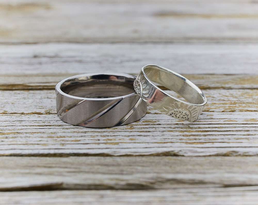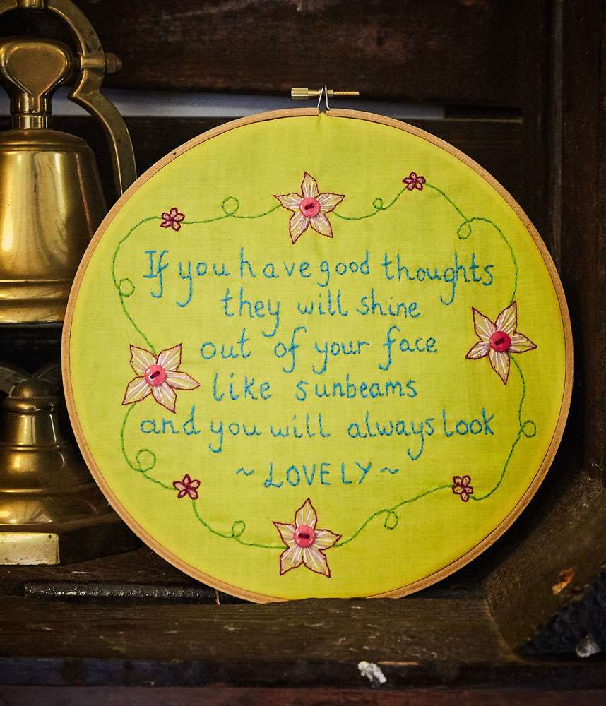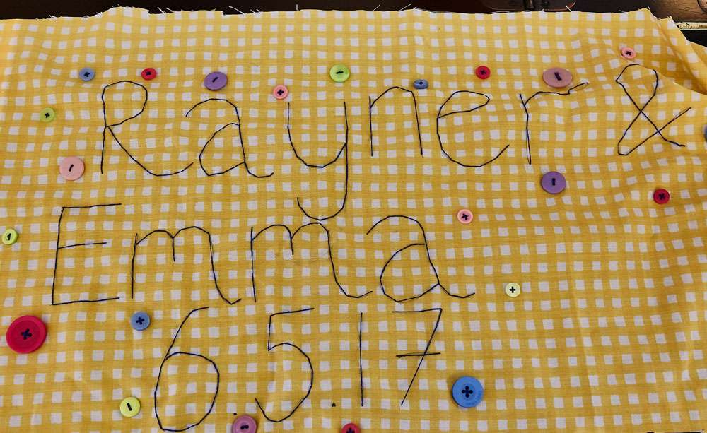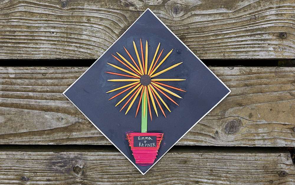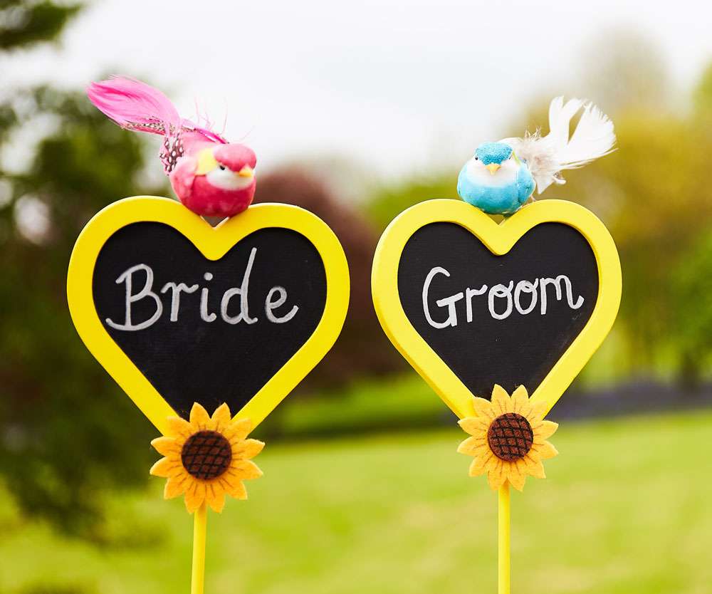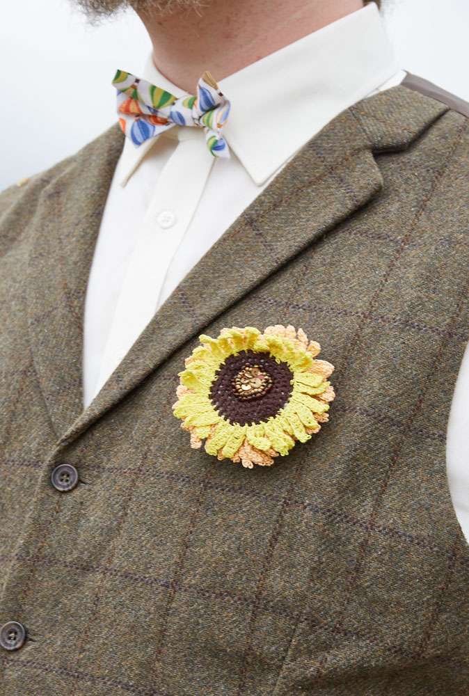 Almost everything at the wedding was DIY. “We are both creative people and wanted to express this. We made the favours for the women (mini canvases on easels embroidered with love quotes), all the signs (including the post boxes for cards and the road sign to show guests where the wedding was), the embroidered décor for the waiting area by the ceremony room, small scrolls with facts about the table names on for each guest, the stationery and some bunting. We made the guest book out of a scrapbook and our bride and groom name places were modified from things we found in charity shops. I made the sunflower in my hair out of felt, and our wedding rings were made by our friend, Helen, who is a silversmith. For the table decorations we used vintage milk bottles with a paper hot air balloon hanging from it and a handmade sign on top showing the names, with buttons and yellow stars as table scatterings.”