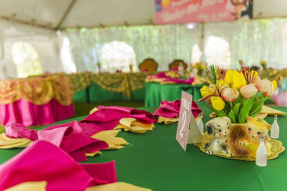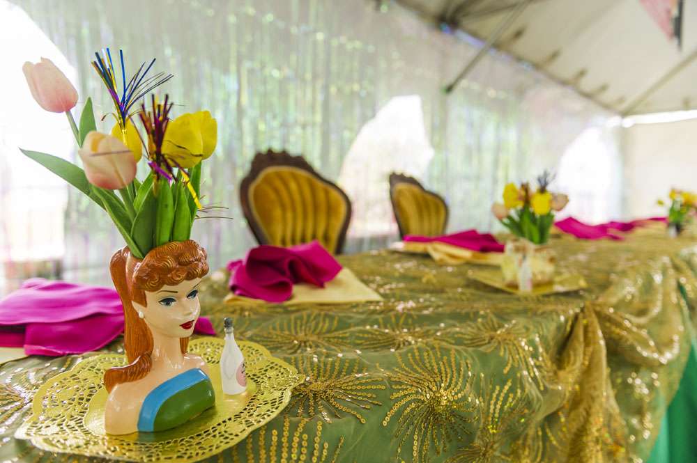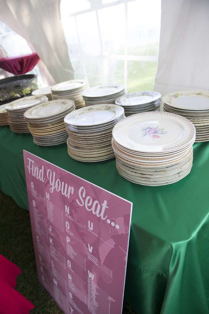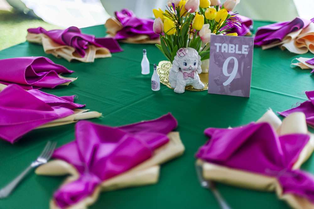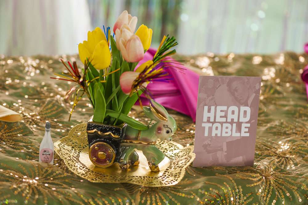 “For decor we had assorted 1950s ceramic anthropomorphic/novelty planters with tulips and tinsel. We also had authentic life-sized carousel horse for our homemade photo booth (borrowed from a family friend) and vintage mid-century velvet couches and chairs. The plates were mix n match vintage dinner plates.”