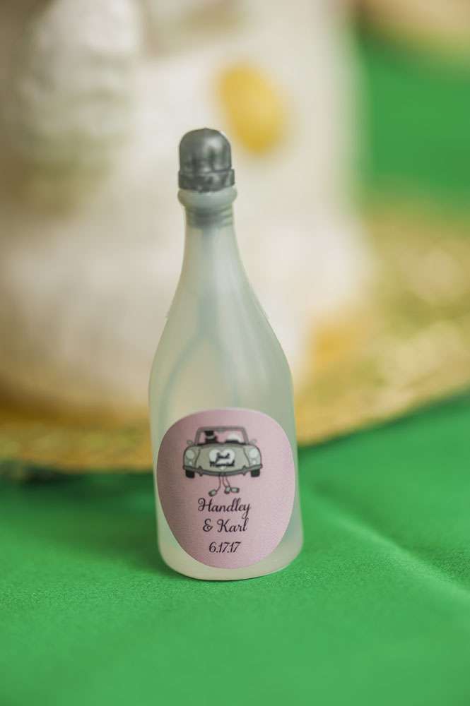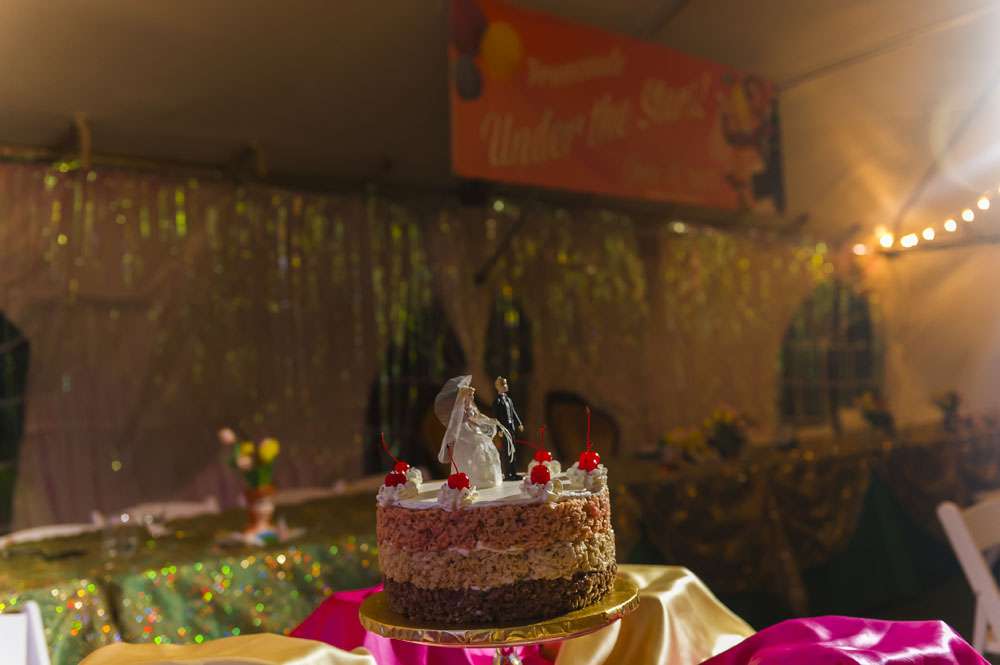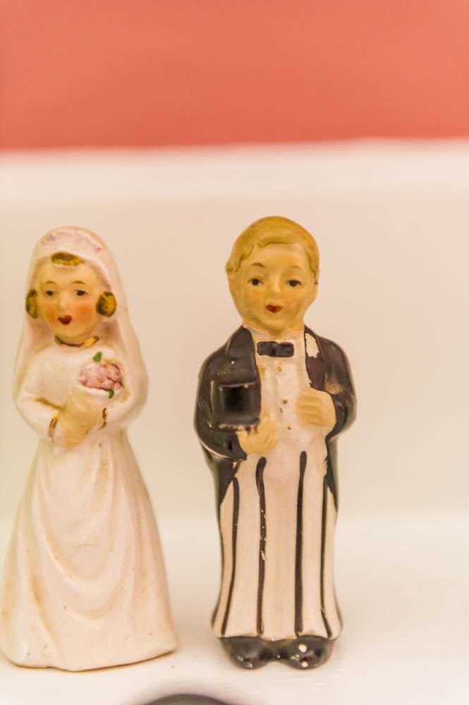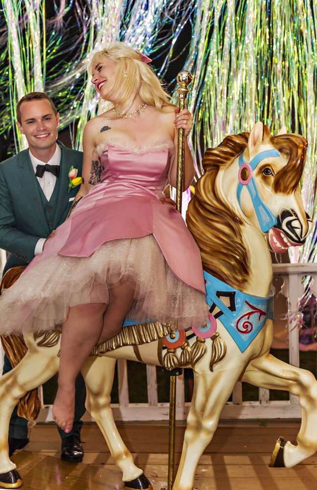 As well as making her own outfit, the bride did lot of other DIY projects. “We made all our bouquets and boutonnières from artificial flowers purchased on Amazon. The cake toppers were re-purposed vintage Ken & Barbie Christmas ornaments that I painted to have the right hair colour to match the groom. Our table arrangements were the result of months of antique shopping to gather adorable vintage ceramic planters. Our groomsman, Steve, did the photo booth set up, using an authentic carousel horse borrowed from a family friend.”