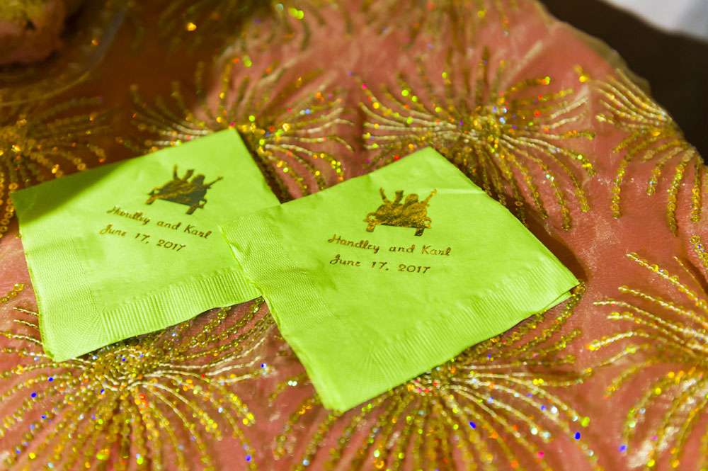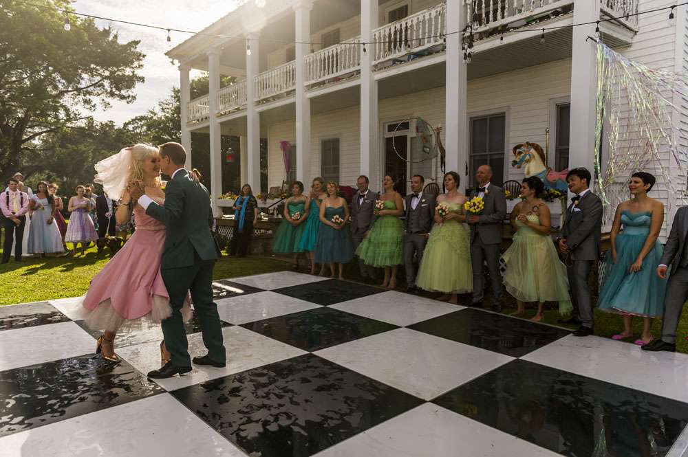 “I love colour and sparkle, and we both love the classic timelessness. Neither of us have ever been very traditional, and this was the perfect time for us to show that. I never wanted the white dress or the elegant up-do. We live in a world of bright colours and our wedding showed that. Plus, that gorgeous black and white dance floor even tricks folks into thinking we’re classy!”