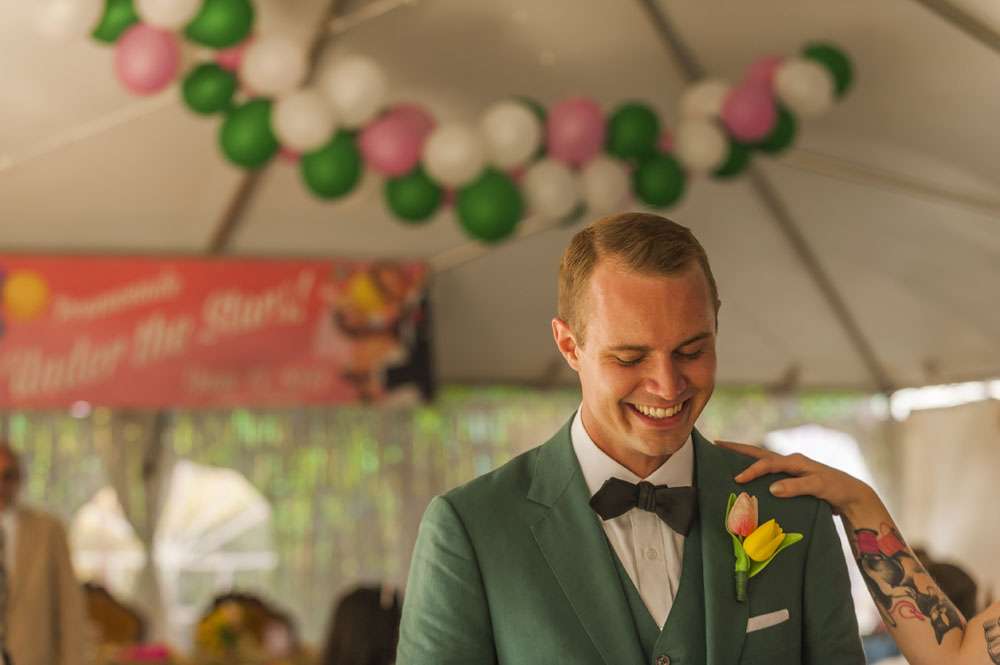 The bride designed and made her own dress, veil and garter and the bridesmaids were in genuine 50s vintage dresses. “I am a fashion designer (Hiccup by Handley, based in Minneapolis MN)”, she explained, “So I made a dress with 1950s prom inspired silhouette. The best part was it only cost me $200 in materials. My shoes were from ASOS and my jewellery was vintage aurora borealis style costume jewellery from the 50s. My bridesmaids were in assorted 1950s prom dresses, hand-dyed various shades of green by myself. One bridesmaid, Emkae Olson, is also a designer and made her dress by mimicking vintage construction techniques (hers is emerald green with a crumb catcher along the bustline).”