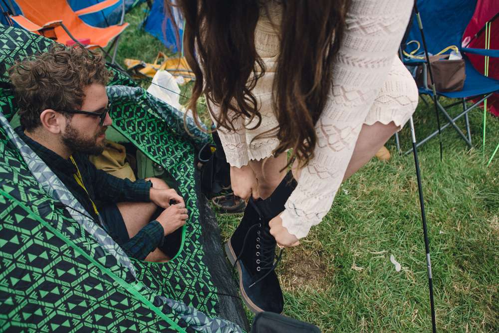 The couple made their own handfasting cord from coloured rope with wood block type on it, and their own besom (broom) to sweep the floor for their handfasting ceremony from a pole they bought at Glastonbury a few years ago and twigs from their garden. Gaia fondly remembers the ceremony at their favourite festival, “We met up with friends and walked up to meet the celebrants for the first time. They were just as lovely as we imagined. They told us they had organised us a piper and had a great location for us in the tipi field. We then heard bagpipes and went up to the field to find a crowd of about a hundred people had already gathered to watch us be handfasted! The setting was better than we could ever have hoped for, and having some of our friends to celebrate with us there was amazing. Afterwards, we ate macaroni cheese and had our first dance at the Stonebridge bar among the crowd.”