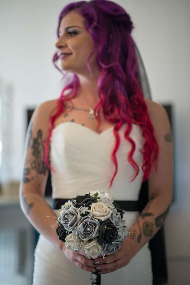 “The wedding theme was very personal to us, having a gothic twist with a shade of pirate”, she continued. “My husband and his best men ere all in their pirate swagger and I wore a gothic wedding dress and had bright purple hair.”