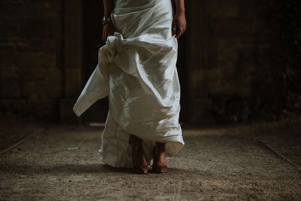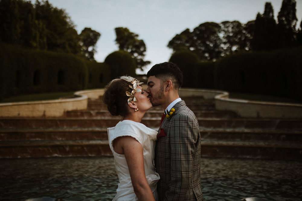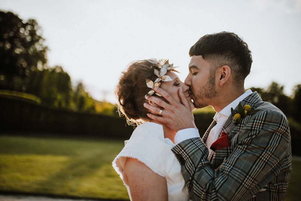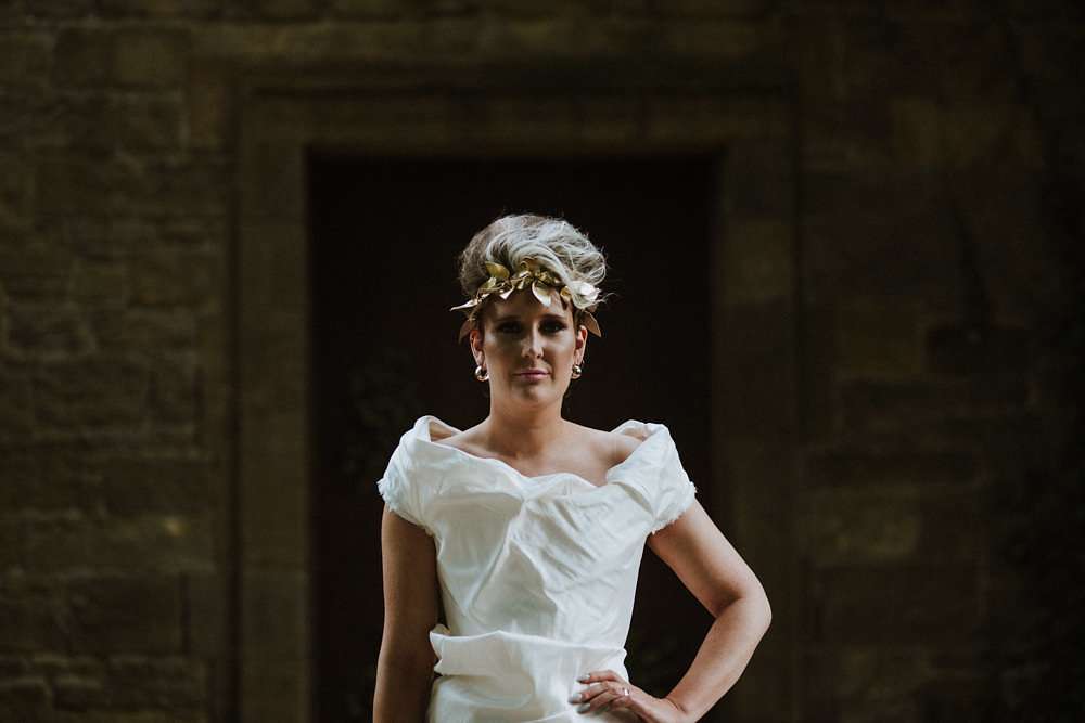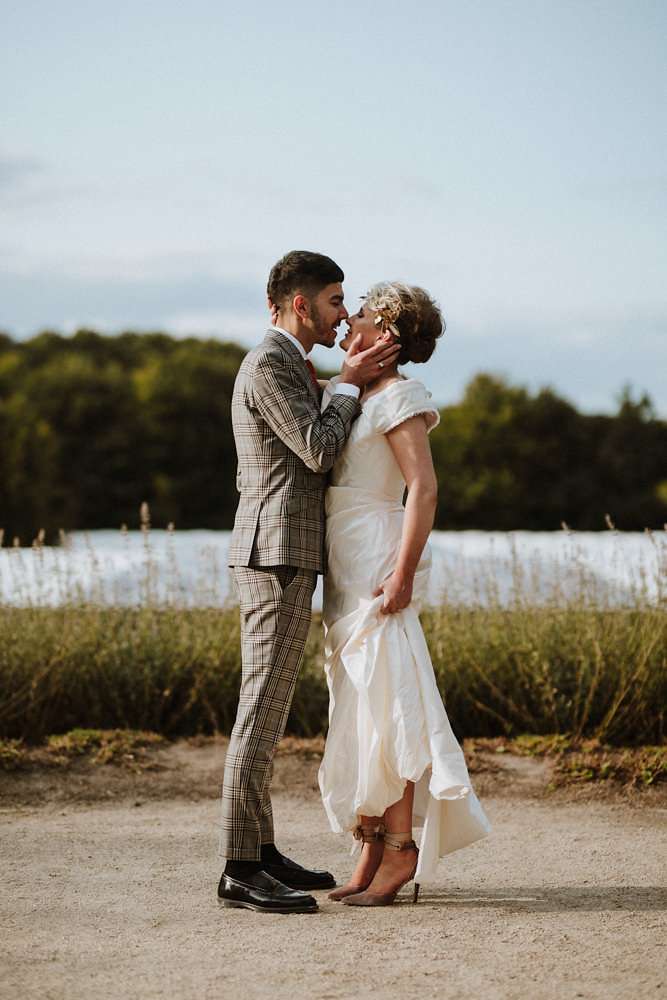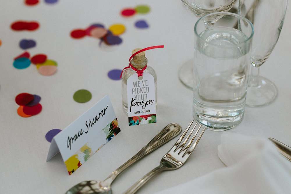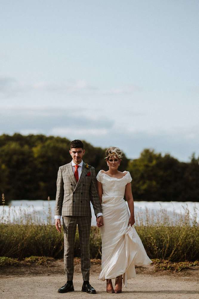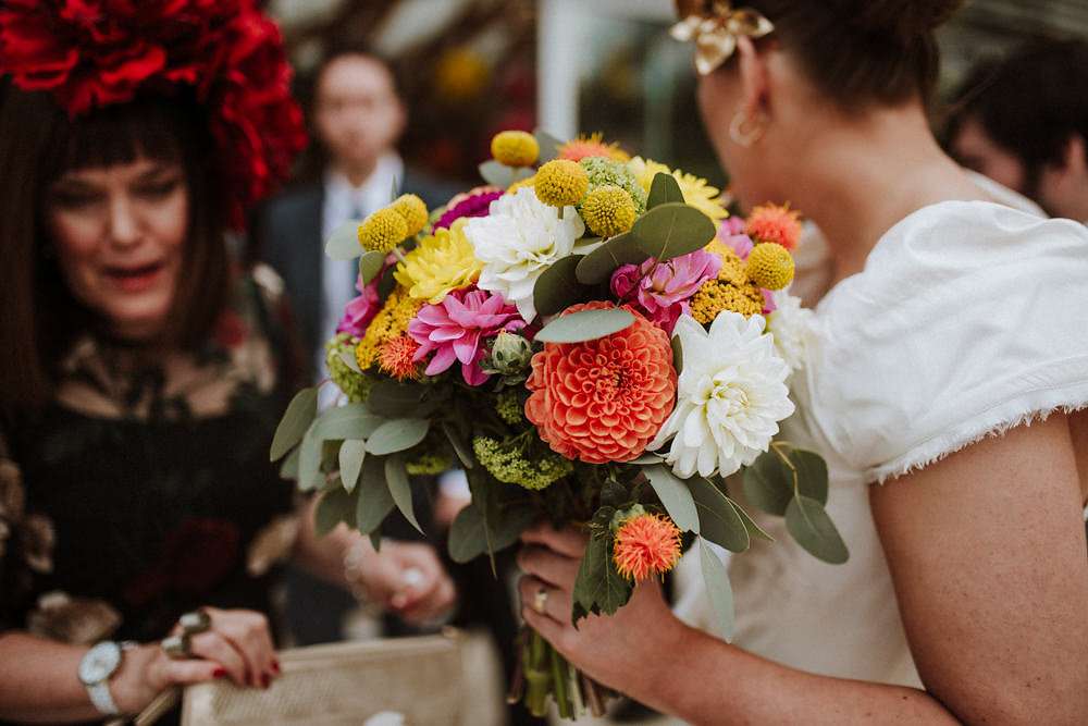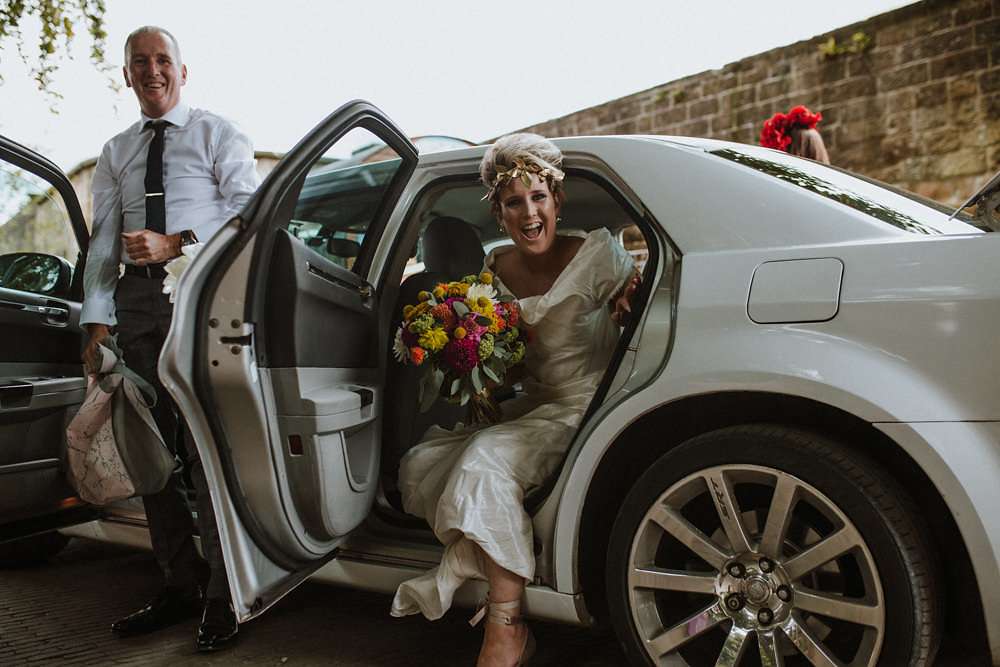 Grace and Stephen’s summer wedding was contemporary and colourful. They wanted it to be as modern as possible, without a hint of stuffy formality. Overall they wanted to create a really good party and the bride knew she wanted to wear Vivienne Westwood from the outset. “I’ve been such a fan of hers for ages”, she said, “and I once worked at her store, so I knew exactly what I’d go for. All the accessories were bought to compliment it too!”