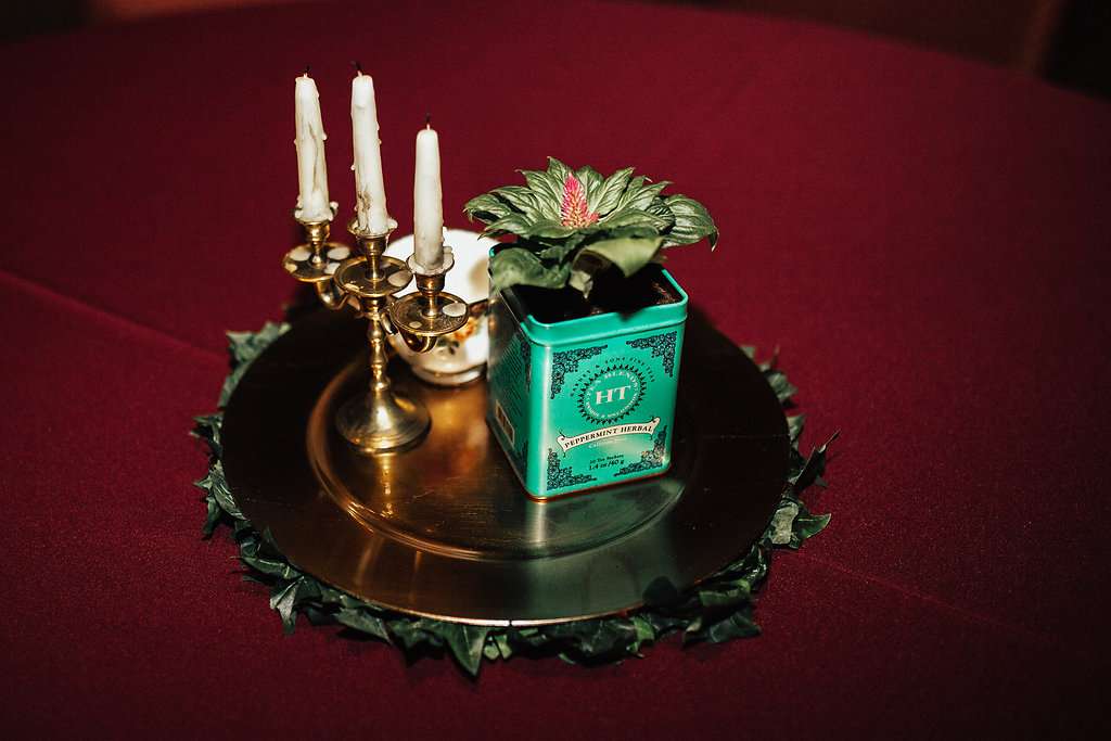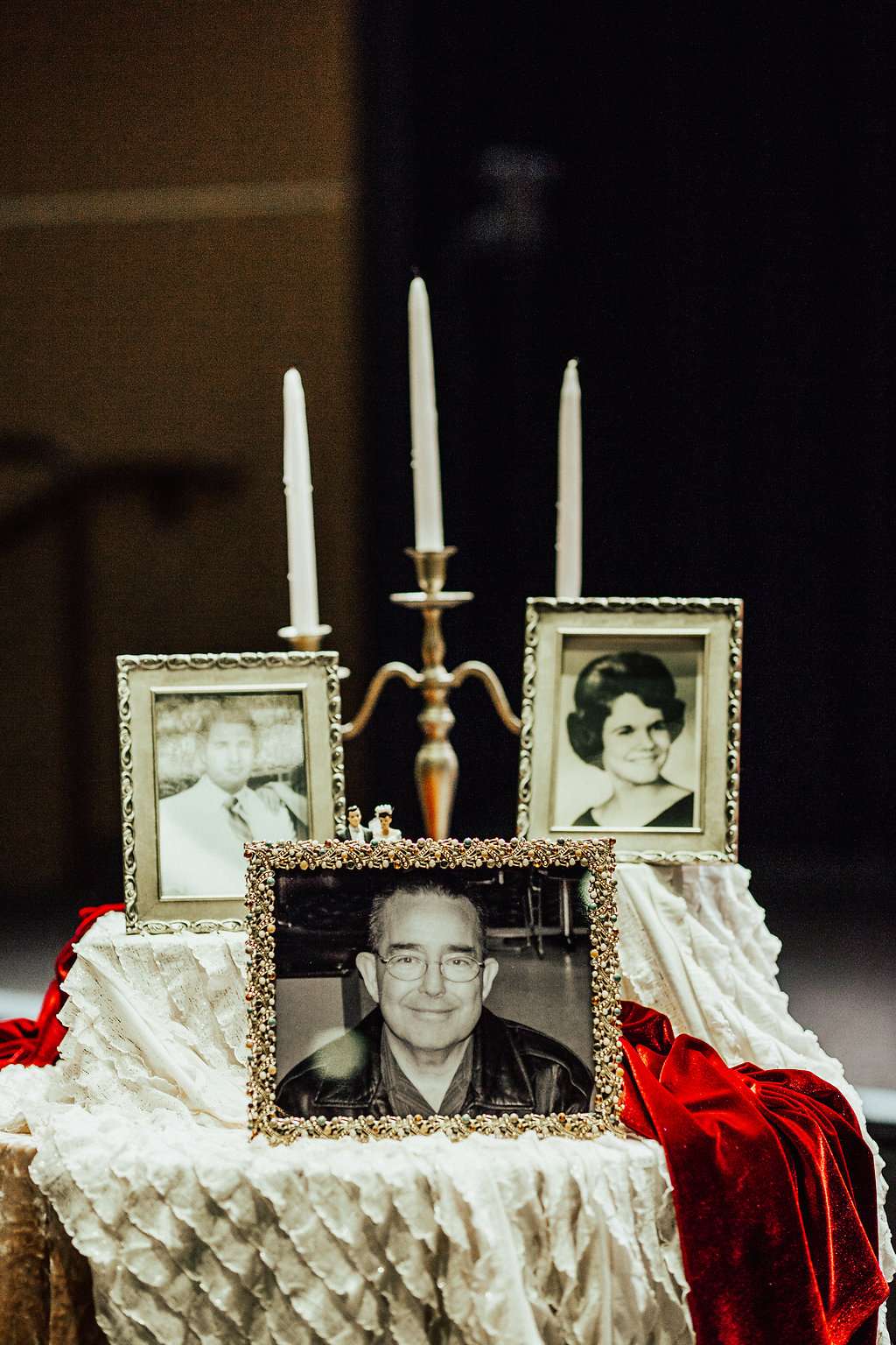 “All the centerpieces were DIY”, she explained. “The most fun project we did was when my mom had the idea to melt the taper candles so they would have drippy wax details and look more romantic. Several of my bridesmaids were torching candles at the venue, even our photographer helped out! My favorite DIY that I did personally was draping the different fabrics over the tables, especially the memoriam table which featured portraits of our late grandparents.”