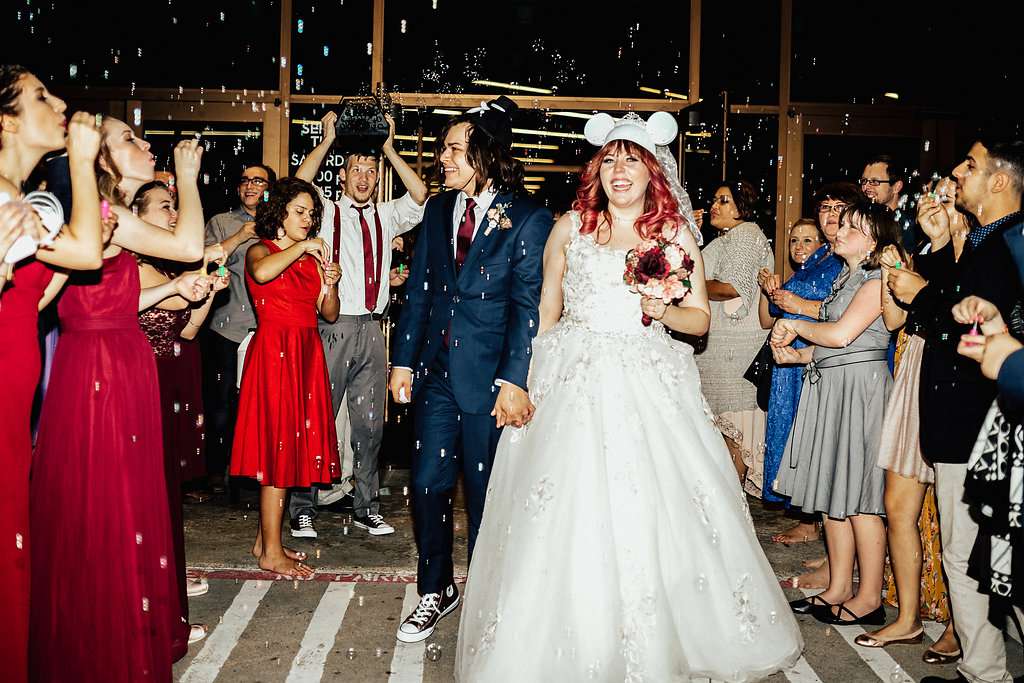 They created their own centerpieces and did most of the reception decor themselves. As they’re huge Disney lovers (they had their engaged shoot there and they headed back for their honeymoon!) they also had a few detail nods to Disney such as the grape soda pin from Up! on the groom’s outonnière, Beauty and the Beast inspired ceremony and reception decor, and their Mickey and Minnie ears as they exited their reception into a sea of bubbles!