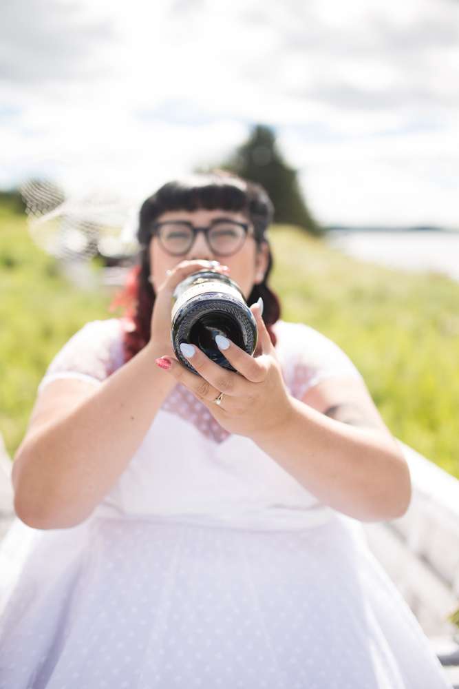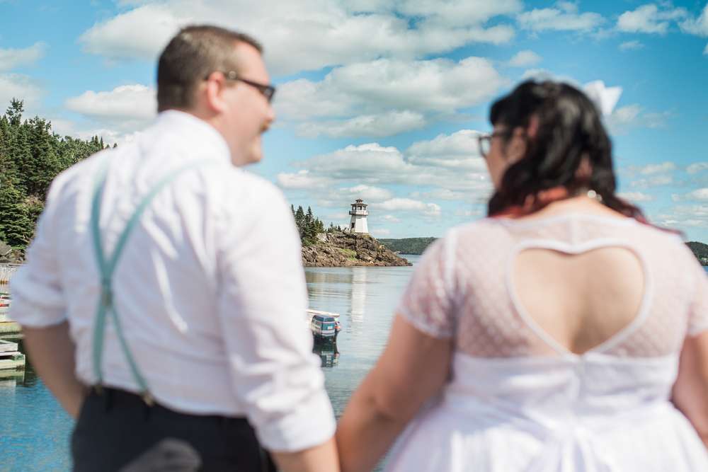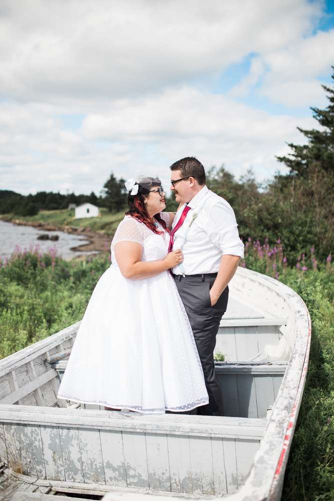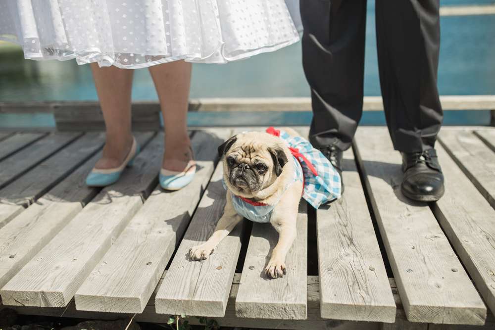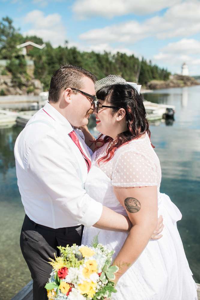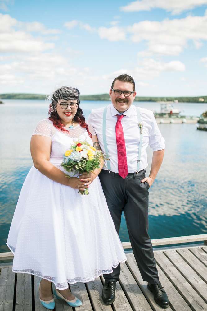 The ceremony was held in the groom’s family back garden. “It is a cottage right beside the ocean. Drew’s dad, who is a Master Mariner, married us (while in uniform), which tied in with our nautical theme. Our love for post-punk and new wave music showed during the ceremony, which featured songs by the Talking Heads, The Cure and Modern English. Neither one of us is particularly religious, so we chose secular readings that represented how we feel about each other. We wrote heartfelt vows to each other and teared up while reading them. We also let our pug, Sassy, roam around while we were getting married and she ended up walking me down the aisle with my parents and leading the recessional at the end.”
