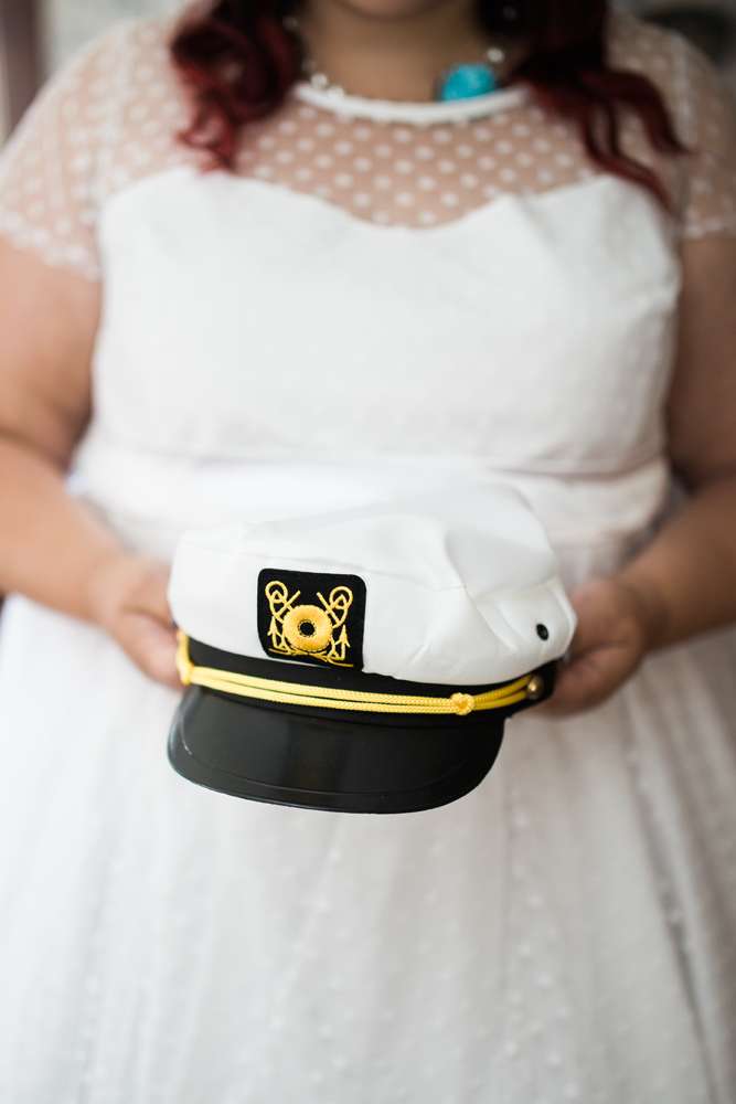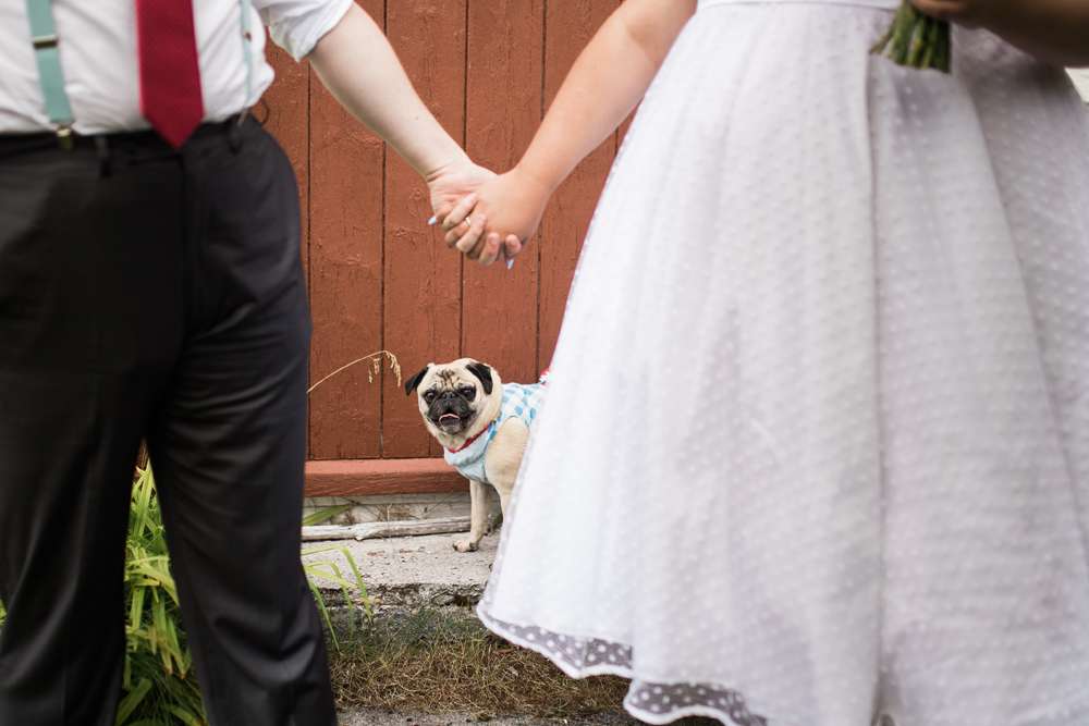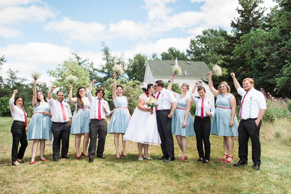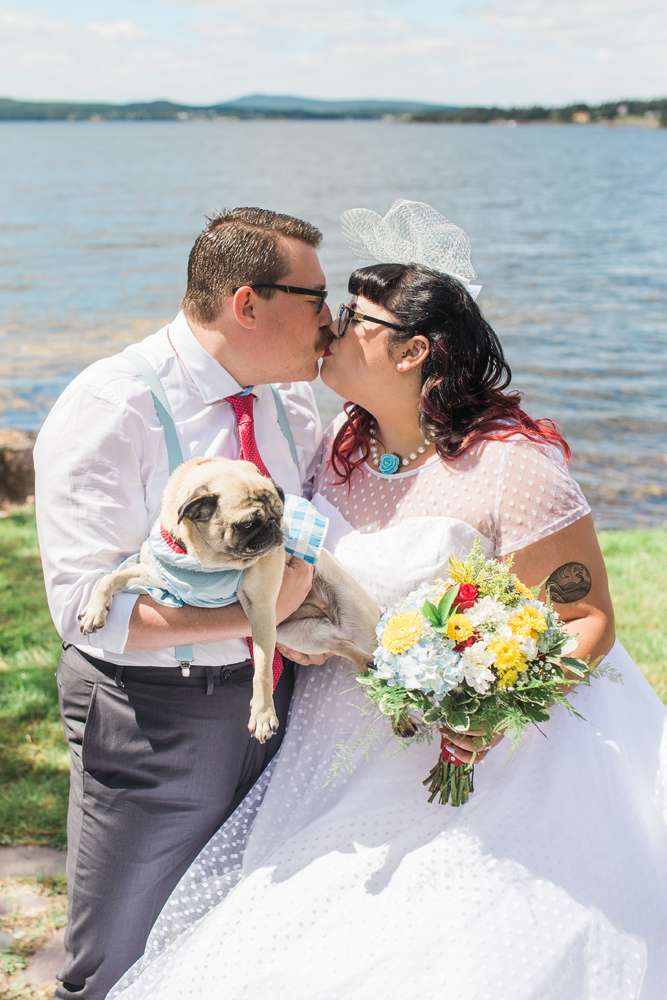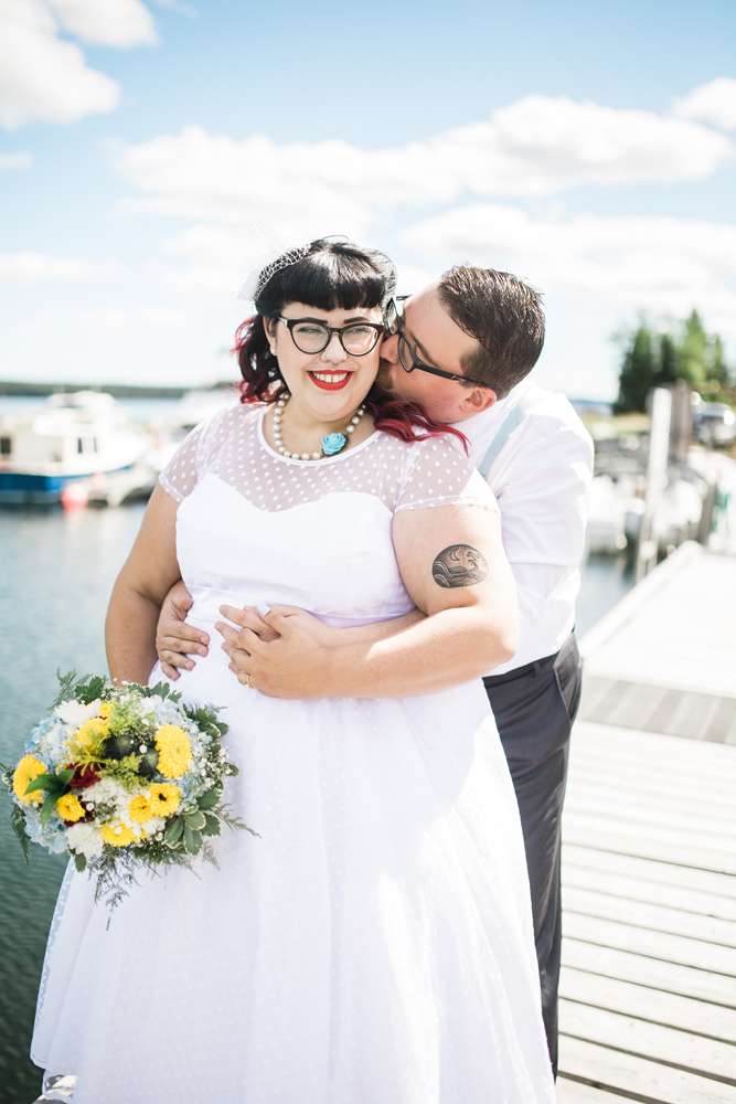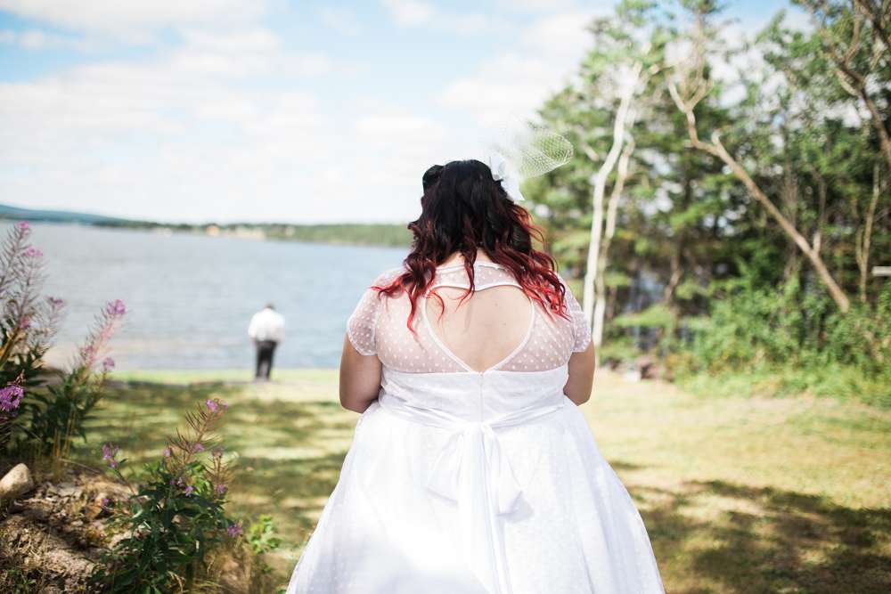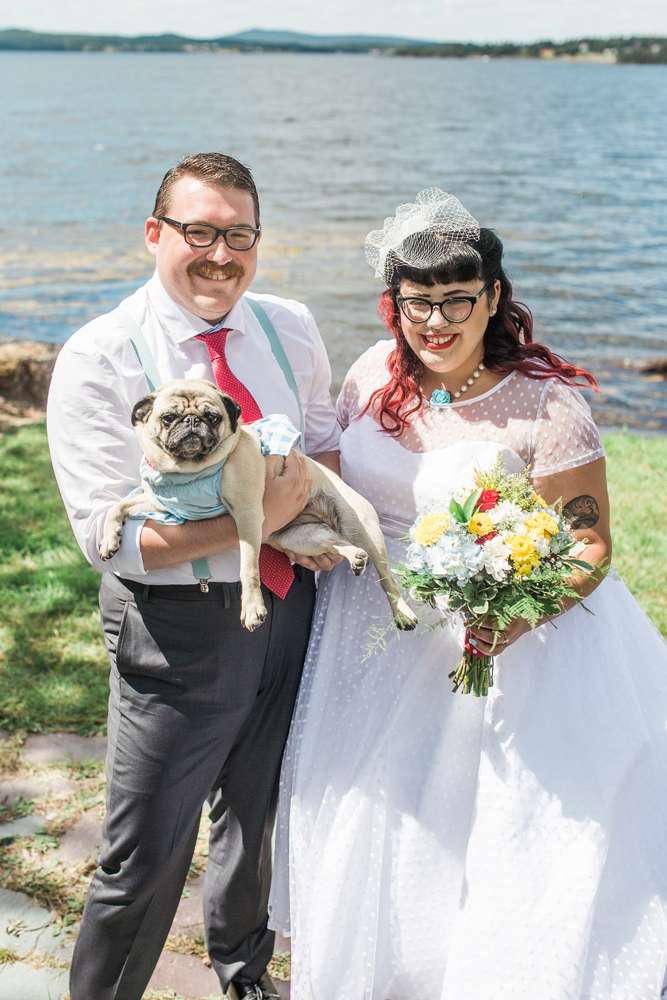 The ceremony was held in the groom’s family back garden. “It is a cottage right beside the ocean. Drew’s dad, who is a Master Mariner, married us (while in uniform), which tied in with our nautical theme. Our love for post-punk and new wave music showed during the ceremony, which featured songs by the Talking Heads, The Cure and Modern English. Neither one of us is particularly religious, so we chose secular readings that represented how we feel about each other. We wrote heartfelt vows to each other and teared up while reading them. We also let our pug, Sassy, roam around while we were getting married and she ended up walking me down the aisle with my parents and leading the recessional at the end.”