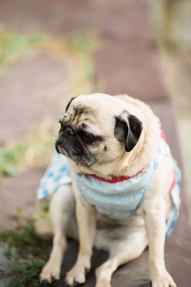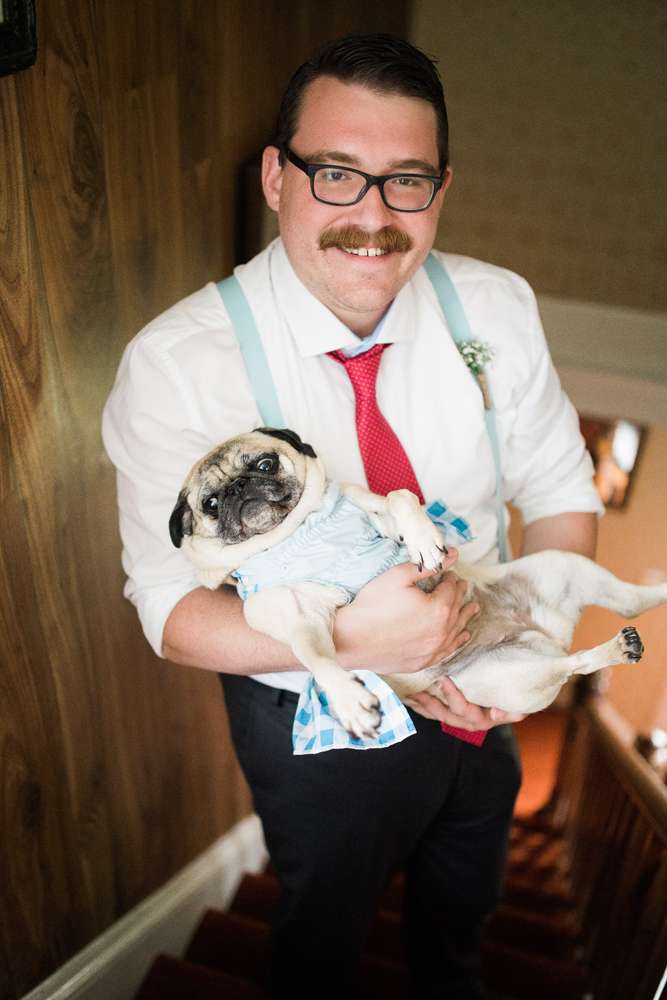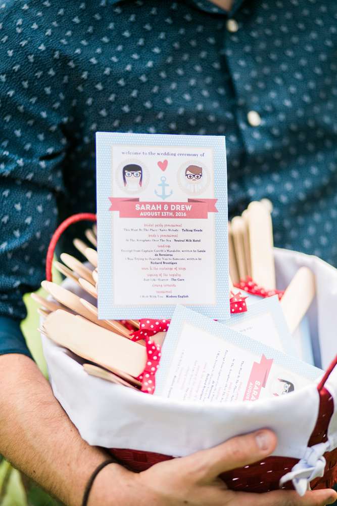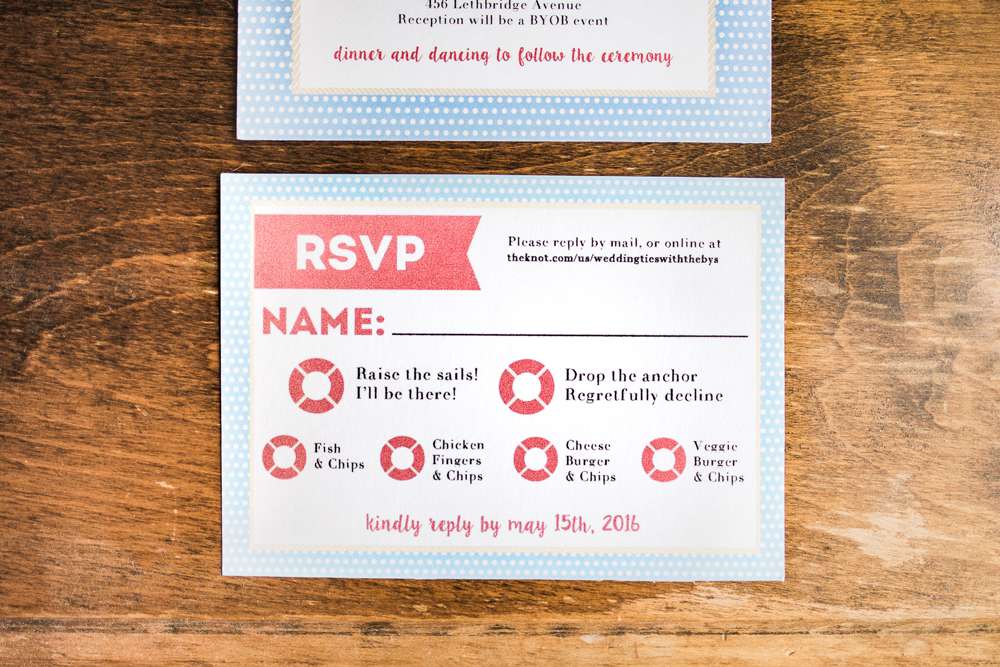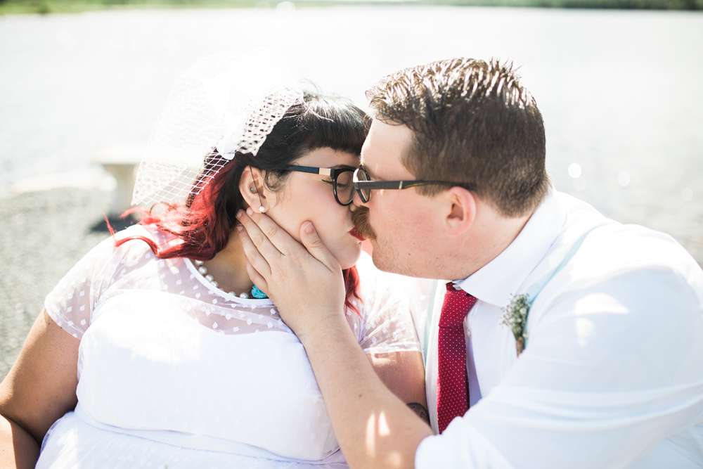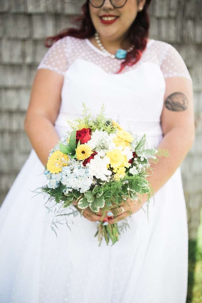 The ceremony was held in the groom’s family back garden. “It is a cottage right beside the ocean. Drew’s dad, who is a Master Mariner, married us (while in uniform), which tied in with our nautical theme. Our love for post-punk and new wave music showed during the ceremony, which featured songs by the Talking Heads, The Cure and Modern English. Neither one of us is particularly religious, so we chose secular readings that represented how we feel about each other. We wrote heartfelt vows to each other and teared up while reading them. We also let our pug, Sassy, roam around while we were getting married and she ended up walking me down the aisle with my parents and leading the recessional at the end.”