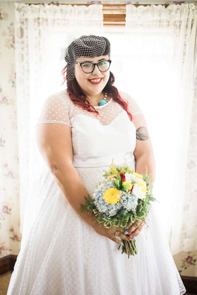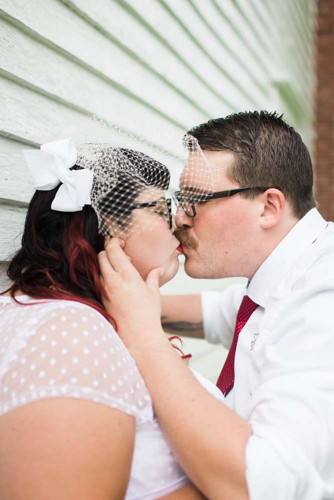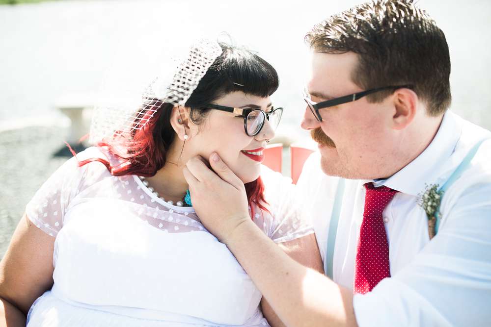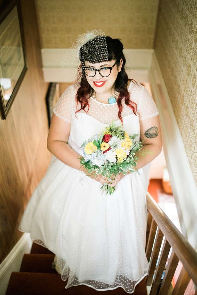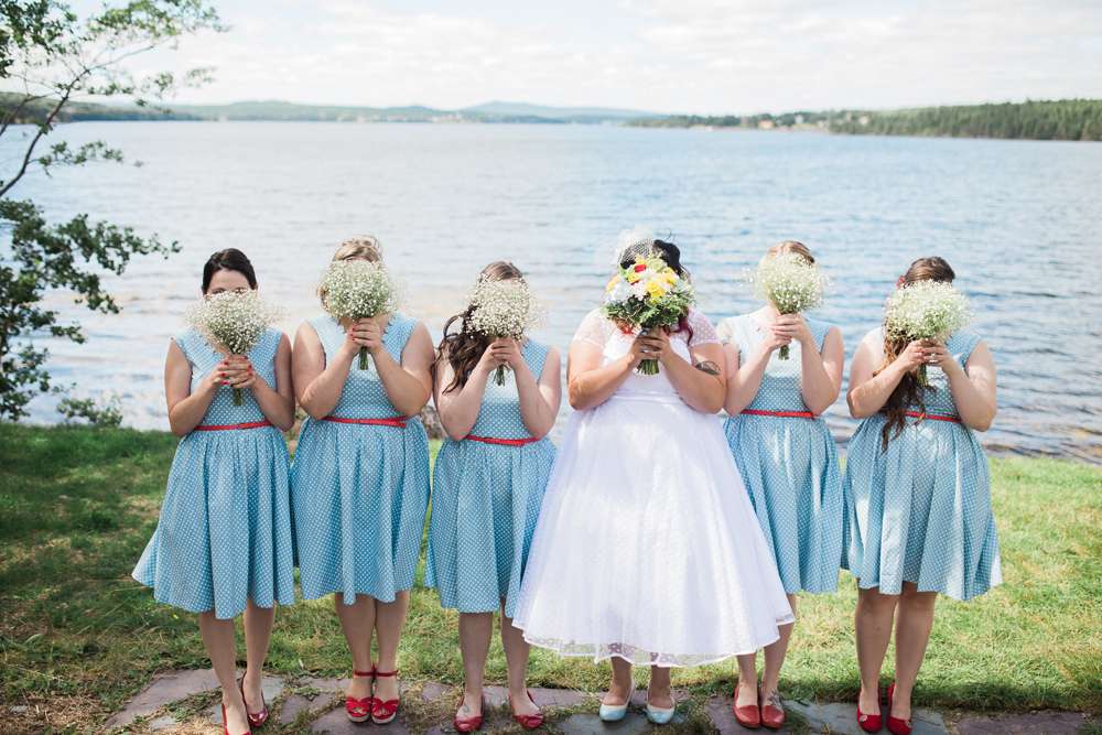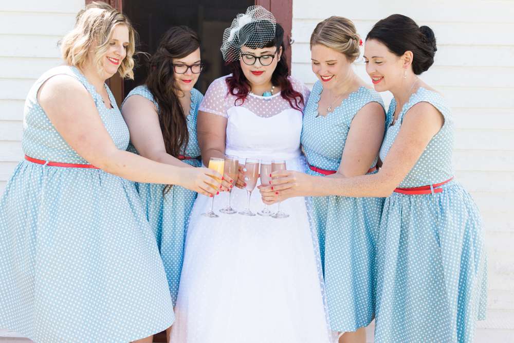 “We also wanted the wedding to have a retro vibe, and that was reflected in the outfit choices. I wore a tea length, polka dot dress and the bridesmaids were in short, polka dot dresses with scalloped necklines from Lindybop. The groomspeoples’ suspender and polka dot tie combination matched us perfectly.”