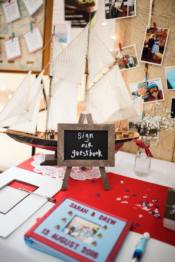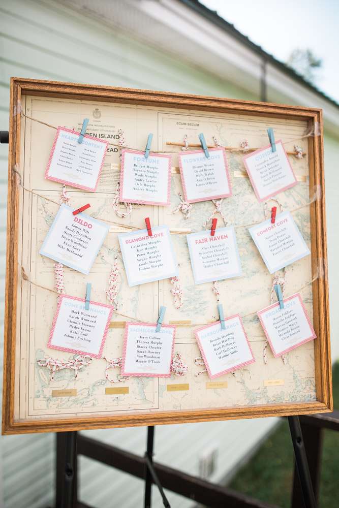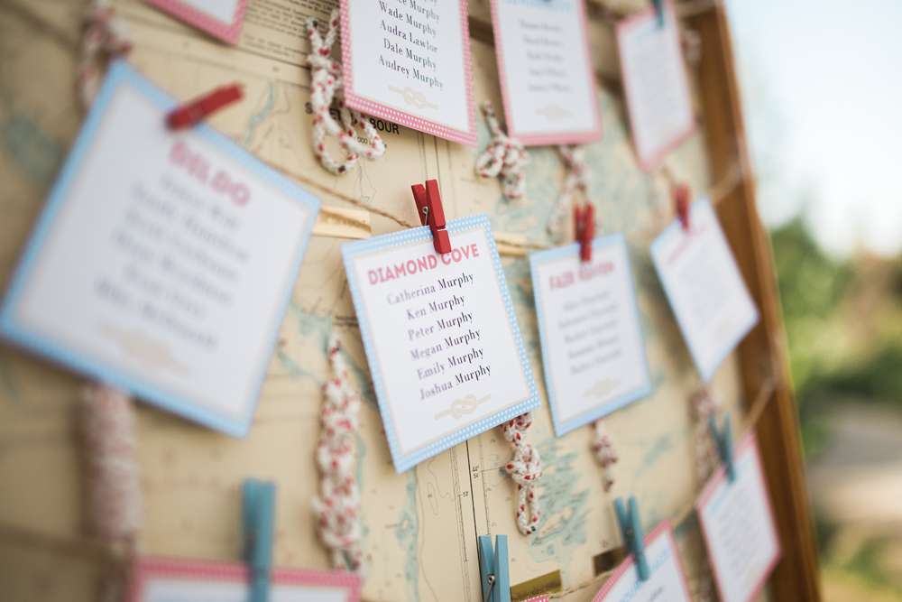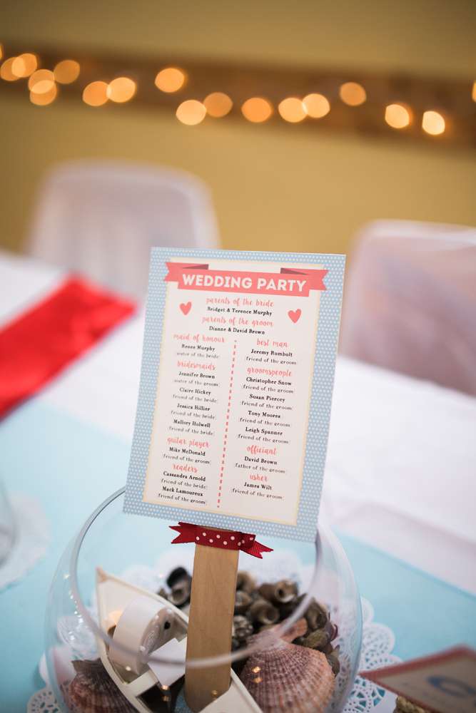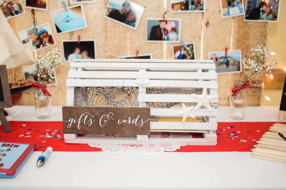 “My friends and bridesmaids helped make and customise so much of the decor. We made the knot balls that were placed on the table and banners for the candy buffet and receiving tables. We also assembled the centrepieces, painted and decorated the lobster trap, and Drew’s dad made seating chart and our head table backdrop from old pallets.”