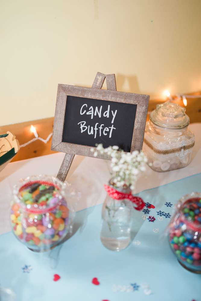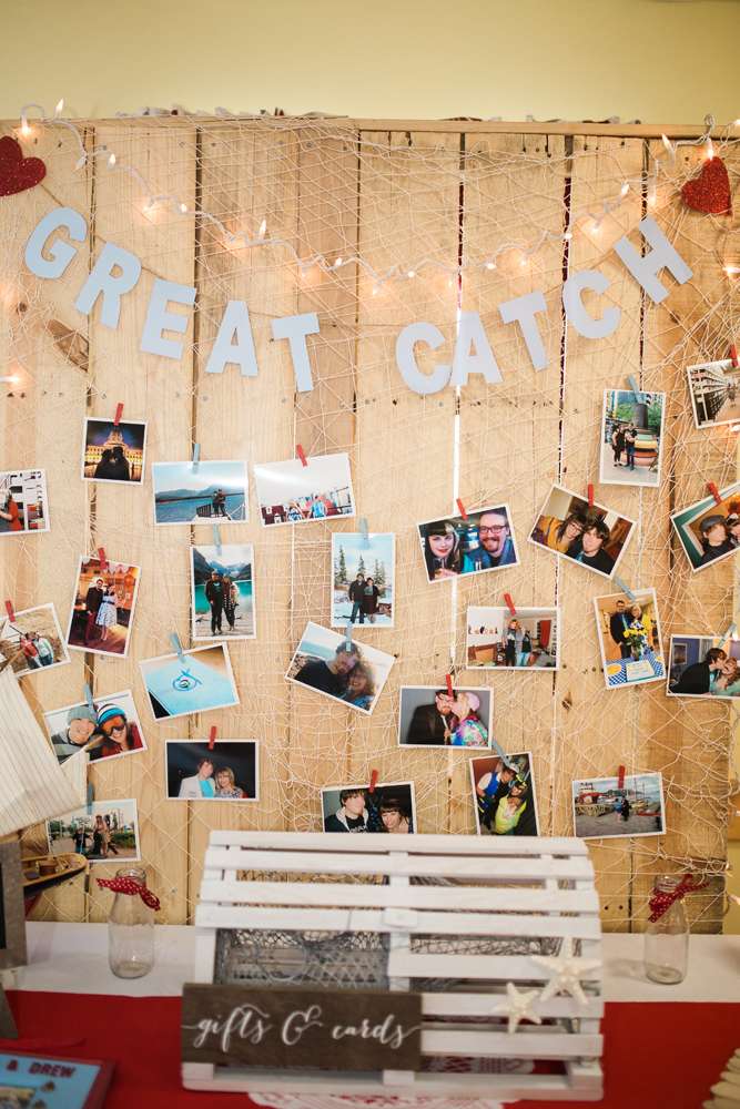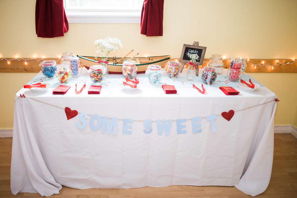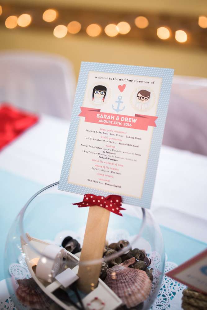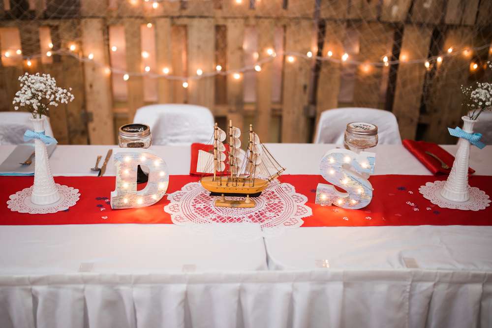 “My friends and bridesmaids helped make and customise so much of the decor. We made the knot balls that were placed on the table and banners for the candy buffet and receiving tables. We also assembled the centrepieces, painted and decorated the lobster trap, and Drew’s dad made seating chart and our head table backdrop from old pallets.”