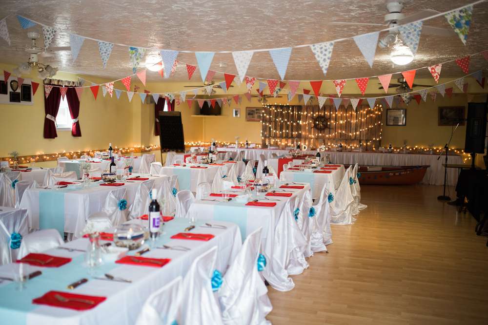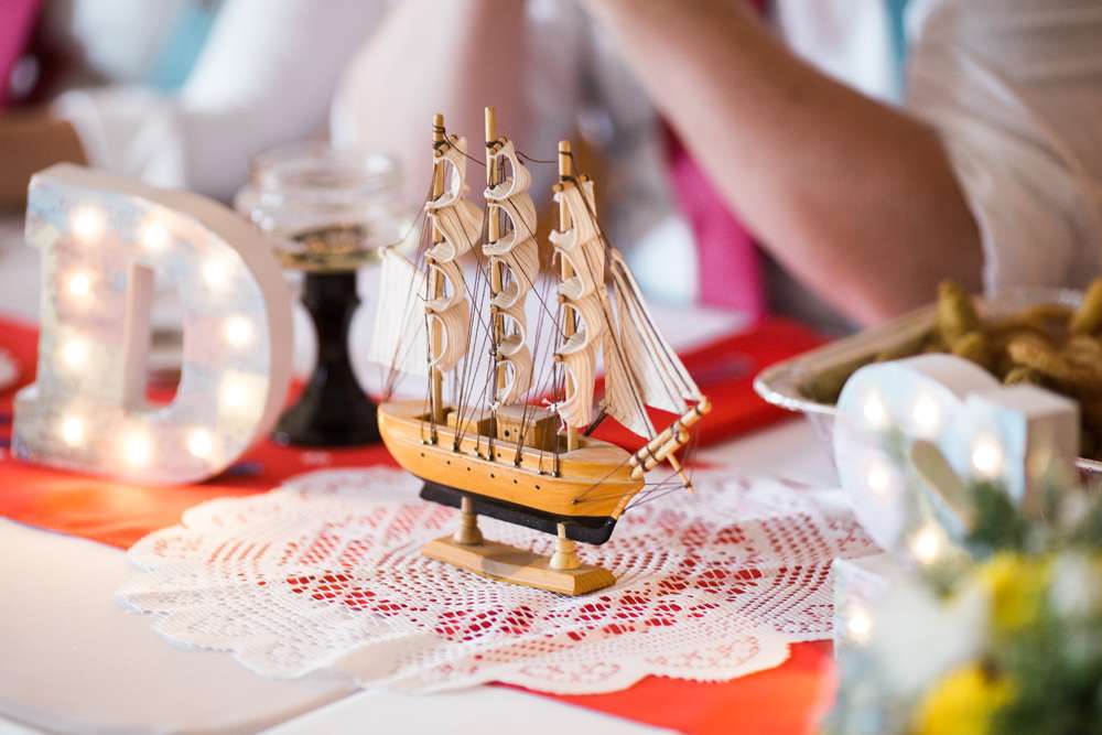 The reception décor, a lot of it homemade, featured lots of fun polka dot and floral prints. “We were inspired by many of the bold and brightly coloured weddings that we had seen in Rock n Roll Bride. We transformed the reception hall into the whimsical, nautical event we had envisioned.”