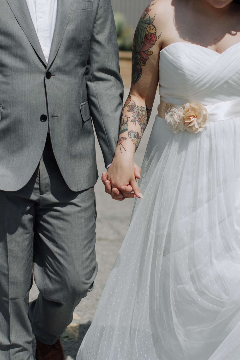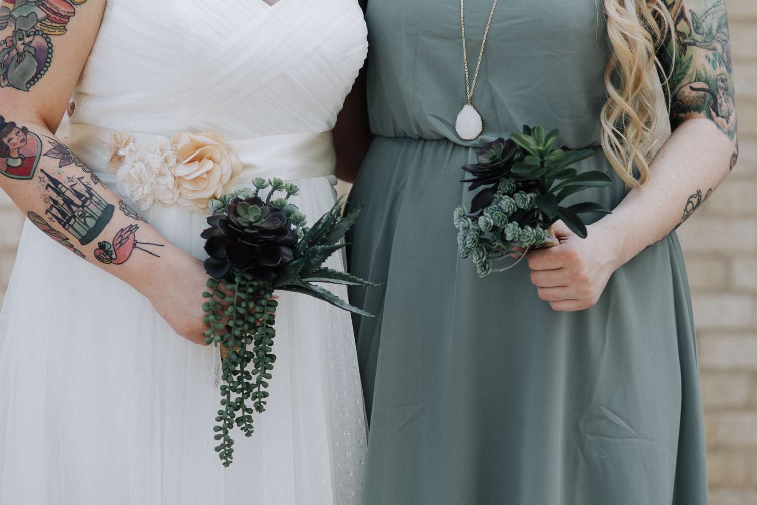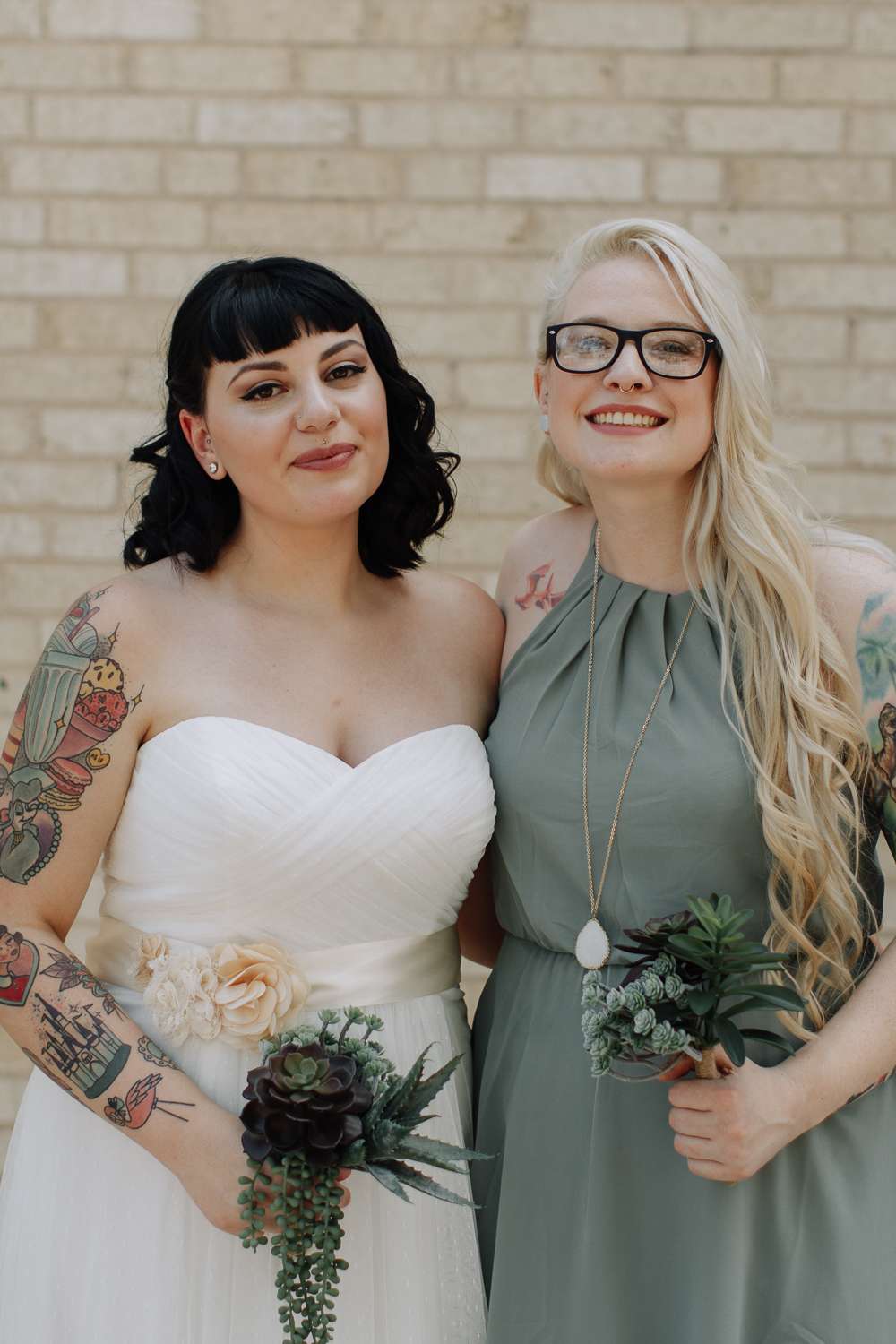 The bride wore a classic dress from David’s Bridal, which really showed off her gorgeous tattoos, while the groom’s suit and dapper bow tie were from JCPenney, and the bridesmaids all wore dresses from Francesca’s in shades that echoed the succulents and also the mint and lavender iced donuts they had at their brunch reception.