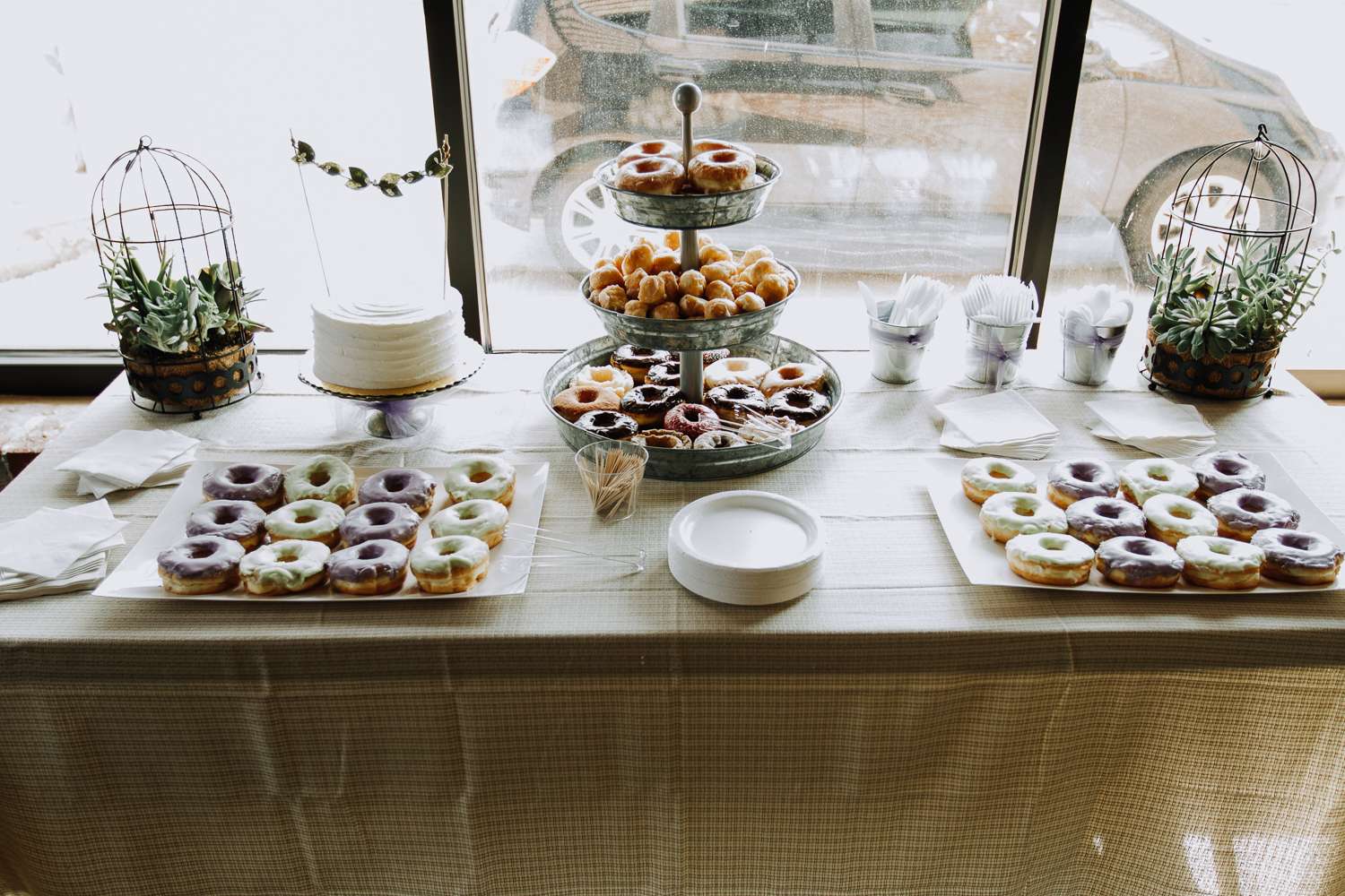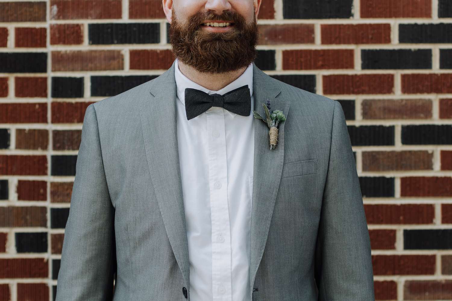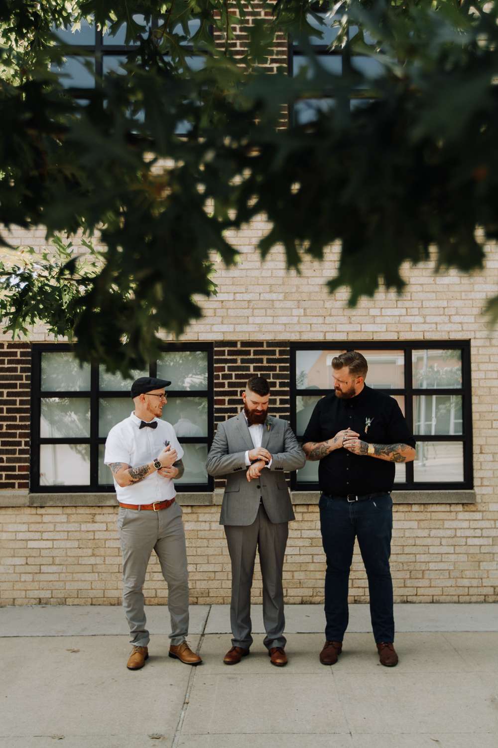 The bride wore a classic dress from David’s Bridal, which really showed off her gorgeous tattoos, while the groom’s suit and dapper bow tie were from JCPenney, and the bridesmaids all wore dresses from Francesca’s in shades that echoed the succulents and also the mint and lavender iced donuts they had at their brunch reception.