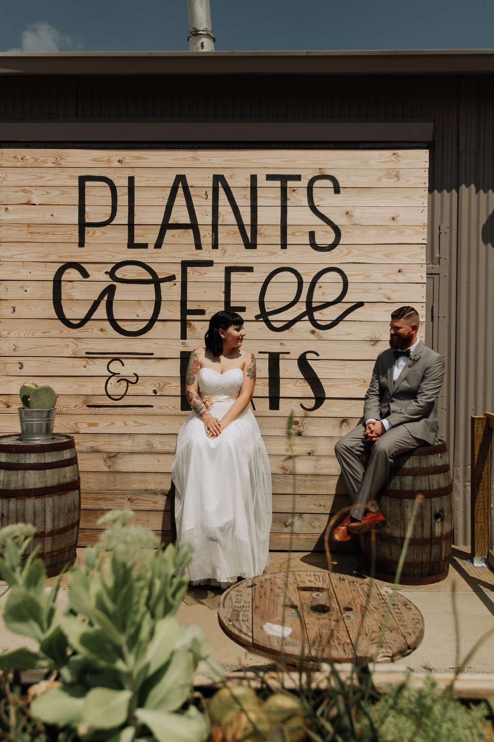 Photographer Robyn Icks said of the ceremony, “The small space filled quickly, a susurrus falling into silence as Raegan entered escorted by her father. She glowed, bright and lovely, and when Randy saw her he beamed too. Their song, Here Comes the Sun, was a perfect fit. After the ceremony, we crossed the street to take a few photos in front of The Plant Shoppe. The desert and succulents fit their theme, and I couldn’t resist taking advantage of their gorgeous outdoor space.”